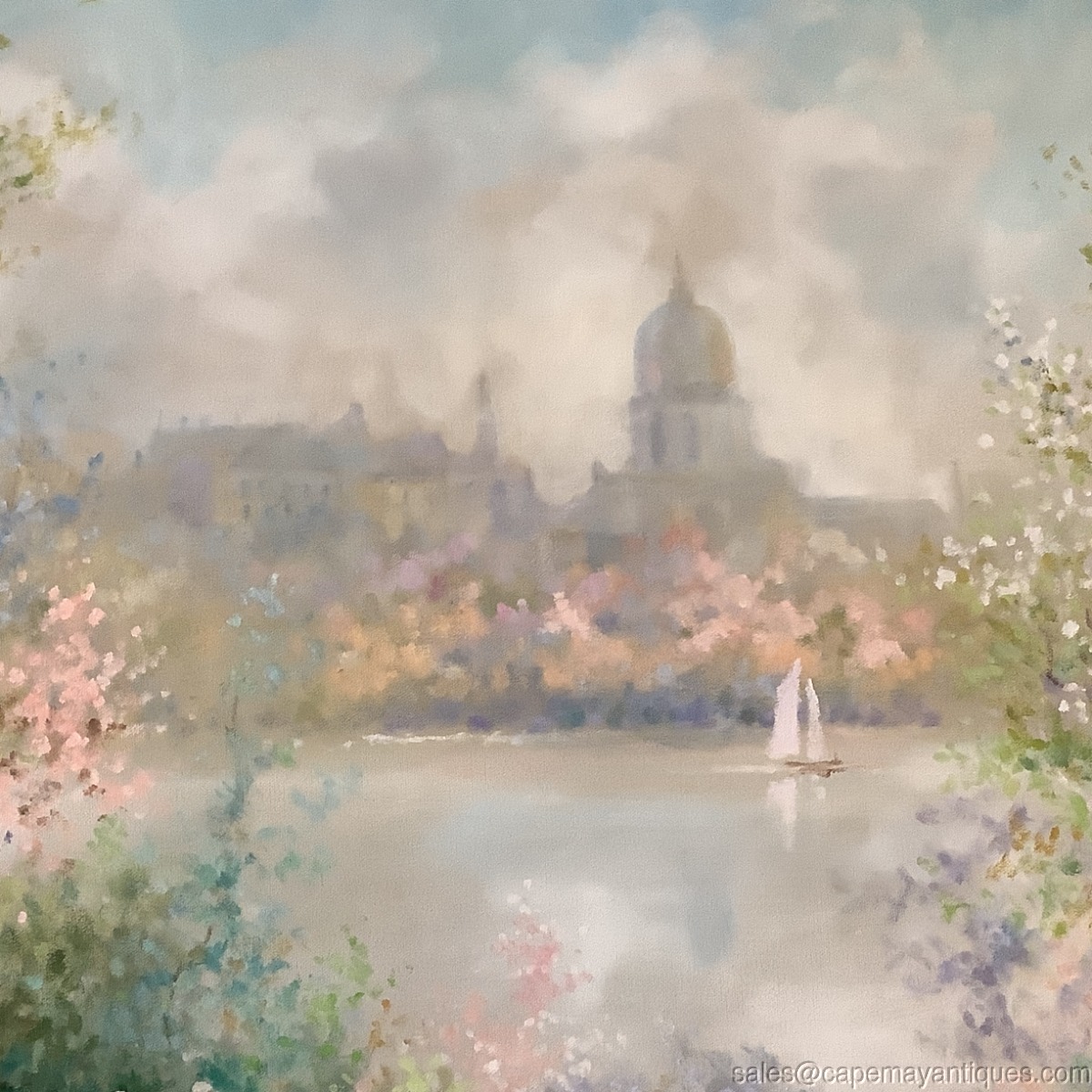 Oil Painting Pastel Late Spring European City Colorful Garden Pond w Boats 40x30