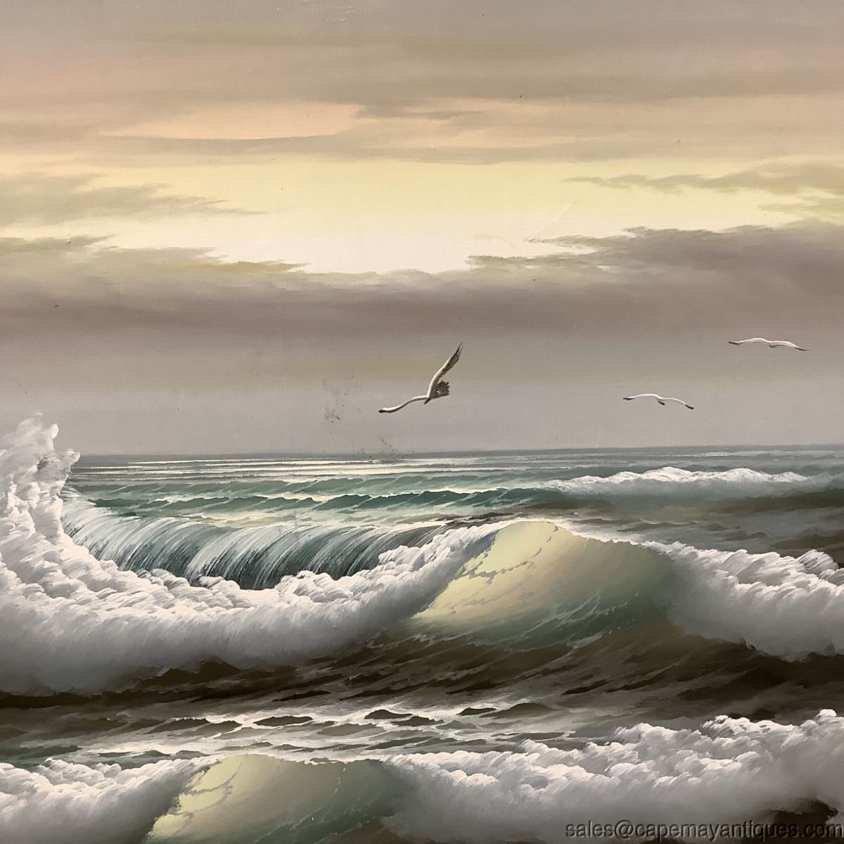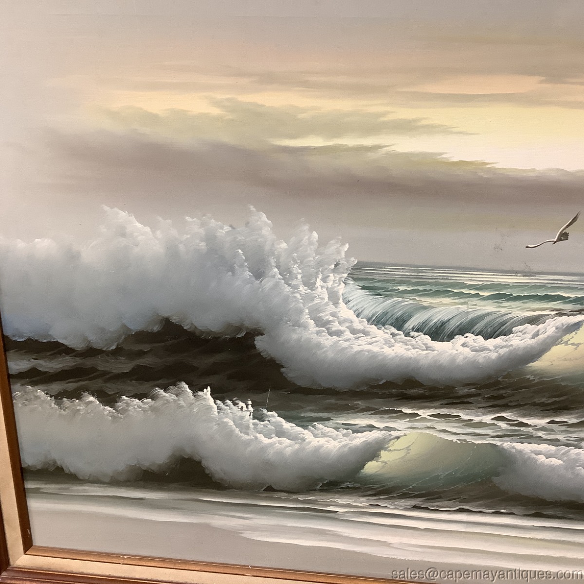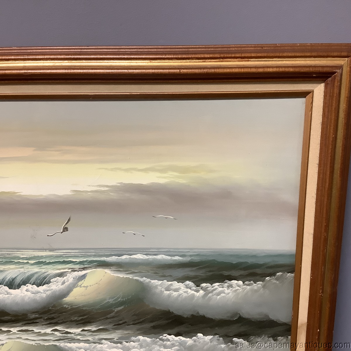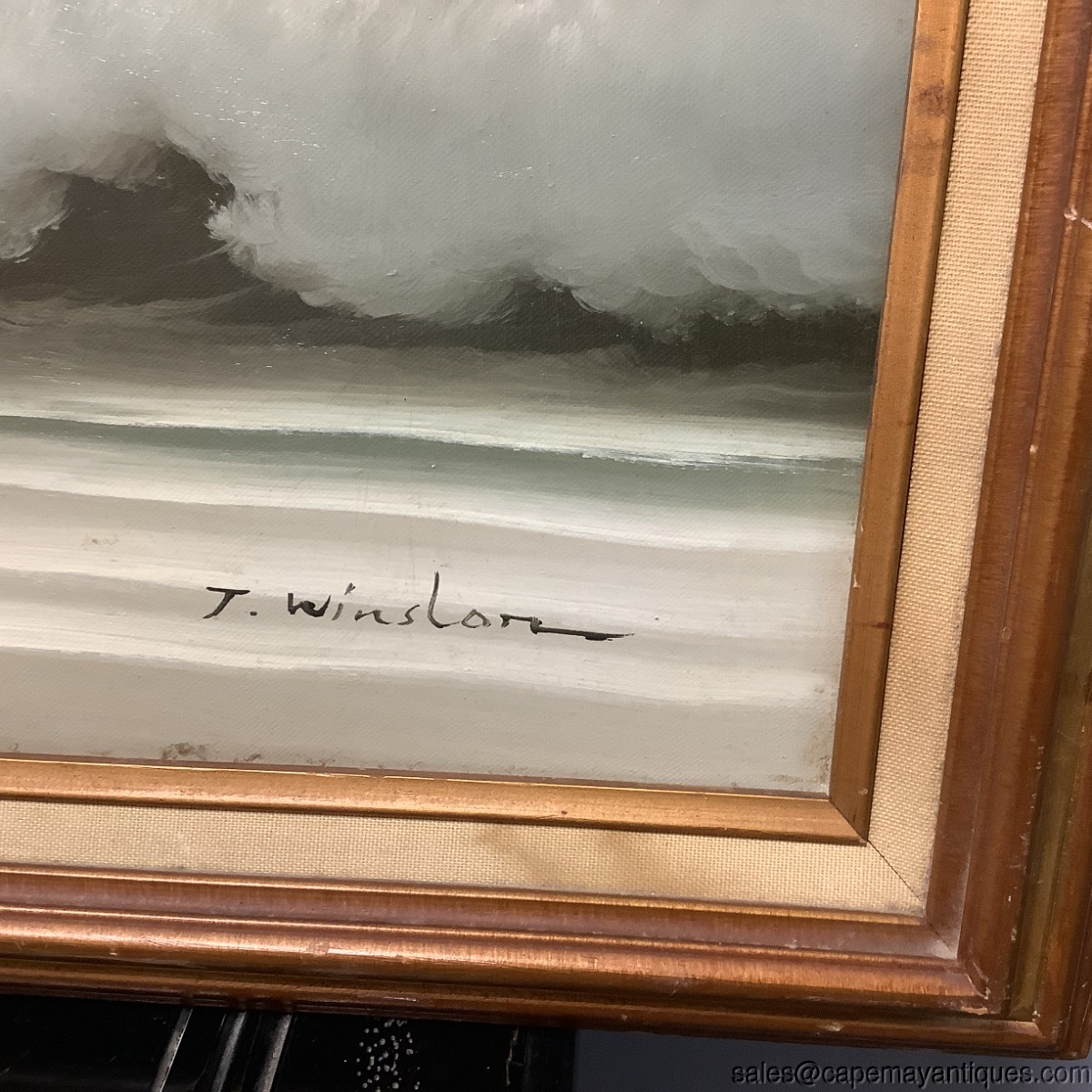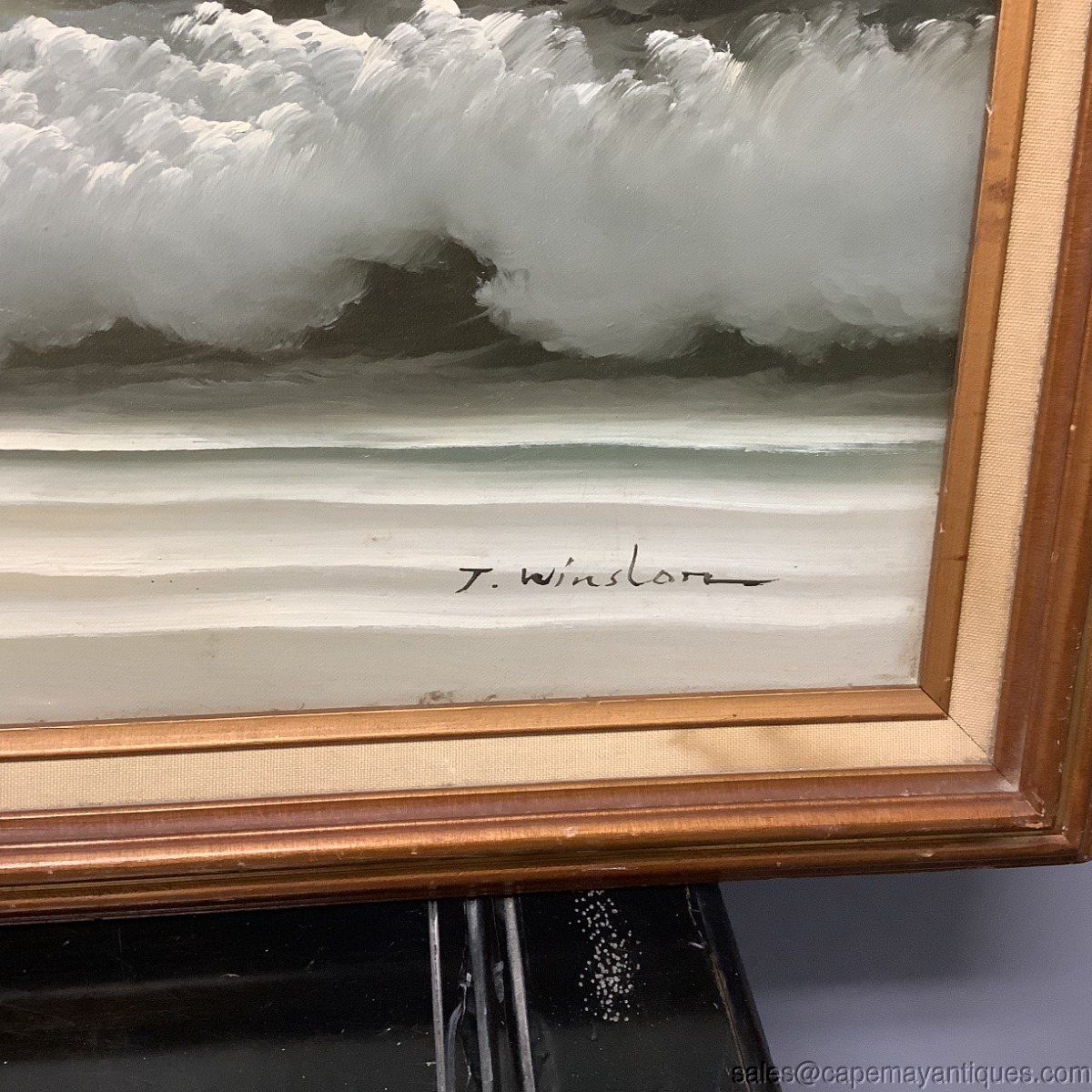 Vintage large oil painting featuring a beautiful seascape with crashing waves, so life like, a sun peaking through clouds as well as seagulls in flight over the water. The oil paining is signed either T. Winslow or J Winslow. MCM in age, mid century modern. Frame measures 41" L by 29" tall. The artwork is 3' by 2' and has a center wood backing due to size. Good clean condition overall, few minor marks near the flying seagull and in the upper left portion of the sky, simple thin whitish line. The linen lining of the frame is soiled here and there as well. No rips or wear to the canvas.