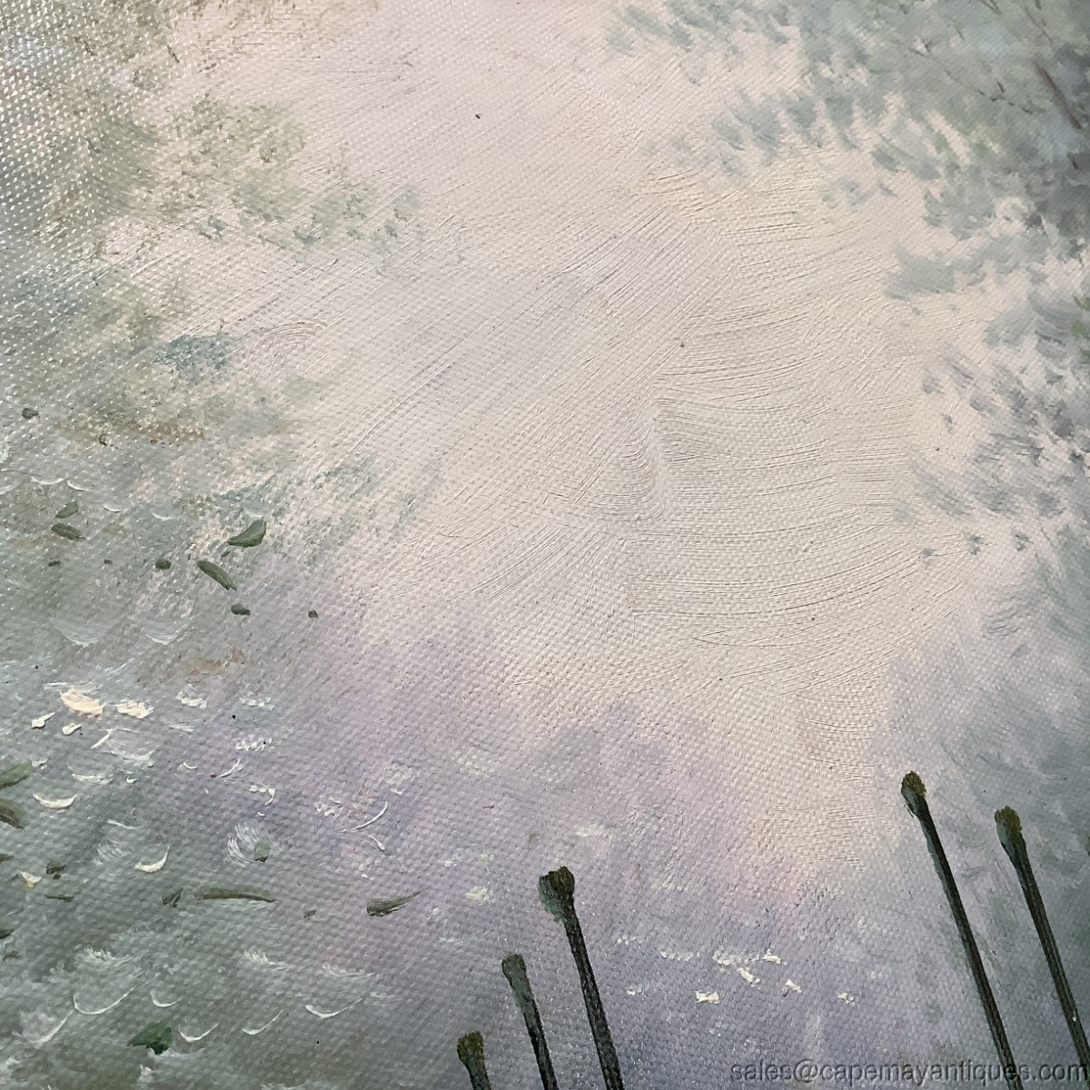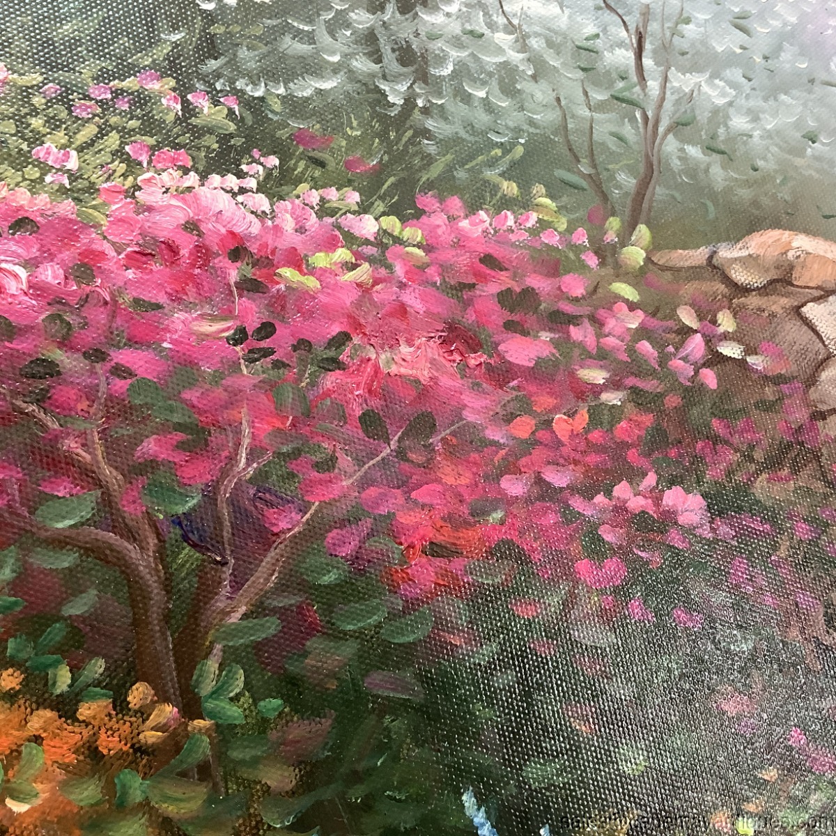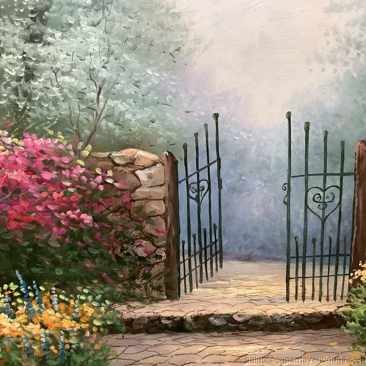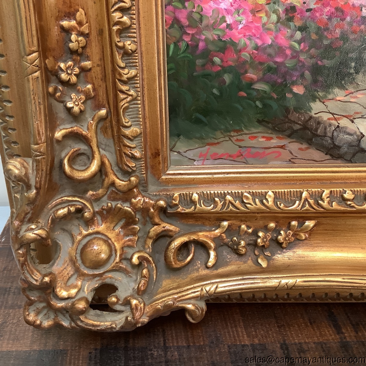 Such an enchanting large piece of artwork in gold frame. This is a print on canvas with actual paint brush strokes to make it appear as tough it is almost painted but it is a reproduced print. Very similar to a painting entitled The Garden of Promise by Thomas Kinkade. Large gold intricate gold frame, vintage in age measures 31" by 35" tall. This is a faux wood carving made from resin material. The canvas is 20" by 24". Signature bottom left hand corner is Henthers or Menther unsure. Artwork and frame are in good condition. No damage to the frame or the artwork.