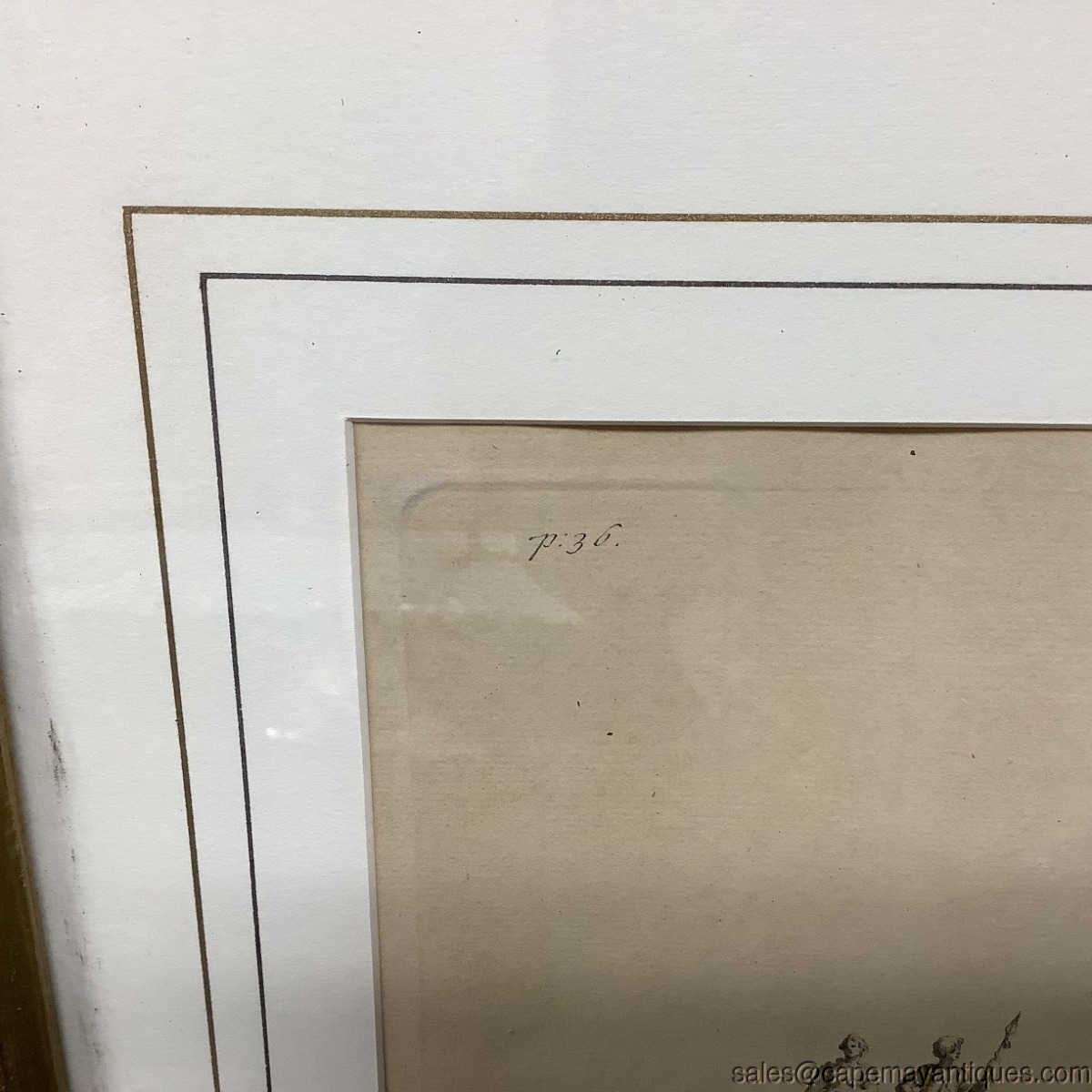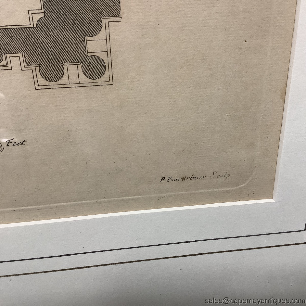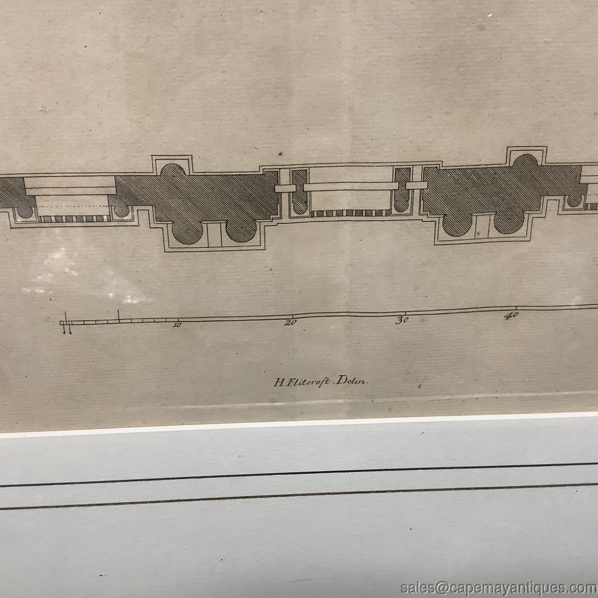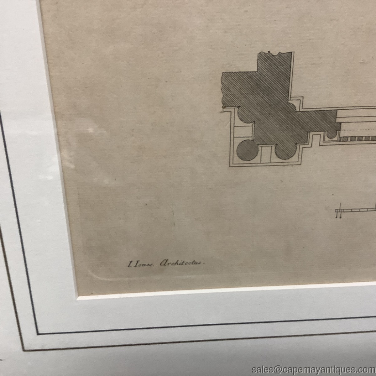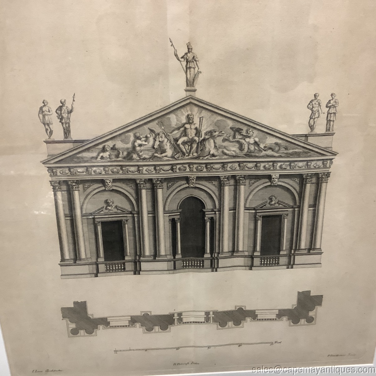 Copper engraving, I believe matted and under glass antique print by Inigo Jones Architect but also center marked H Flitcroft. The building is the map house. Gold wood frame measures 23" by 26" tall and the print is 15" by 15.25". There is a slight crease in the center depicting its removal or origin from a book, Vitruvius Britannicus. Upper corners read P 36 P 37. Scale at bottom shows up to 50'. Good clean condition under glass with the crease down the center as mentions. The gold frame was regilded by us as it was chippy and uneven. New finish as shown. The Frame is signed Made in Italy. Gorgeous!