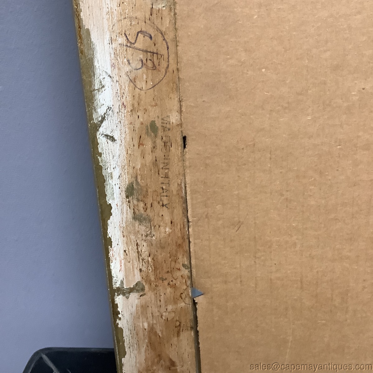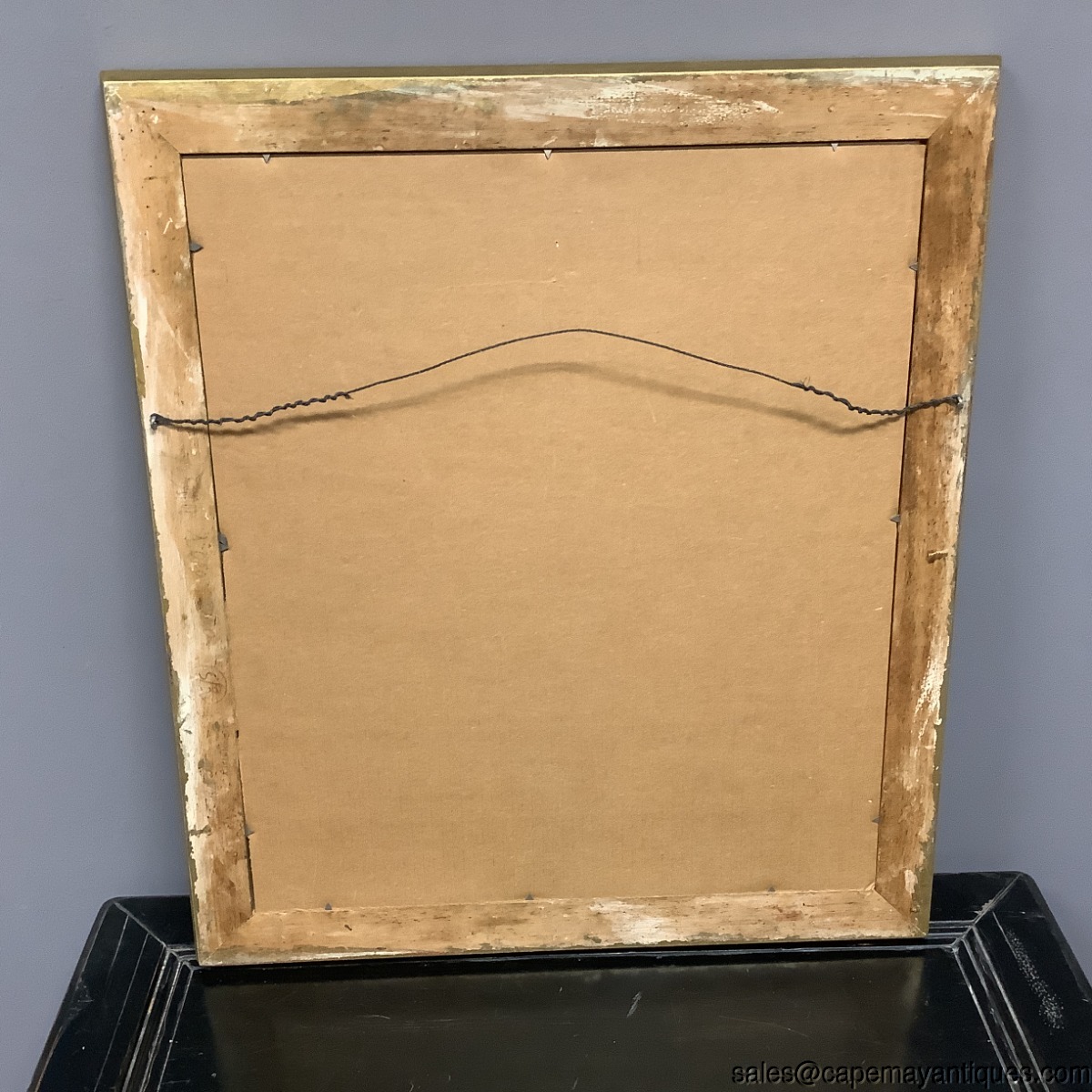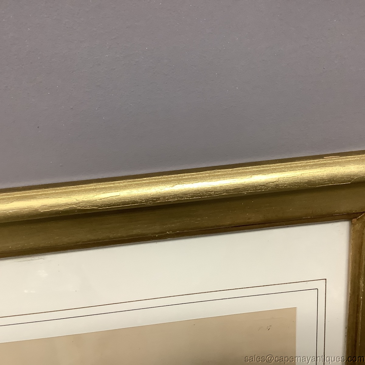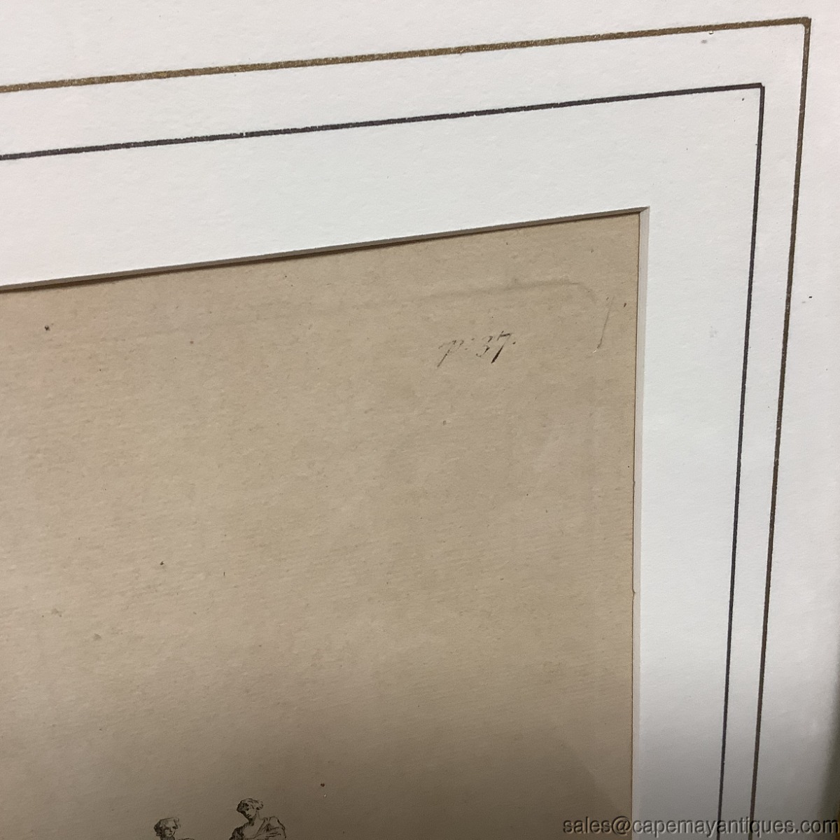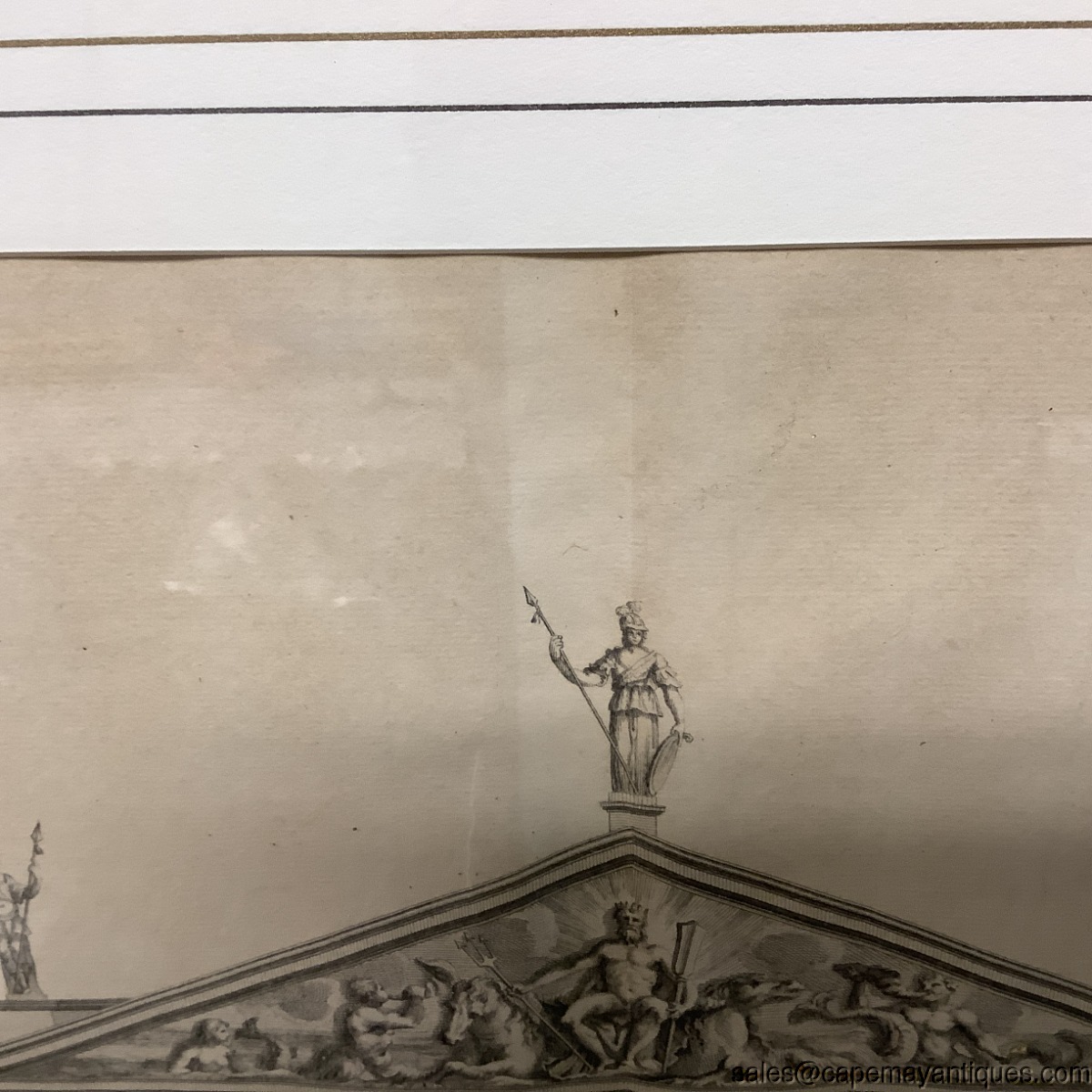 Copper engraving, I believe matted and under glass antique print by Inigo Jones Architect but also center marked H Flitcroft. The building is the map house. Gold wood frame measures 23" by 26" tall and the print is 15" by 15.25". There is a slight crease in the center depicting its removal or origin from a book, Vitruvius Britannicus. Upper corners read P 36 P 37. Scale at bottom shows up to 50'. Good clean condition under glass with the crease down the center as mentions. The gold frame was regilded by us as it was chippy and uneven. New finish as shown. The Frame is signed Made in Italy. Gorgeous!