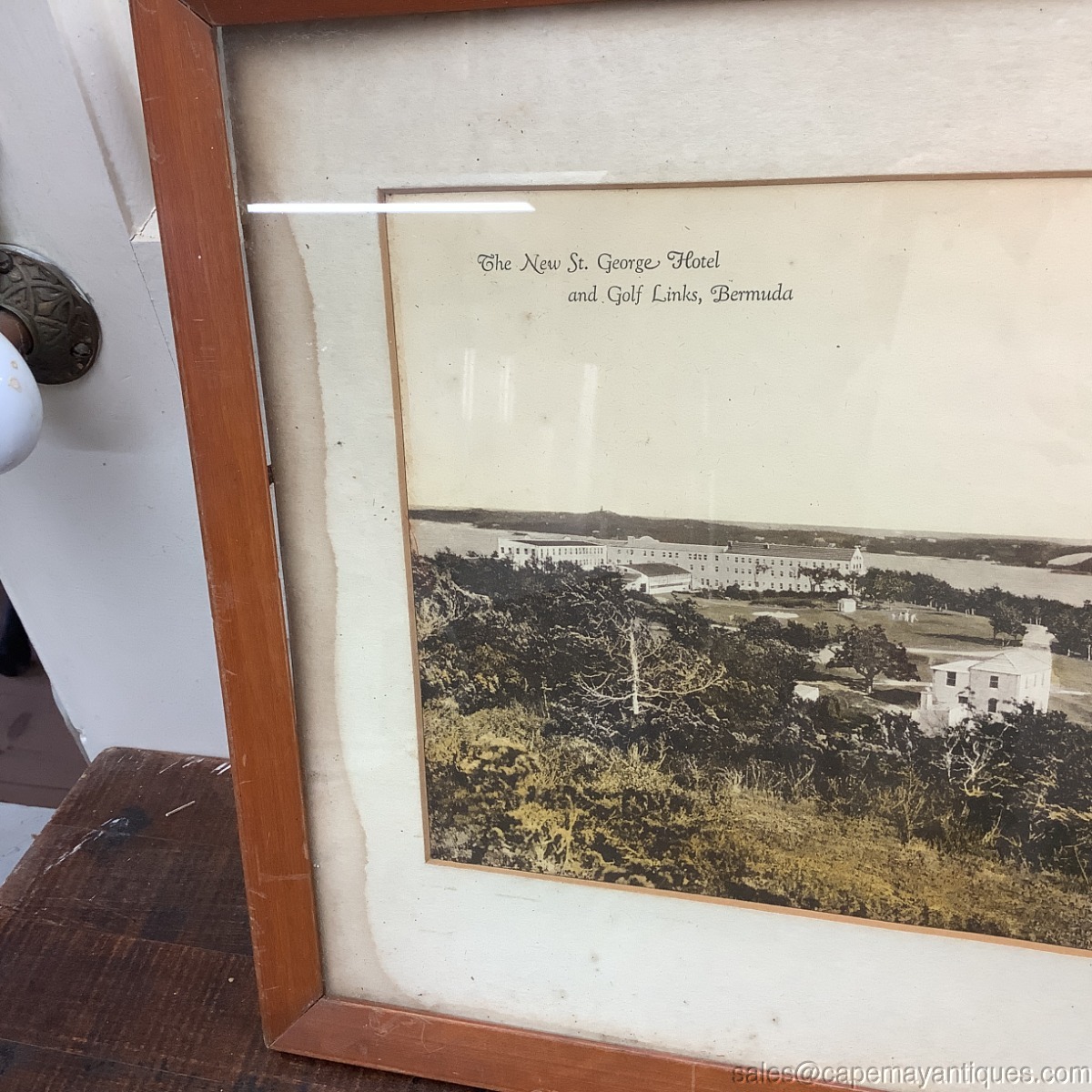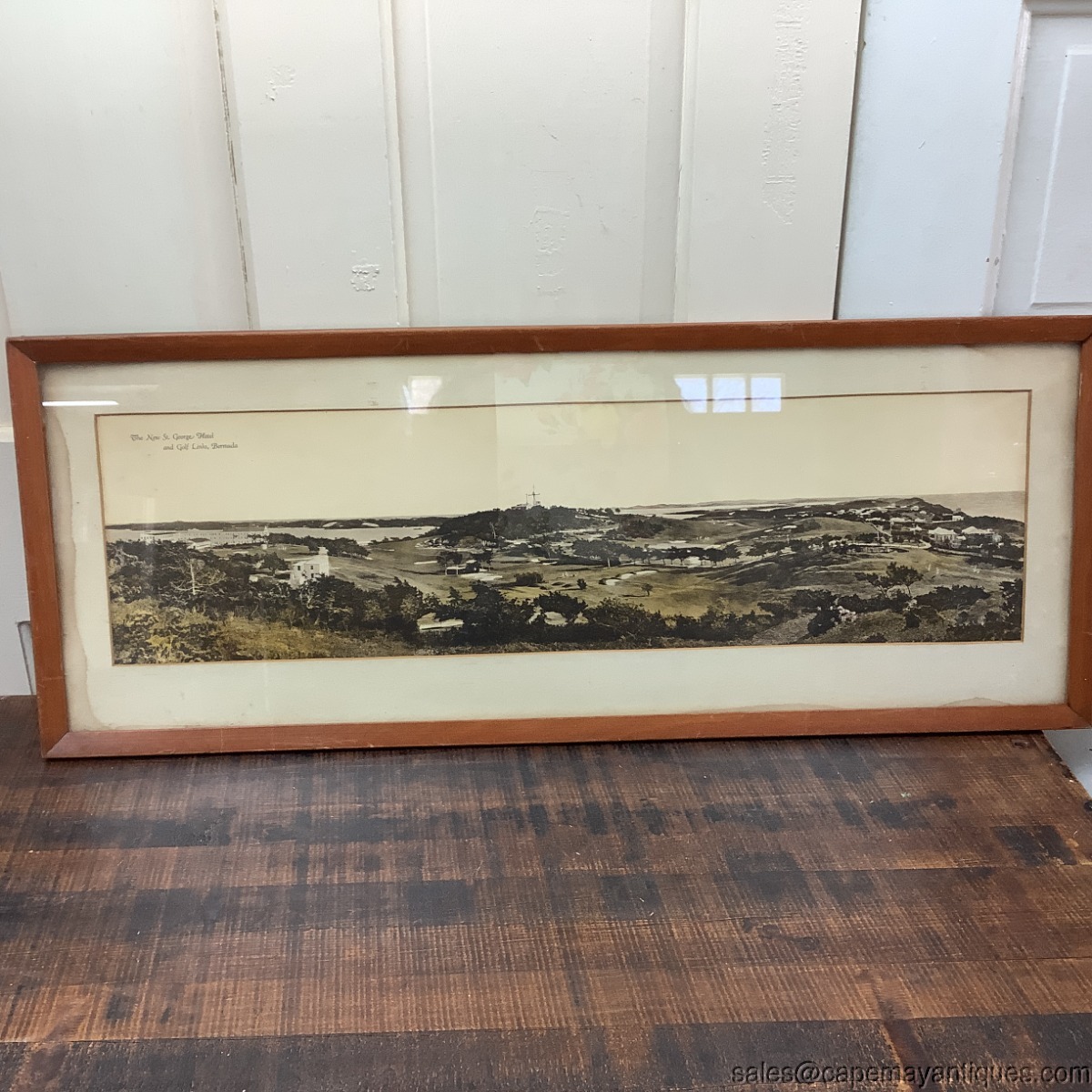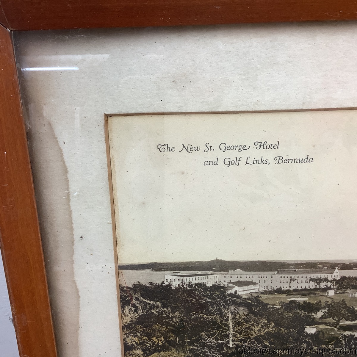 Great old, probably antique, large oblong original photograph or print of The New St. George Hotel and Golf Links, Bermuda. The print, which to me looks like a black and white photograph that was colorized. Large wood frame measures 32" length by 12.5" tall. The print or photograph is 27.5" by 7.5". The matting has water stains on left hand side as well as bottom right hand area. The photograph is not affected by the water stains. Appears to be in good condition protected under glass with no rips or tears. This is a great memorabilia piece from a hotel that was built in 1906 and torn down in the 1970s.
