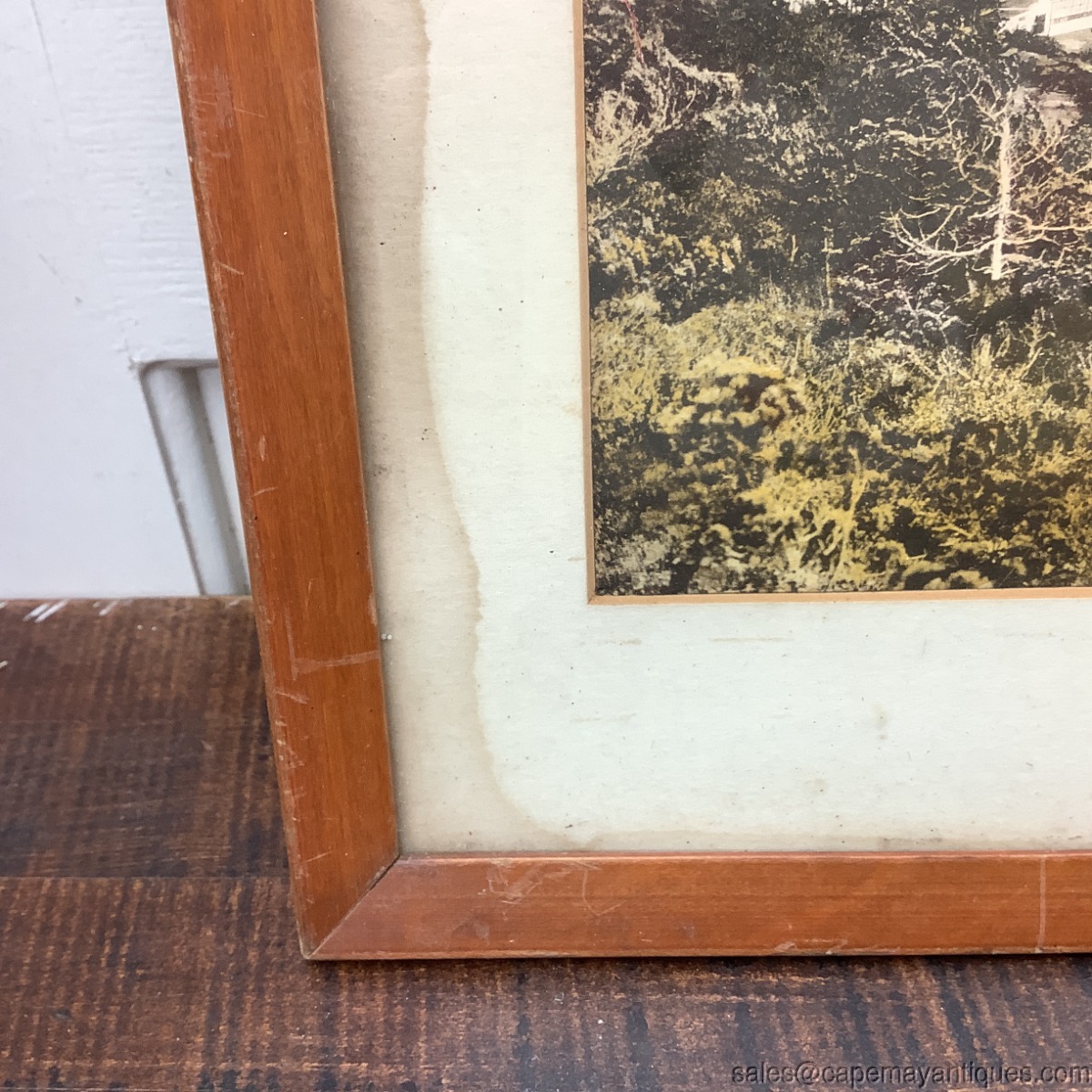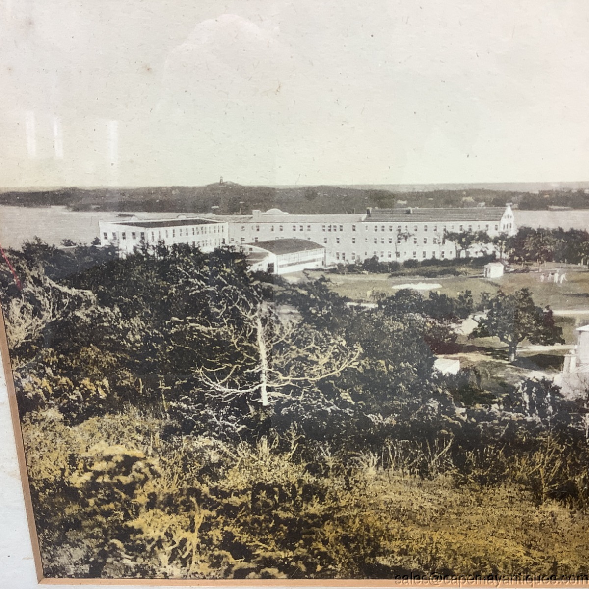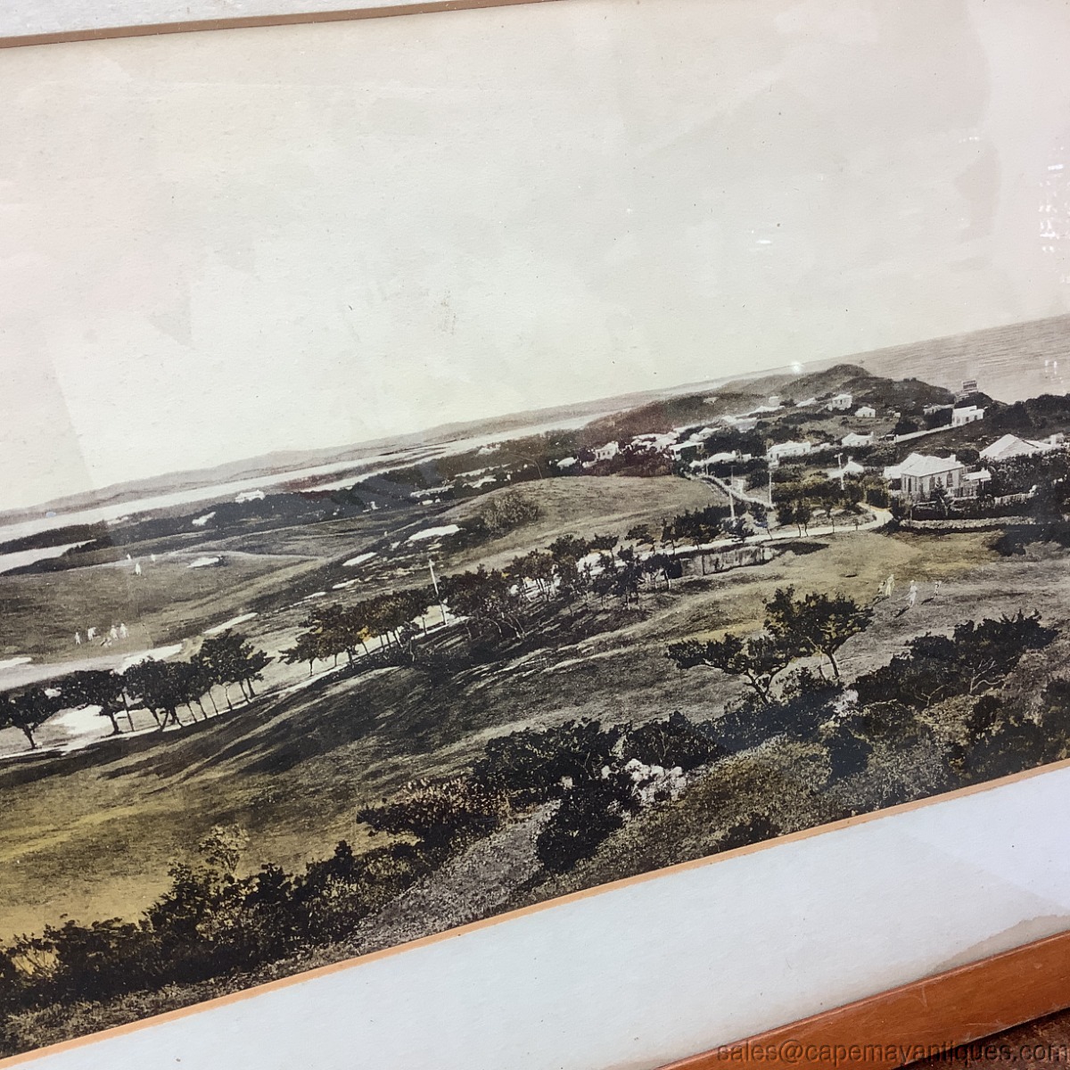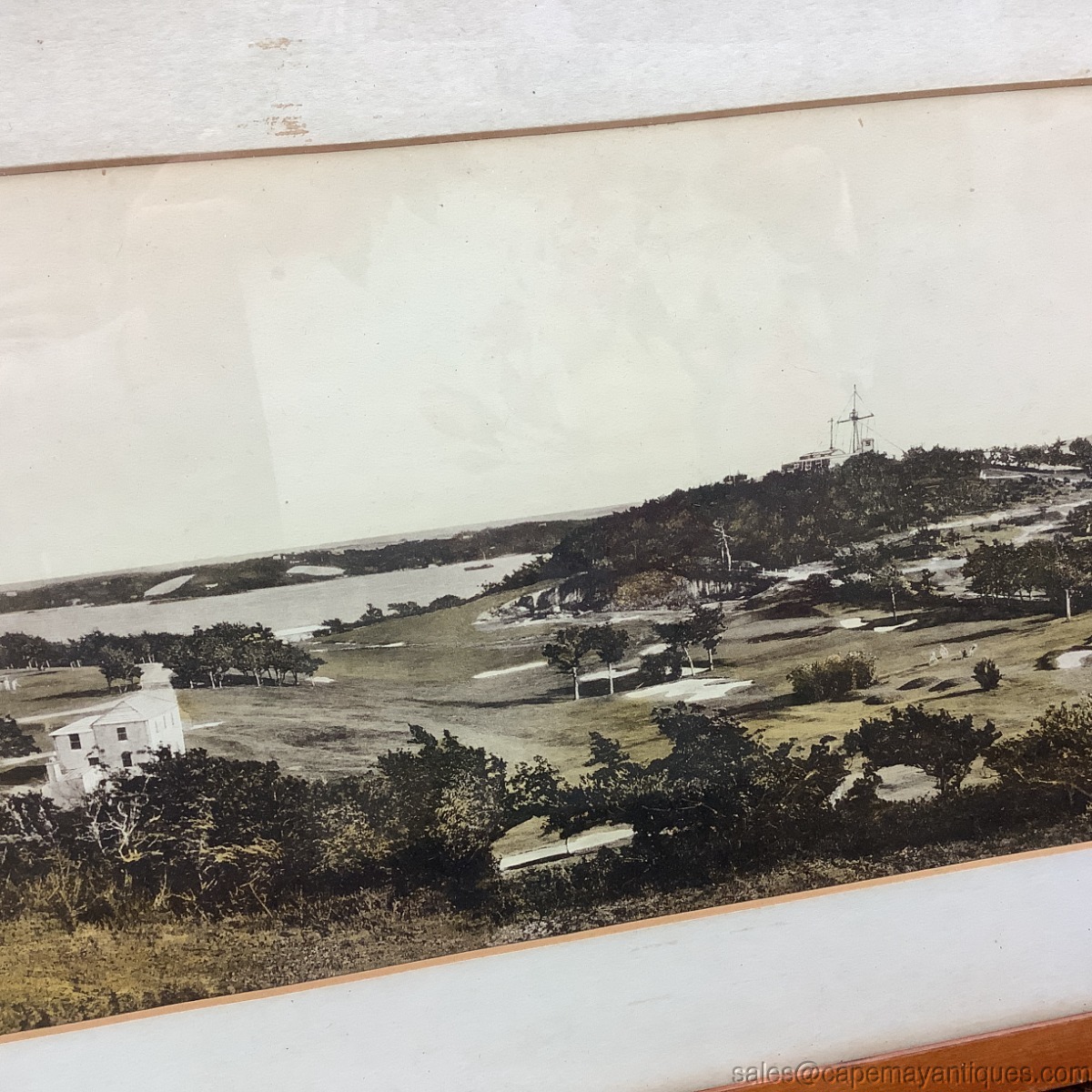 Great old, probably antique, large oblong original photograph or print of The New St. George Hotel and Golf Links, Bermuda. The print, which to me looks like a black and white photograph that was colorized. Large wood frame measures 32" length by 12.5" tall. The print or photograph is 27.5" by 7.5". The matting has water stains on left hand side as well as bottom right hand area. The photograph is not affected by the water stains. Appears to be in good condition protected under glass with no rips or tears. This is a great memorabilia piece from a hotel that was built in 1906 and torn down in the 1970s.