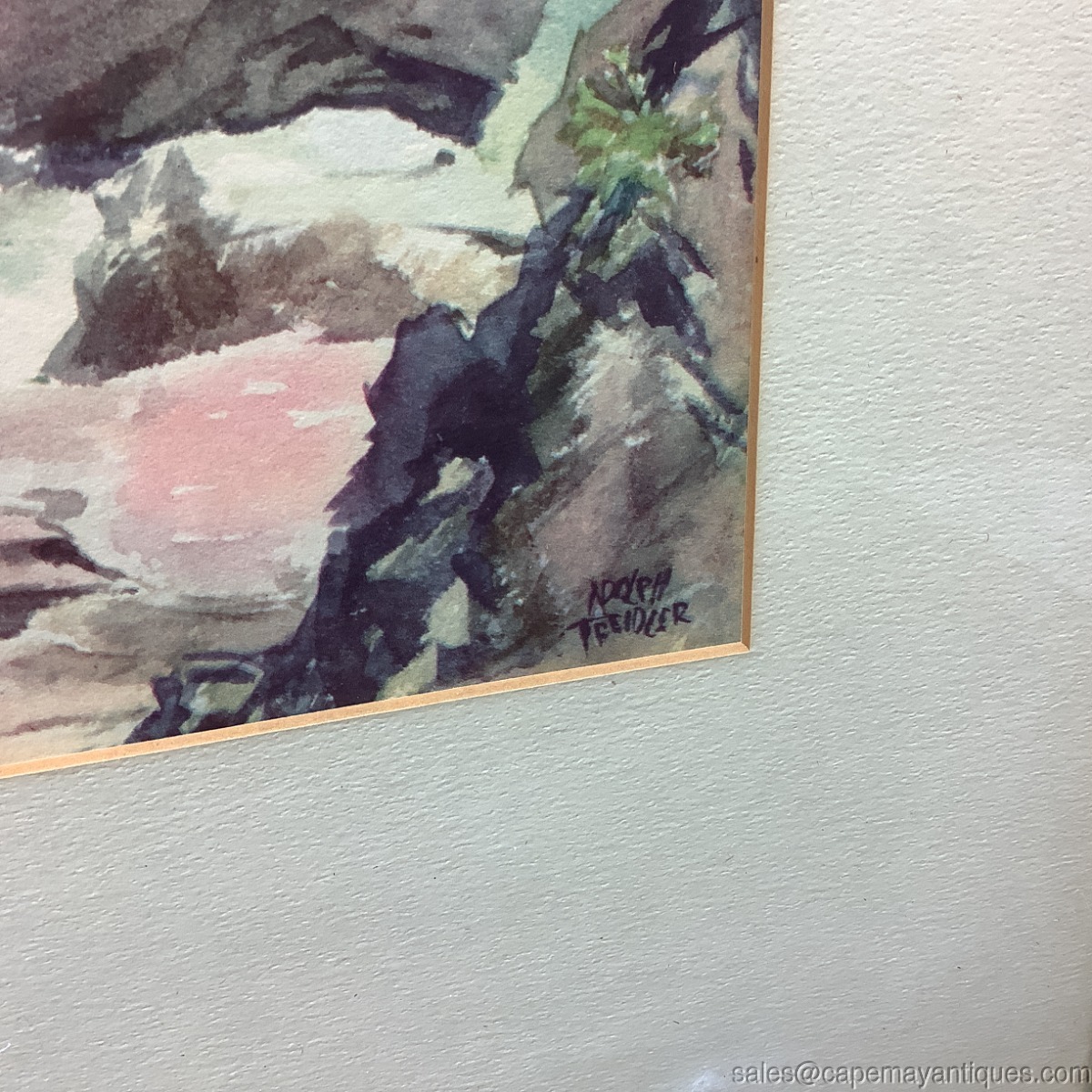 Wonderful vintage print of original watercolor painting by Adolph Treidler who is know for his work for the Board of Tourism for Bermuda. His illustrations are well known and collectible. This watercolor print is from 1940s to 1950s in age. Framed and matted with frame measuring 18" by 16" and the artwork that is revealed within the matting is 11" by 8". The print is in good condition protected under glass. This is probably the original matting, frame and glass. The frame shows some signs of age including a few nicks and marks. Stunning print!