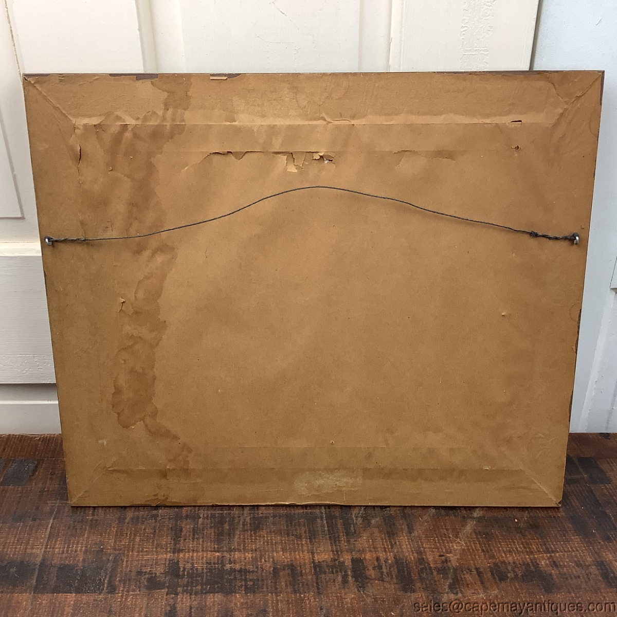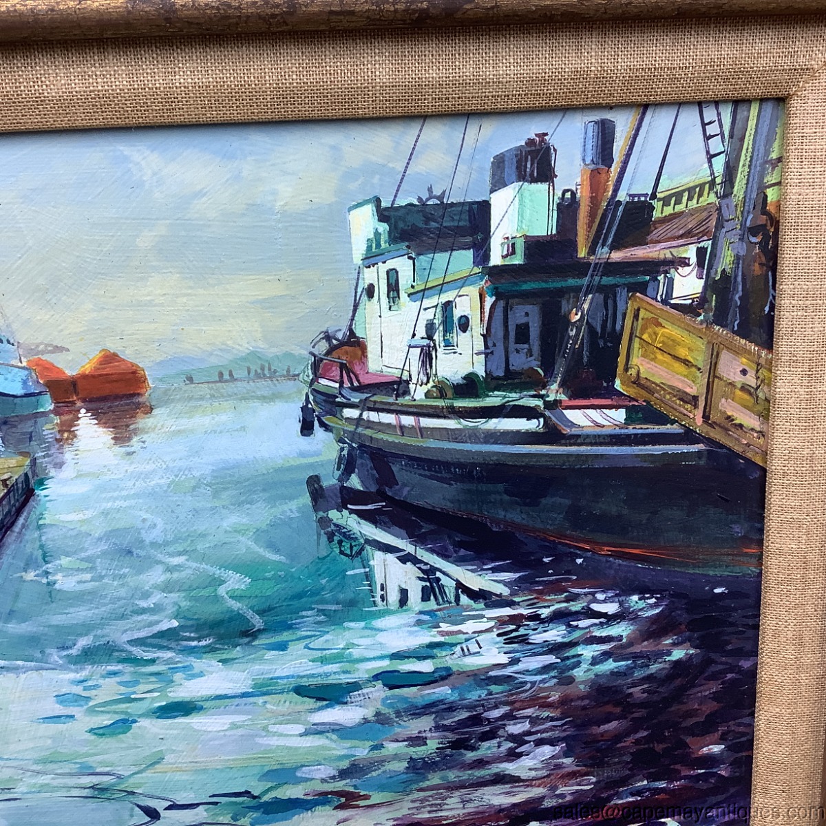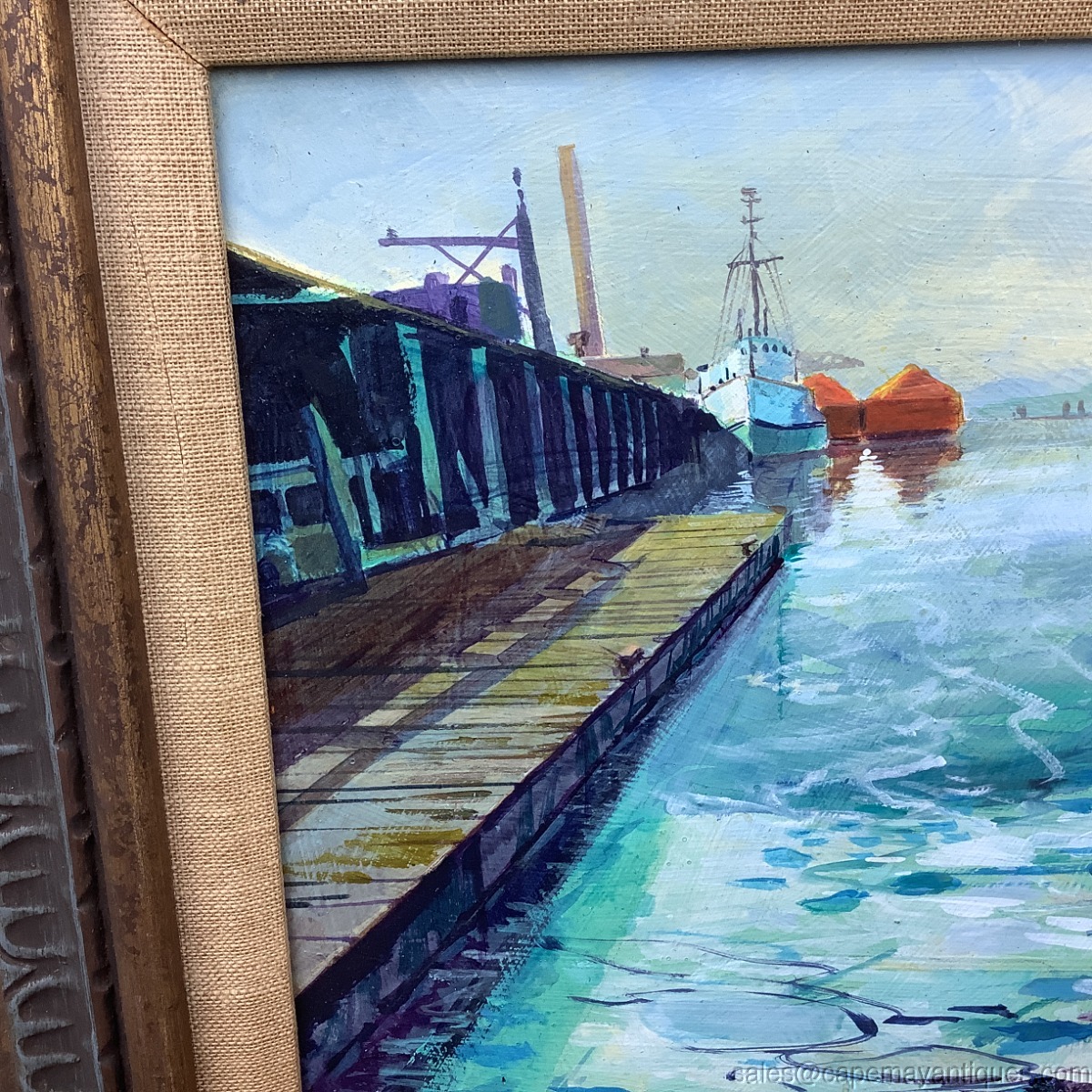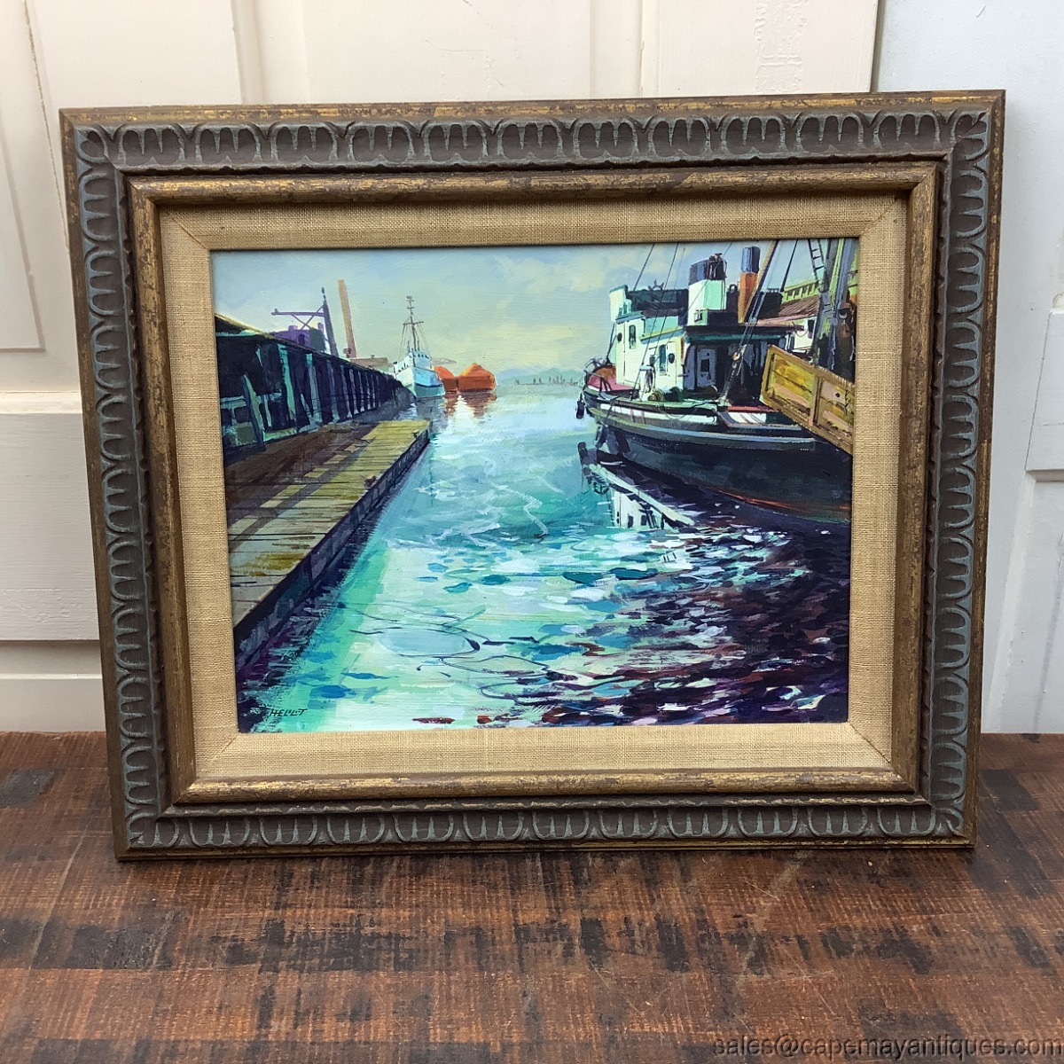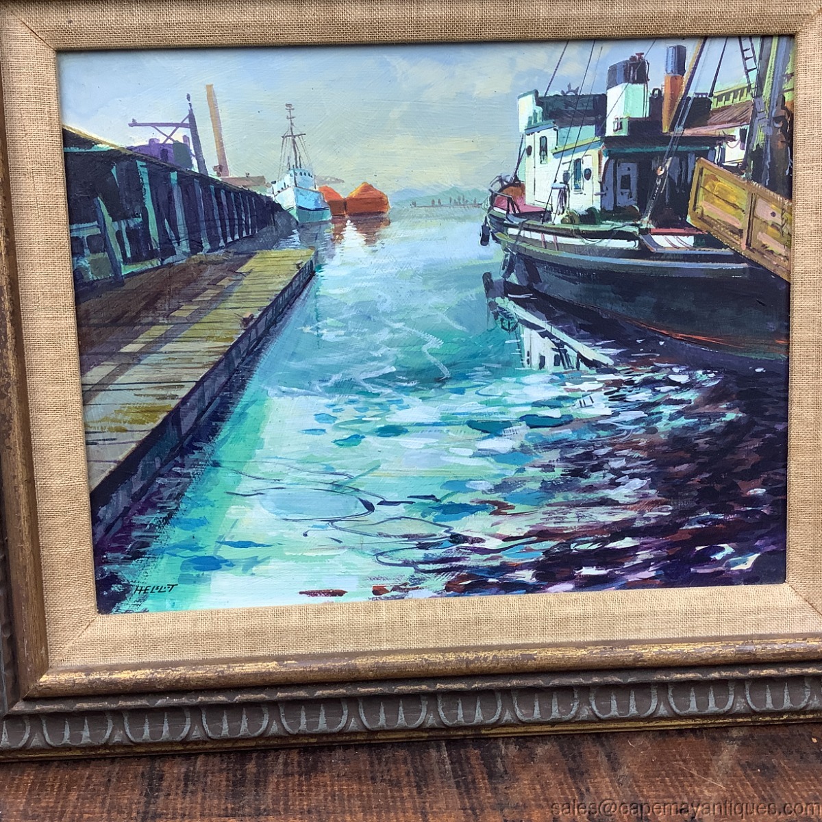 Signed bottom left hand corner Helsloot in small and large characters, which could identify this as a Dutch painting. The dark wood gold accent with linen lining frame measures 19" by 16". The canvas is 14" by 10". Lovely bright shades of blue, turquoise, blue waters while portions are dark and dramatic, ie under the dock section and nearby the bottom of the forefront fishing boat. Captures the scene quite nicely with dramatic accents. Good condition with no damage to the canvas, paper backing has some marks and rips. Wood frame is in good condition with typical wear from natural lighting etc. Nice MCM vibe too.