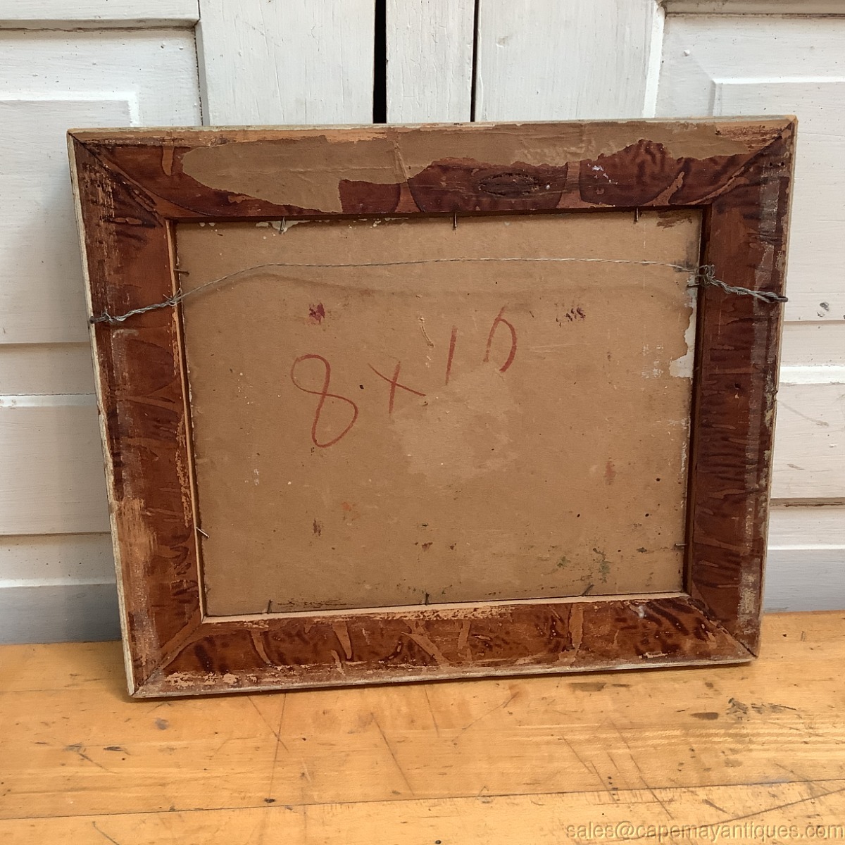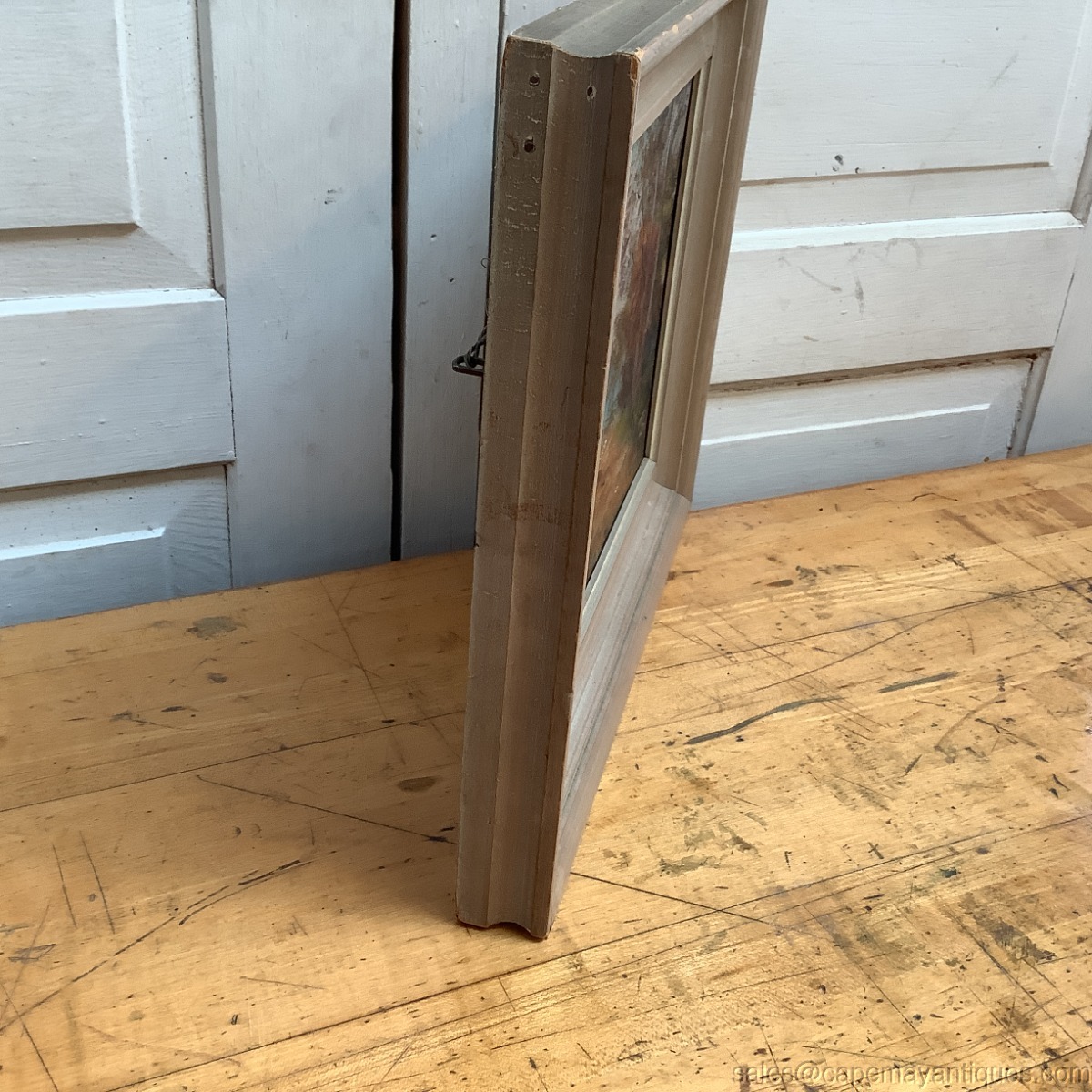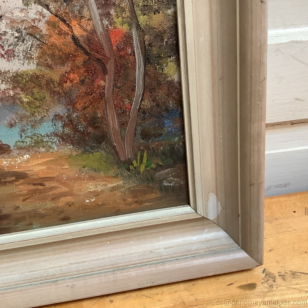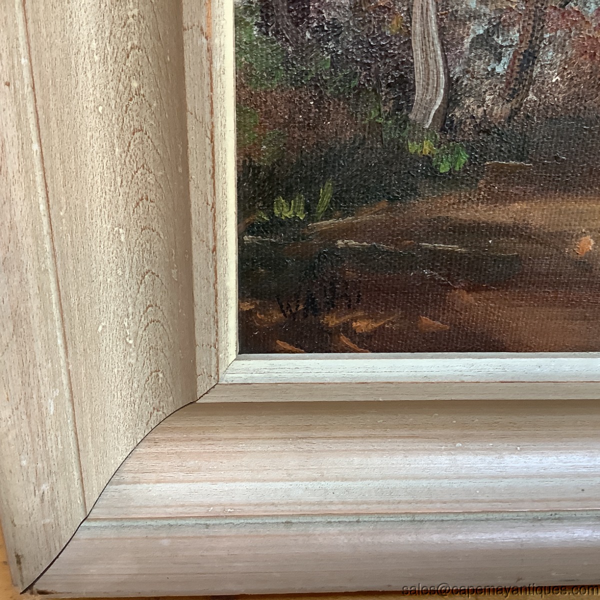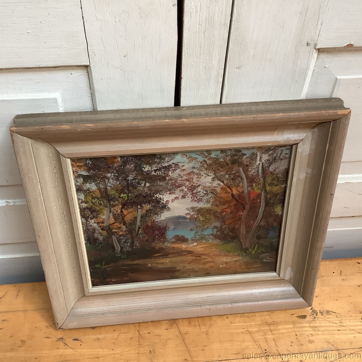 Signature bottom left hand corner, I believe it reads Ward or Wand. Thick wood frame measures 13" by 11" tall. The artist board is 8" by 10". Lovely fall or autumn landscape scene with lovely shades of range, green and amber colored leaves. There is water in the background and perhaps a mountain. Damage includes some lightening of the frame in upper right corner and right hand lower corner, plus some typical wear to the finish of the frame top and corner sections. The painting has some minor loss of color showing slightly white in the center and bottom off center section. See photos. No scratches, tears etc.