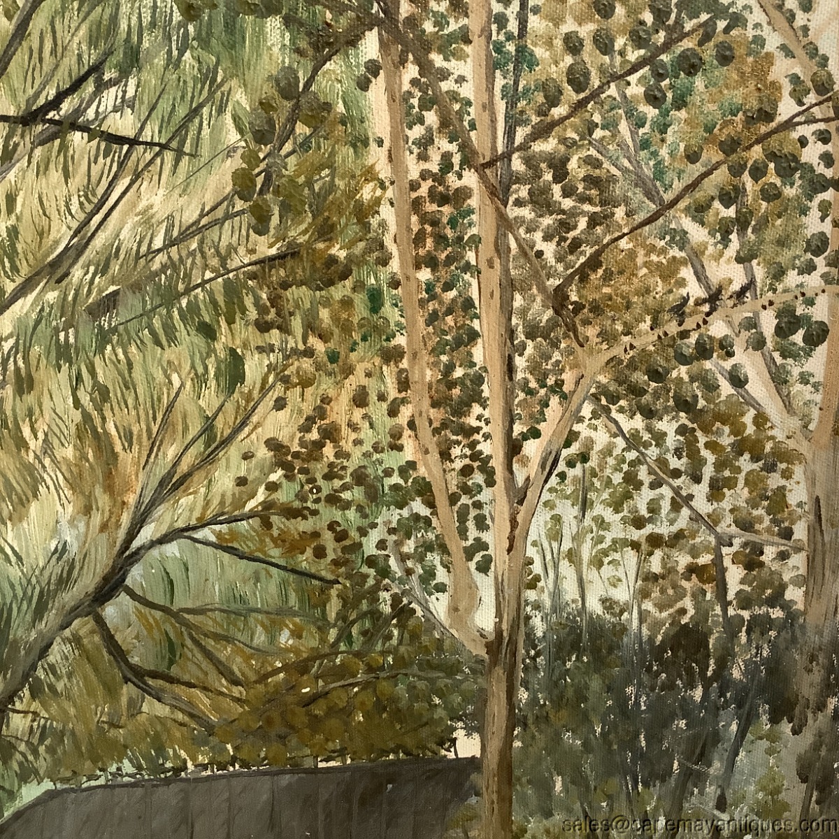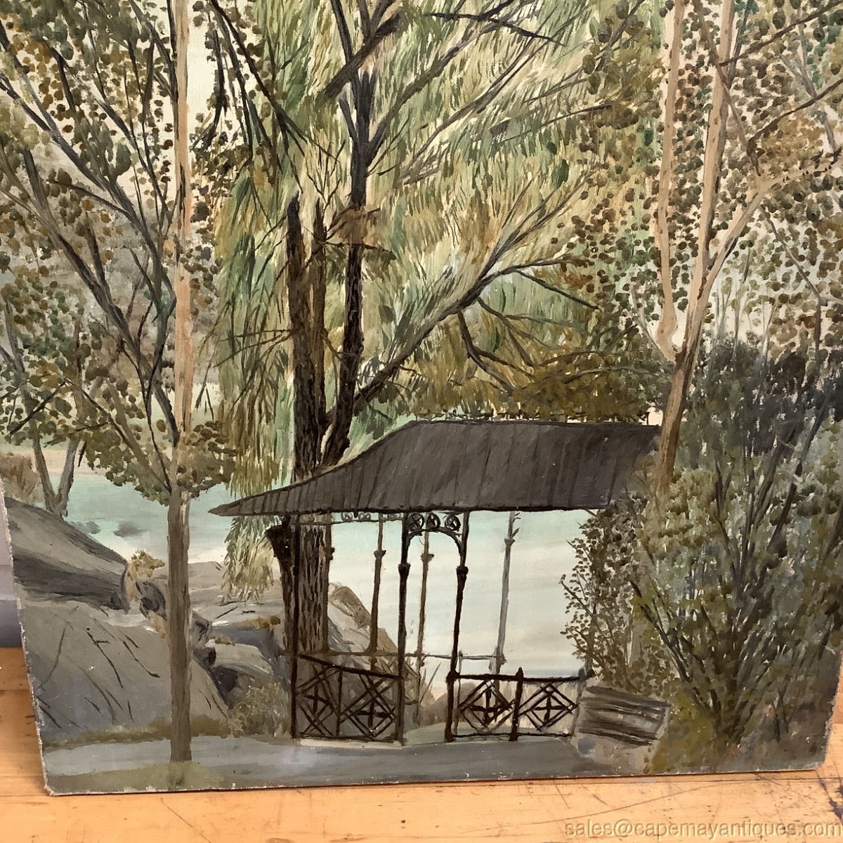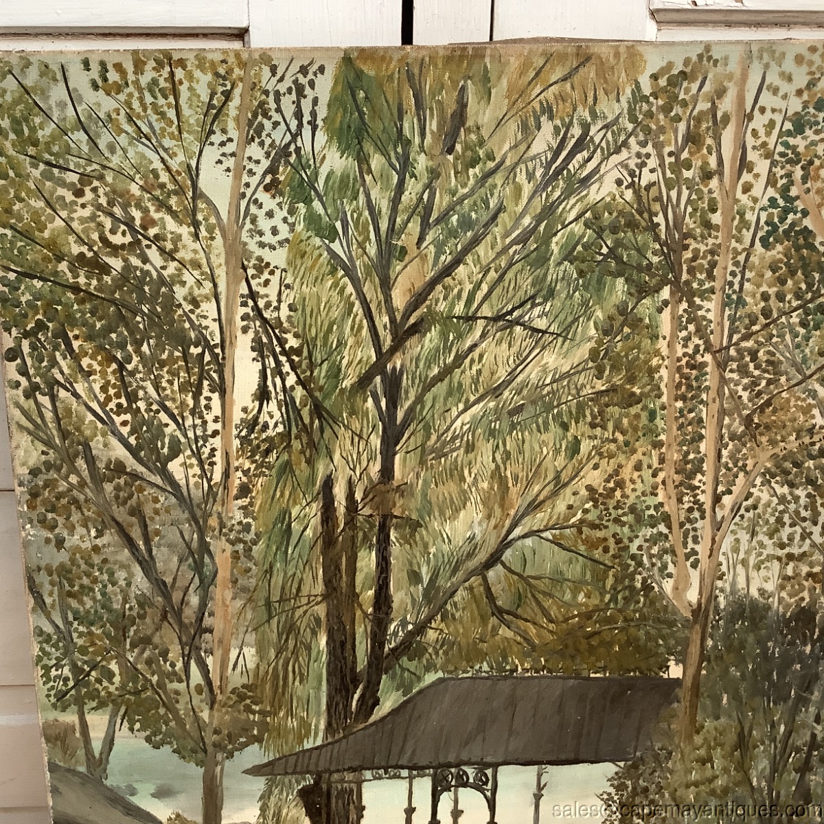 Vintage Oil Painting Landscape Tall Trees Old Style Gazebo w Pond Lovely Greens