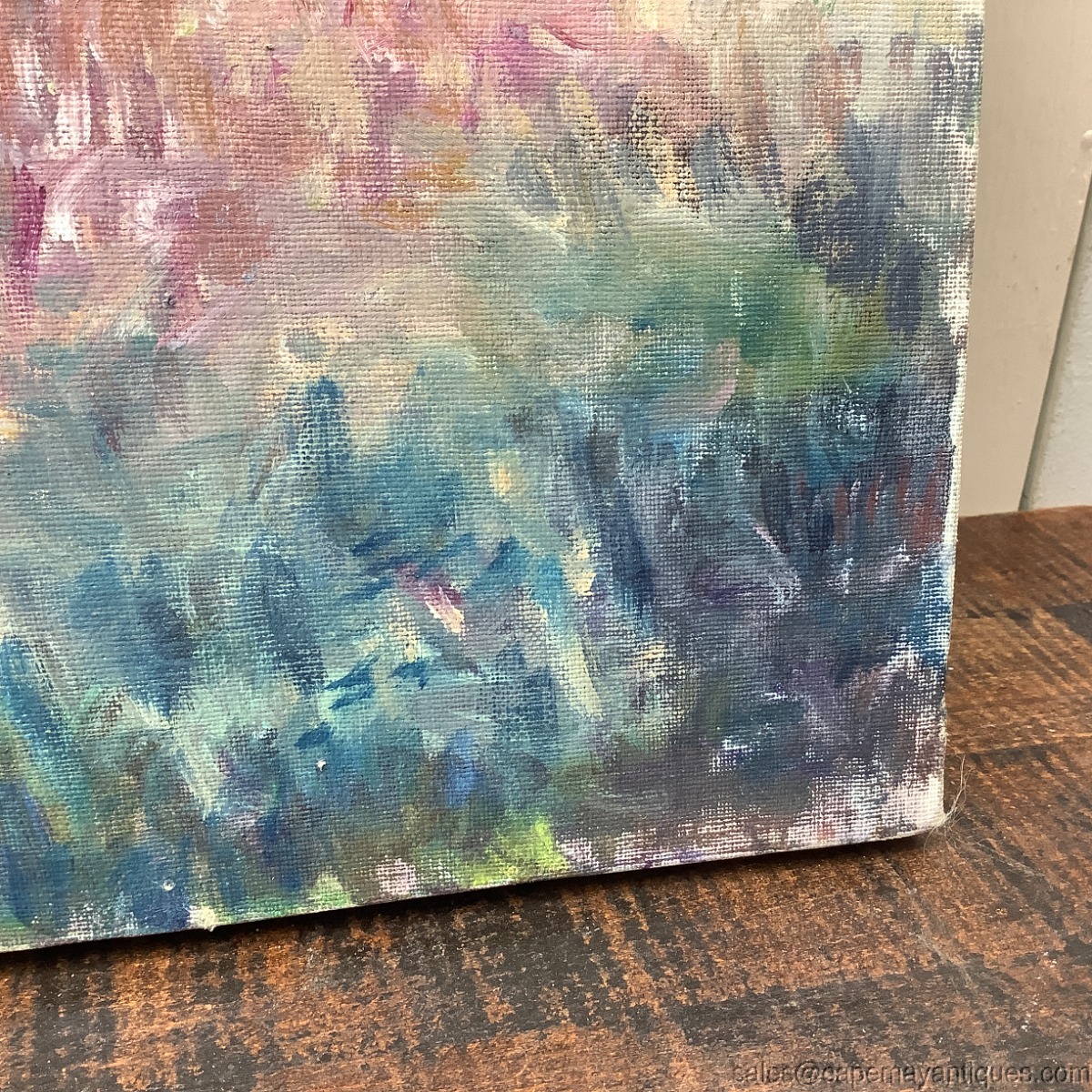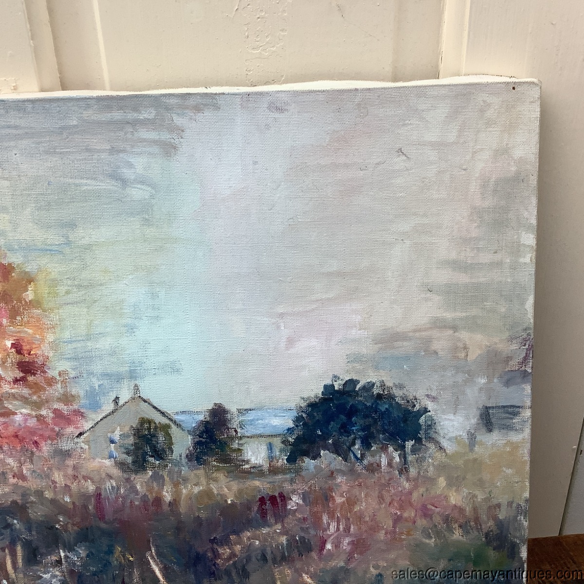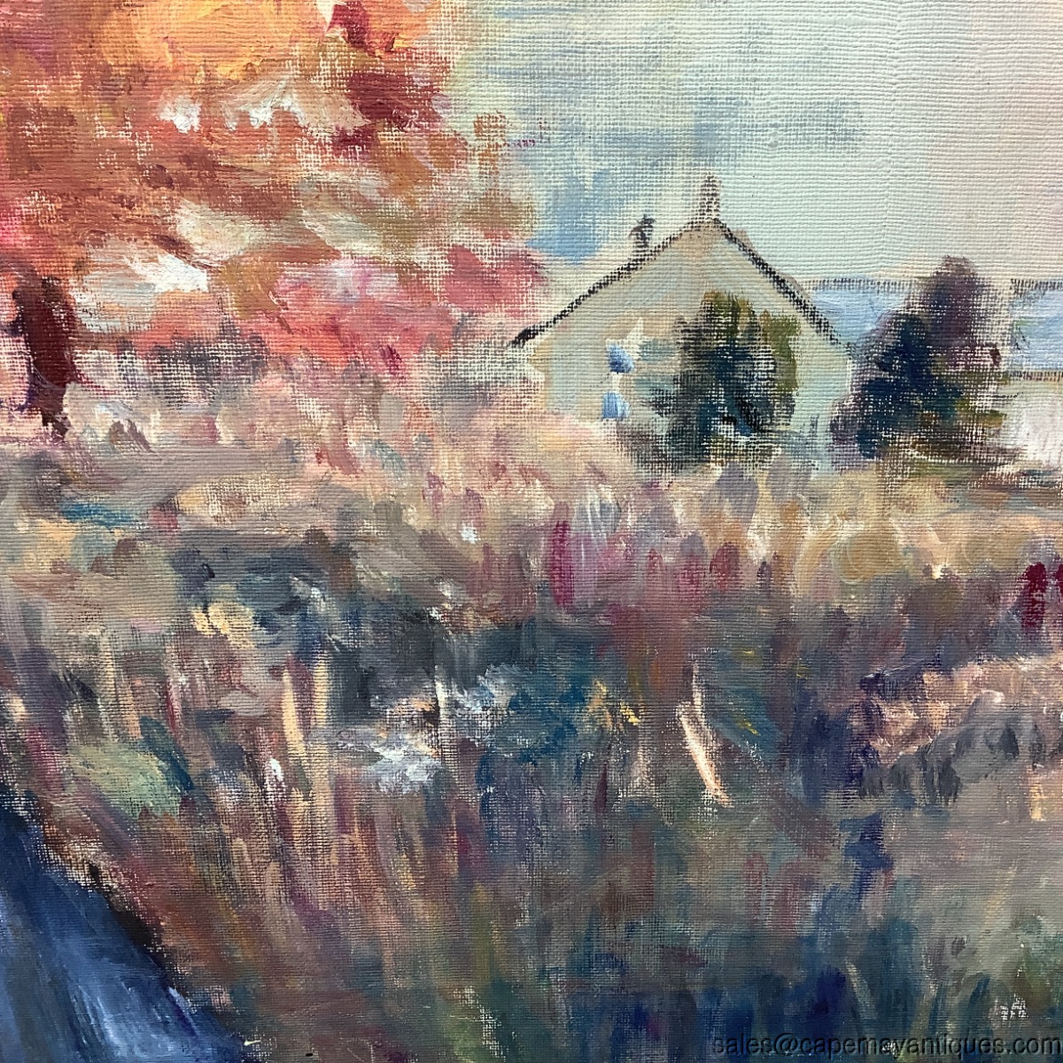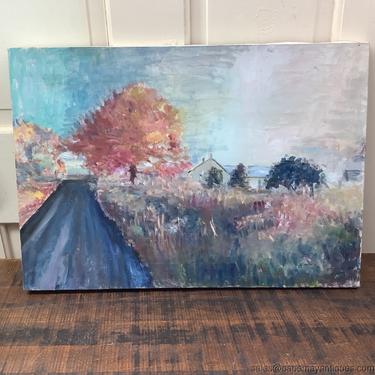 Unsigned, oil painting on canvas. Vintage in age. Measures 20" by 14" tall. A nice simple farmhouse scene, peaceful, colorful and autumnal in character. Good condition with no damage. Unframed.