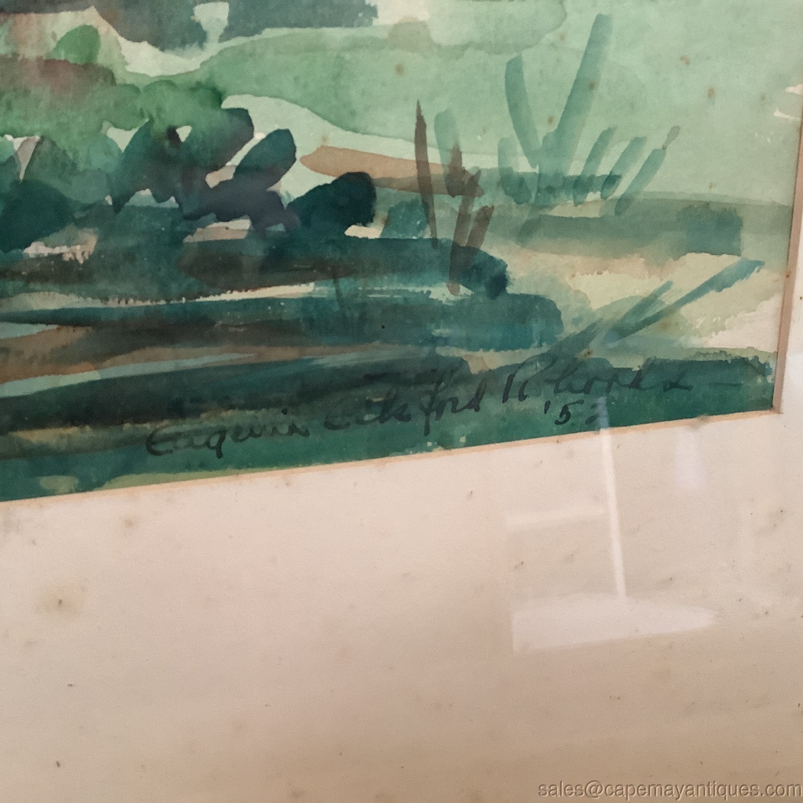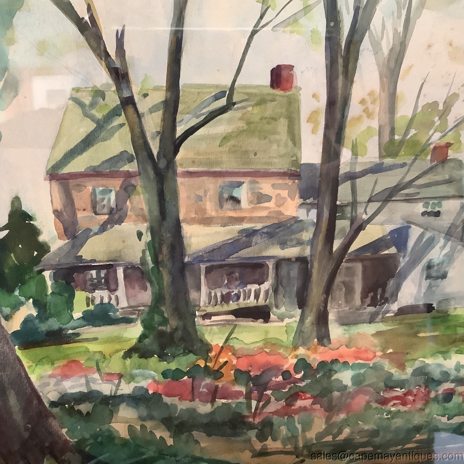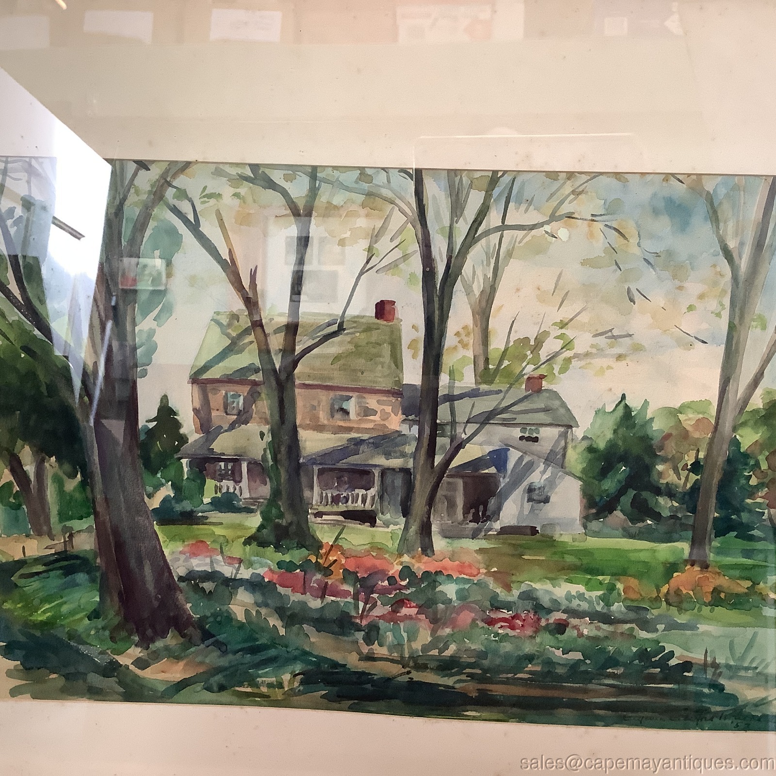 Gorgeous water color painting signed Eugenia Eckford Rhoades, 1952. Large wood frame measures 30" by 24", artwork is 21" by 14". Set under glass so artwork is protected. There are signs of foxing on the matting, ie dirt and spots under the glass. No rips or tears in the artwork. Gorgeous peaceful old farmhouse set with large trees, flowers in the foreground. Probably near Chads Ford PA. 20th C, Wilmington DE listed artist. Wonderful collectible water color.