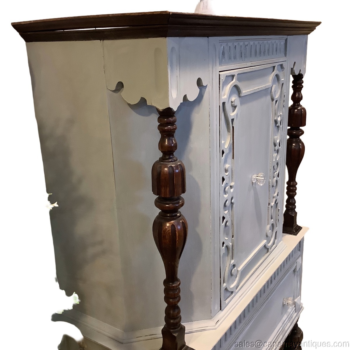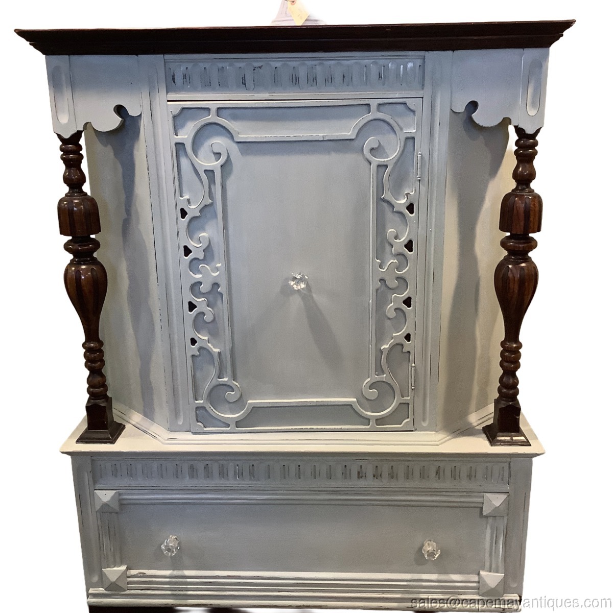 Gorgeous solid wood china, storage cabinet or bar cabinet with closed storage and lower drawer. Gorgeous wood carvings that we accented with light distressing while leaving dark wood accents unpainted as way to accentuate the beautiful form, style and carvings of the cabinet. Pretty clear glass knobs are in place for the center door and bottom drawer. 38" wide by 18" deep and 64.5" tall. The interior has a stationary shelf that allows for 16" height on bottom and 13" tall top shelf area. Both are 15" deep. Great for bar storage, bottles, glasses etc. We use and sell Annie Sloan Chalk Paint. The color is Paris Gray and we finished her with white wax. Very good condition overall. Slight separate left hand side top trim that we had to re-install and there is a sliver of light and opening in that area. See images on the side. Otherwise, really solid, good, clean condition. No smells etc.