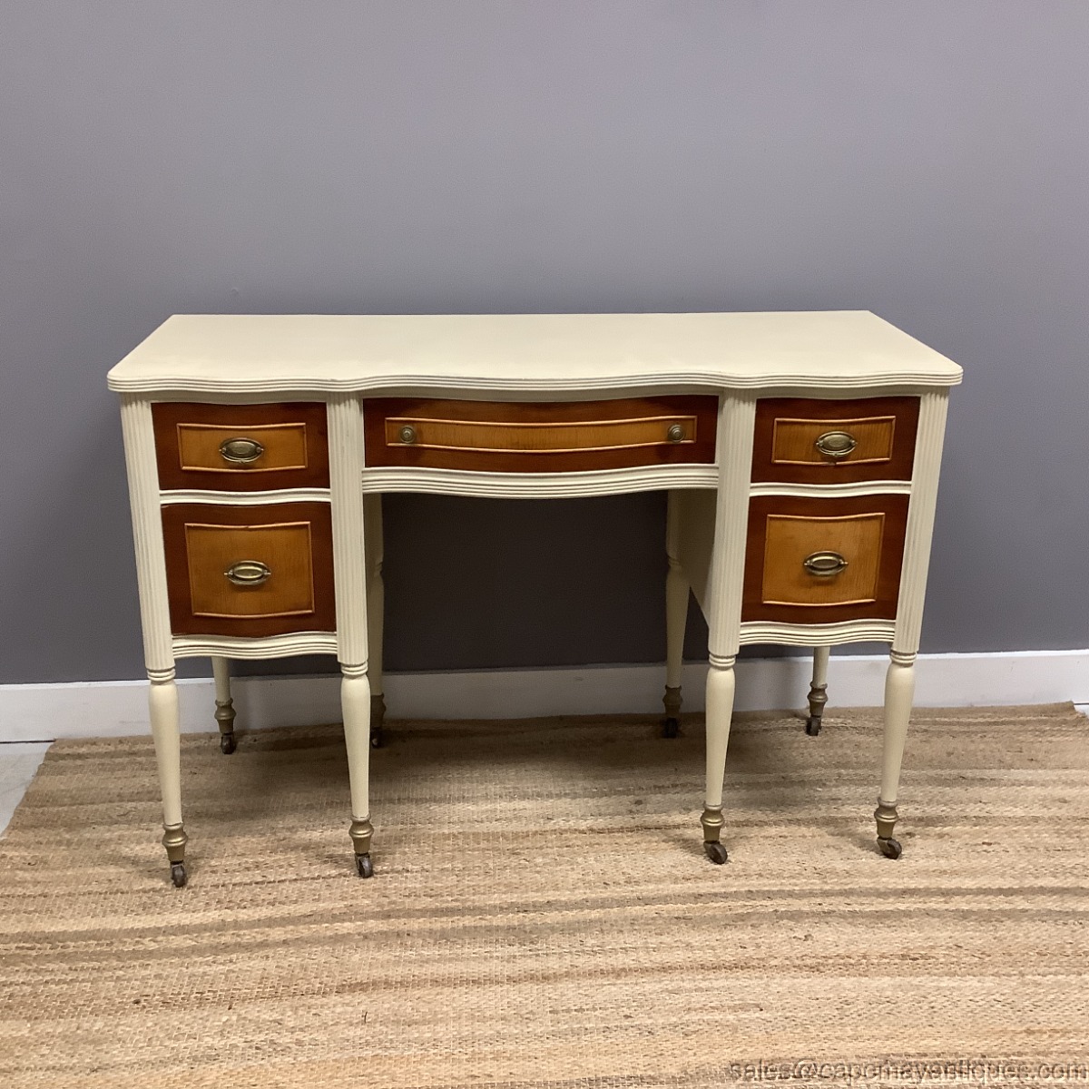 Vintage Painted French Desk Creamy Beige Wood Tones Gold Accents 5 Drawers