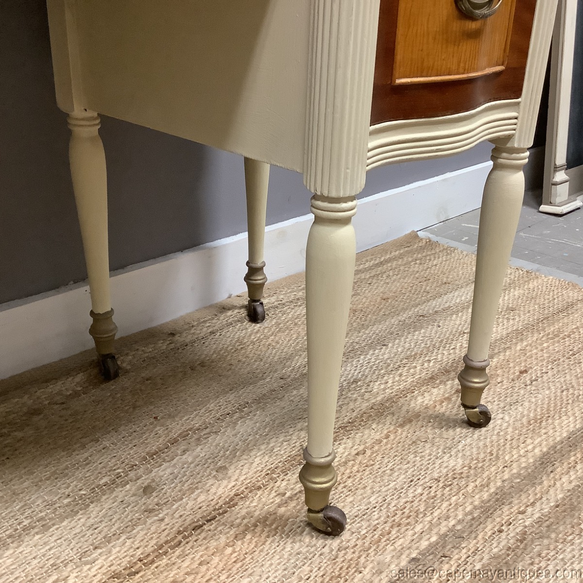 Vintage Painted Creamy Beige French Desk Wood Tones w Gold Accents 5 Drawers. 48" length by 19" deep and 32.5" tall. Amazing solid wood vintage or older solid wood desk with original two tone drawer that we left in tact and decided to play off the shades of the wood and style of the desk. Annie Sloan chalk paint old ochre color shade and accented fluted legs with gold or gilded wax finish creating a perfectly aged French look. Desk is on original wood wheels. 2 bottom drawers have replaced hardware which matches so nicely with the top thin drawer and 2 side drawers. Good clean condition. Hand painted so some minor imperfections here and there which add to her charm. Great desk for laptop, writing, correspondence and creativity! Good condition overall, solid wood, drawers have a bit of soil, see photos of top drawer, otherwise fantastic condition. Shipping is estimate of $300. Please send us your zip code BEFORE PURCHASING so we can give you an accurate estimate.