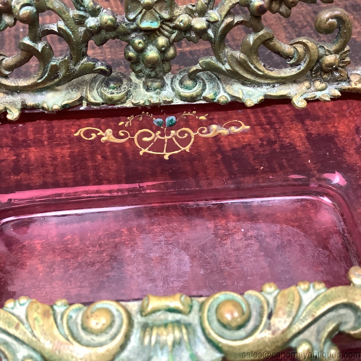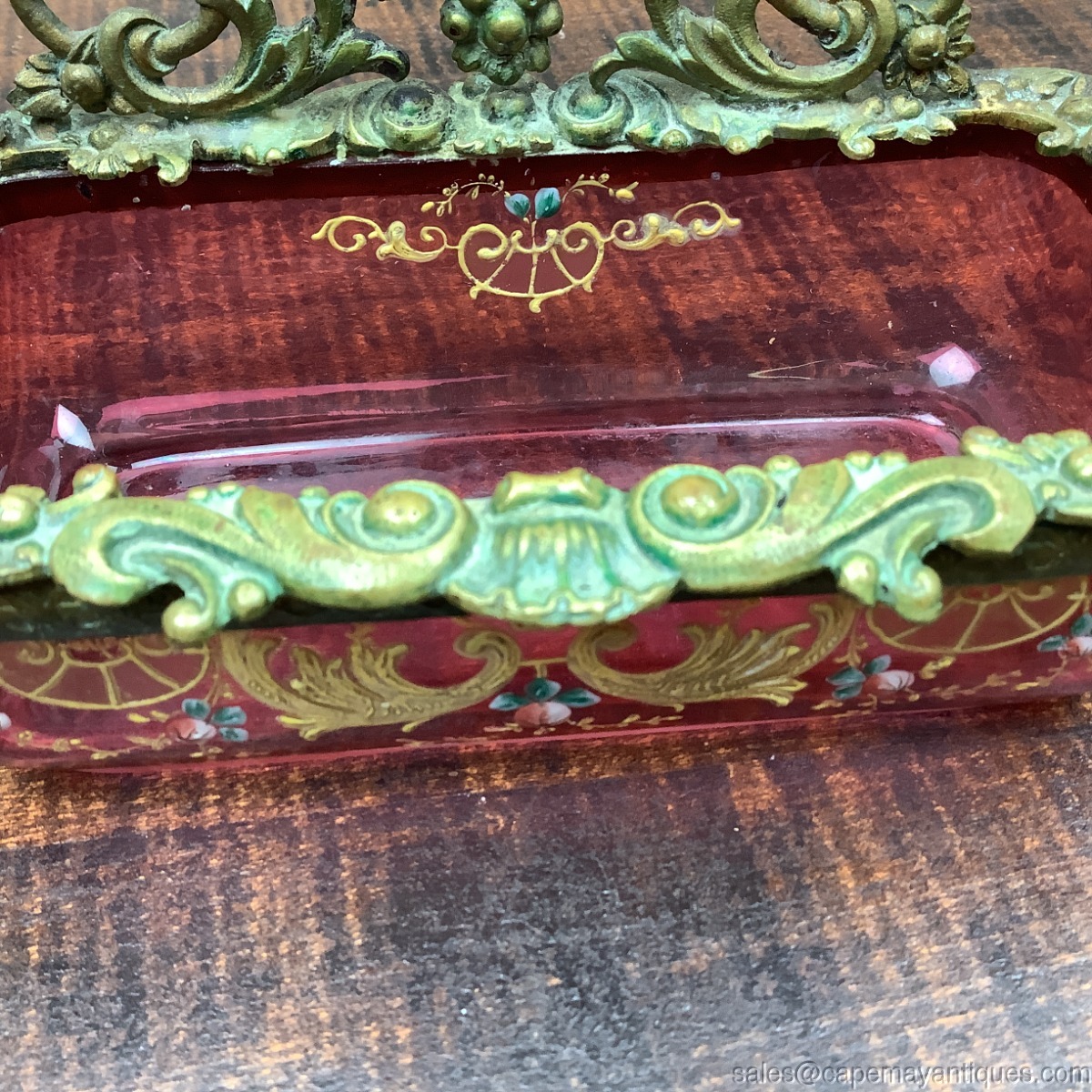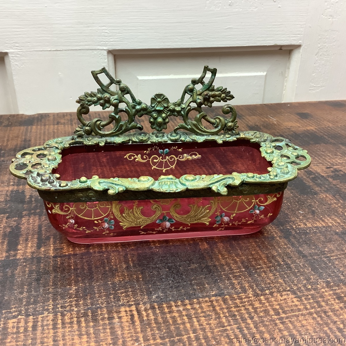 Stunning cranberry glass open, oblong vessel with hand enamel floral pattern, gold scrolls, leaves and pink blue flowers. The cranberry glass is trimmed with bronze trim in the form of flowers, scrolls, open side handles and the back is topped with an intricate gold bronzed metal open design featuring more flowers and scrollwork. I believe this might have been part of a larger vanity set. Open vessel with no lid but perfect for jewelry, trinkets etc. Measures 7" length by 3" wide. The back section is 3.5" tall and the depth of the chamber area is 1.5". Good condition overall, no broken metal sections, no chips in the glass. The very bottom of the box shows scratches and wear marks and some cloudiness in the glass. See images.