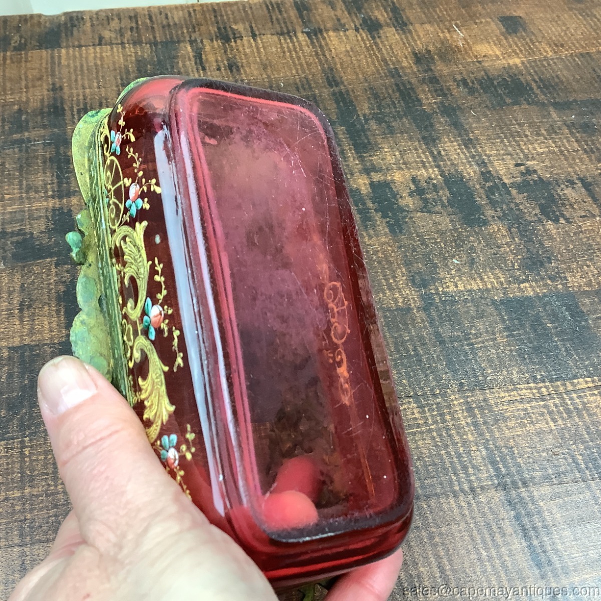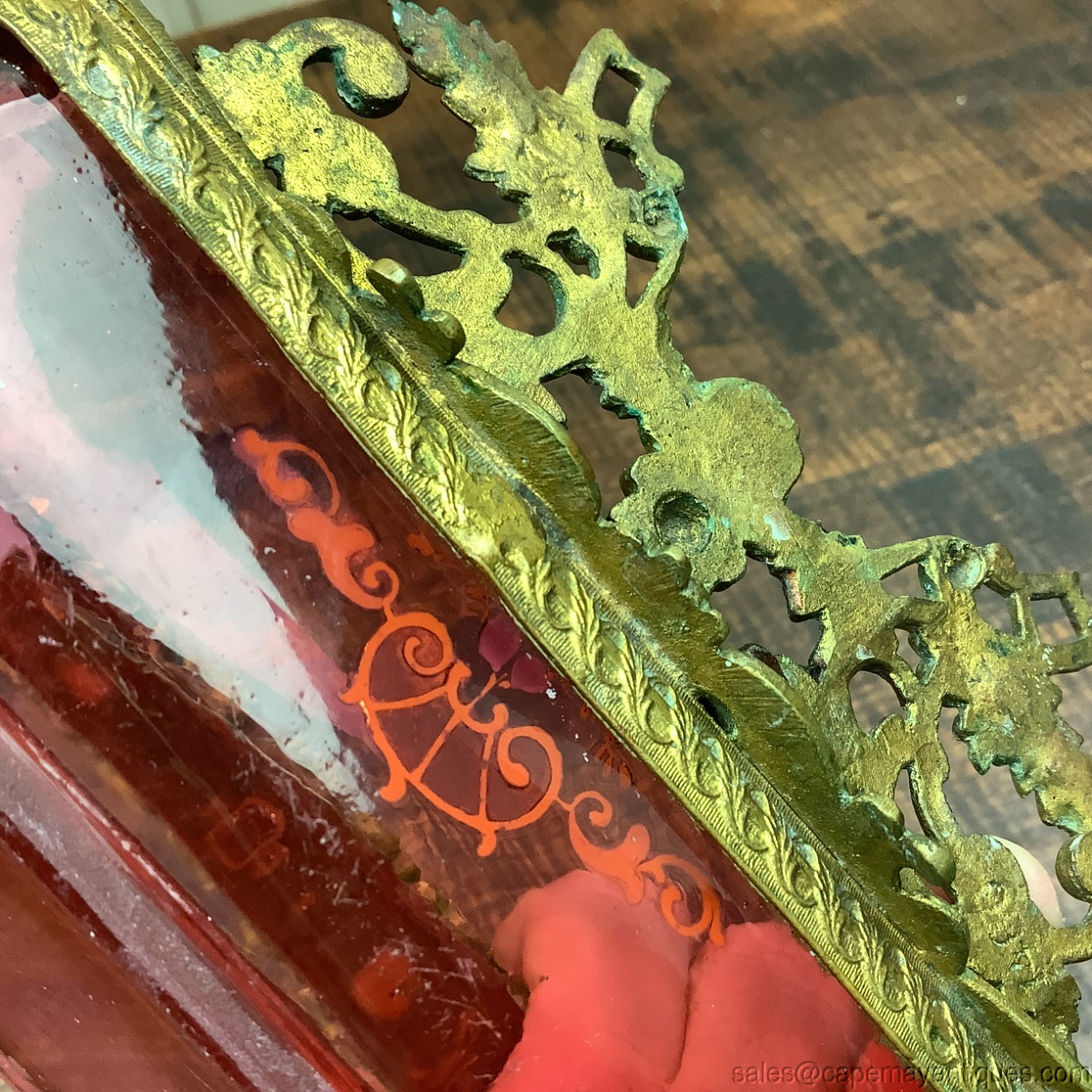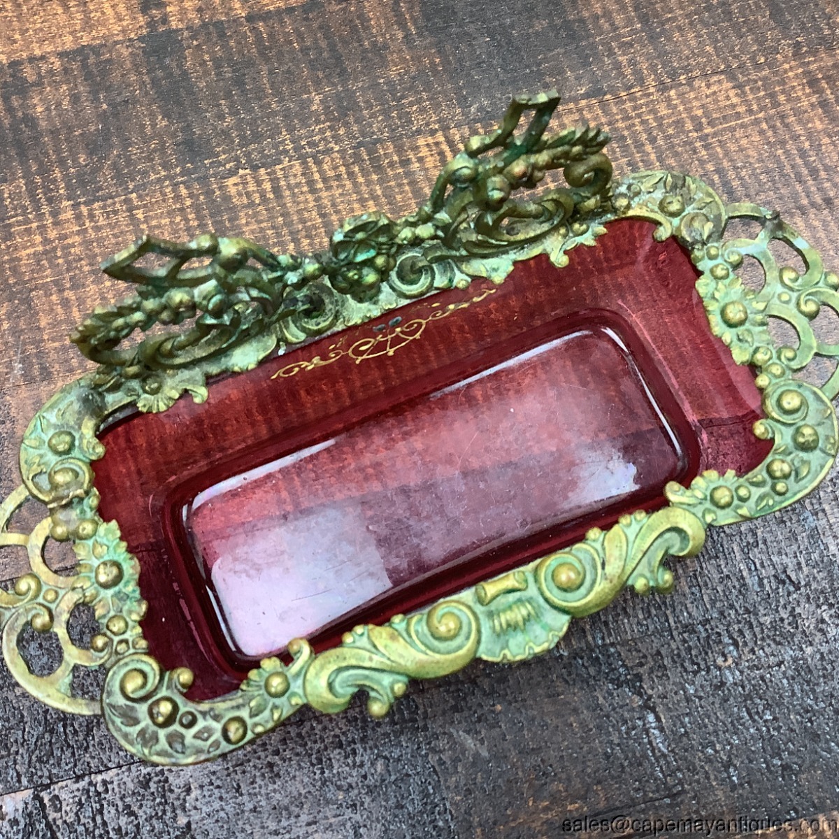 Stunning cranberry glass open, oblong vessel with hand enamel floral pattern, gold scrolls, leaves and pink blue flowers. The cranberry glass is trimmed with bronze trim in the form of flowers, scrolls, open side handles and the back is topped with an intricate gold bronzed metal open design featuring more flowers and scrollwork. I believe this might have been part of a larger vanity set. Open vessel with no lid but perfect for jewelry, trinkets etc. Measures 7" length by 3" wide. The back section is 3.5" tall and the depth of the chamber area is 1.5". Good condition overall, no broken metal sections, no chips in the glass. The very bottom of the box shows scratches and wear marks and some cloudiness in the glass. See images.