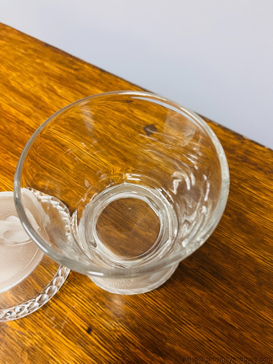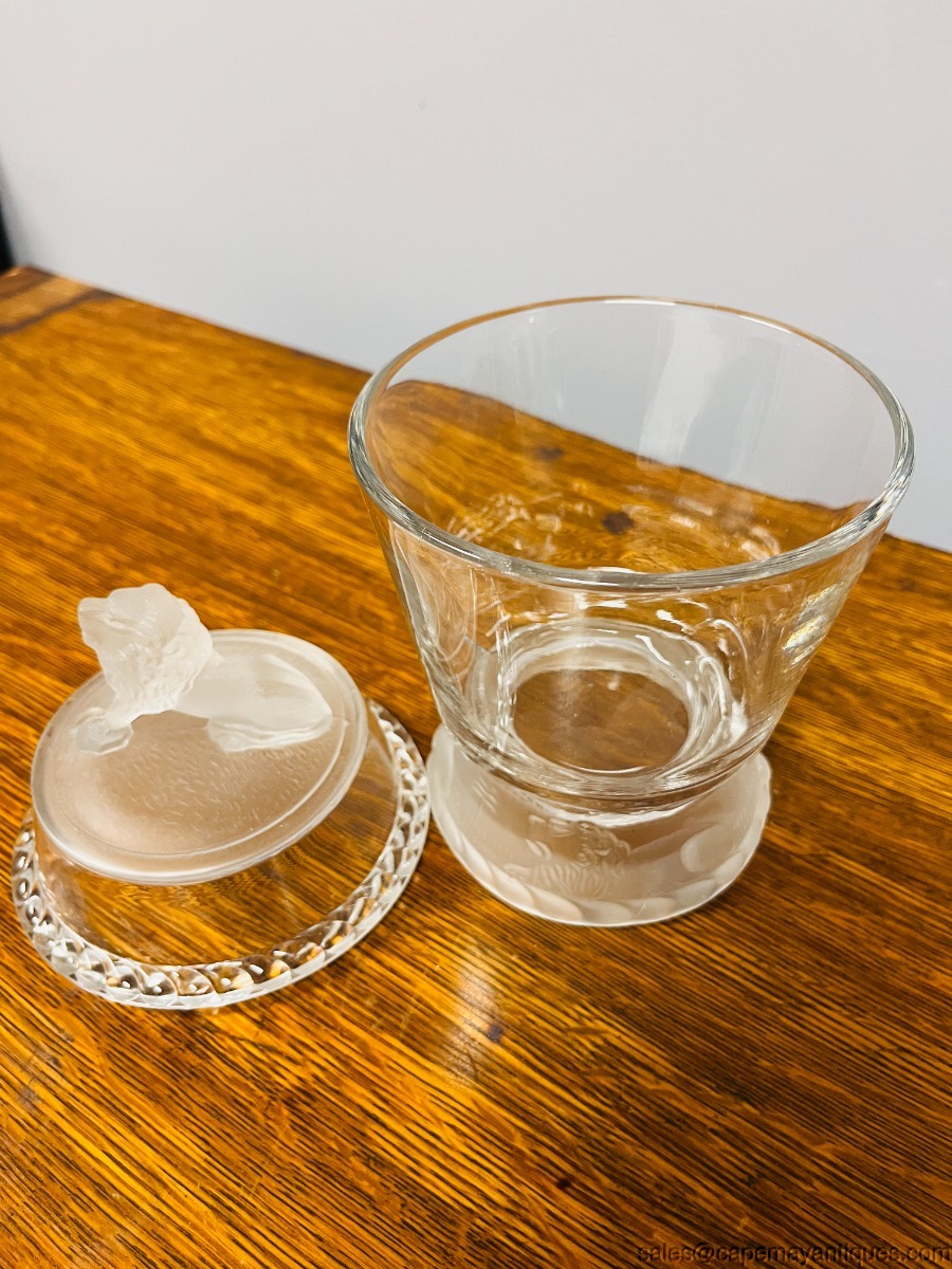 Fabulous covered glass jar by Gillinger & Sons mfg around 1877. The pattern is frosted lion. This Early American Pattern Glass jar is 9.5" tall with a 4.75" wide rim. The base is 4" wide. Pretty frosted lion on top and a relief pattern in frosted pattern on the footed base. Clean, glass, no damage. So pretty!