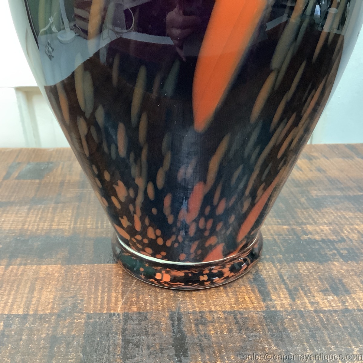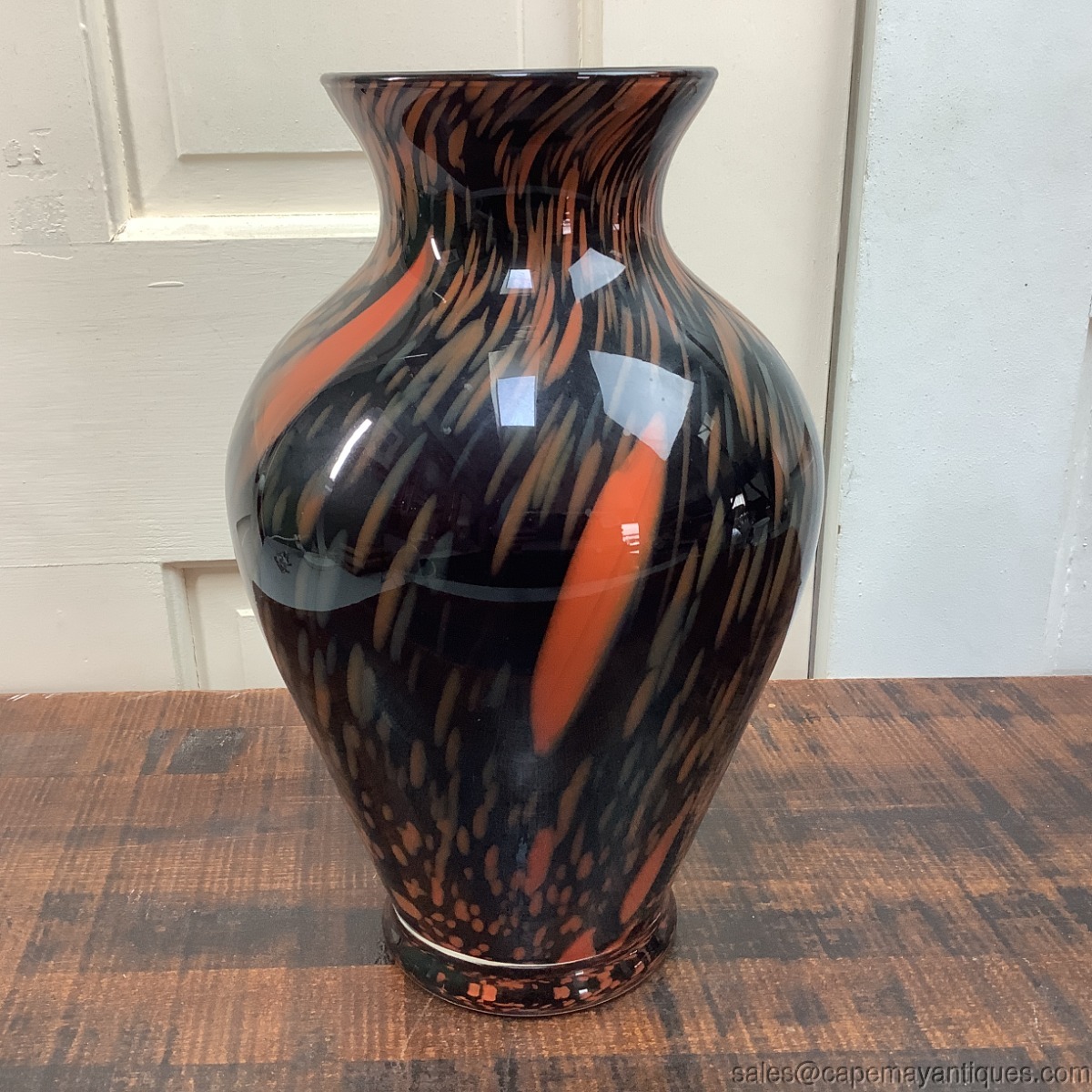 Lovely vintage art glass vase standing 11.75" tall with 4.75" wide rim. The body of vase is approximately 8" wide. This is not hand blown. Gorgeous colors, black to orange to amber and various shades in between. Good clean condition with no damage such as chips, scratches etc.