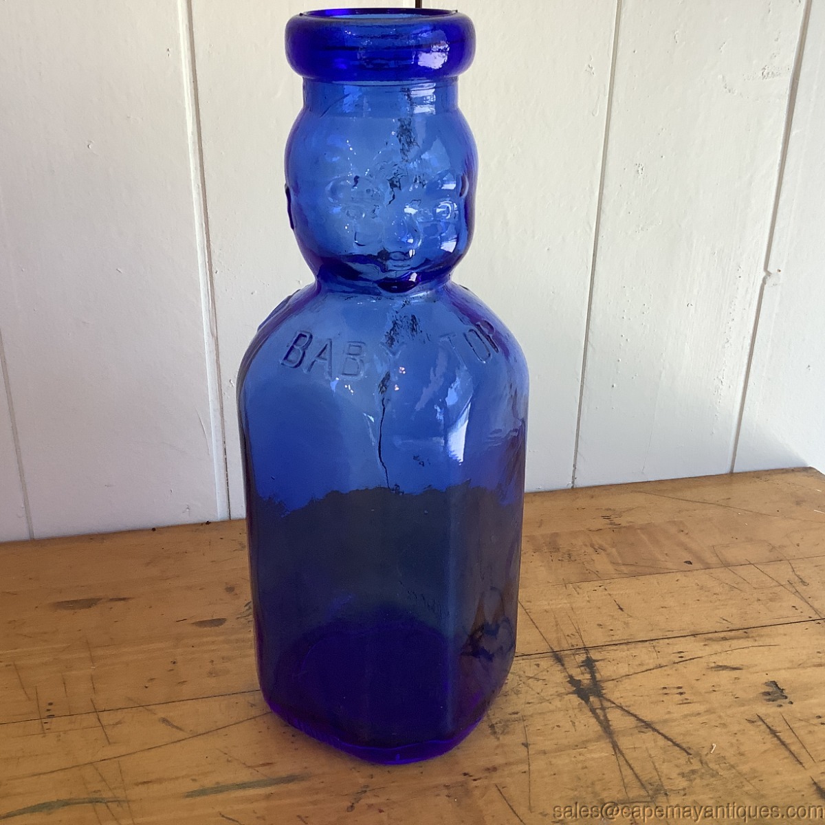 True blue glass Brookfield Baby Top bottle. This is a vintage reproduction. 9.75" tall and rim is 2" wide. One quart, Liquid markings. Baby face repeated on both sides of neck of bottle. Good condition with no damage.