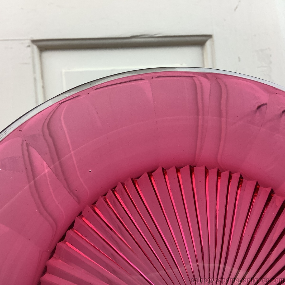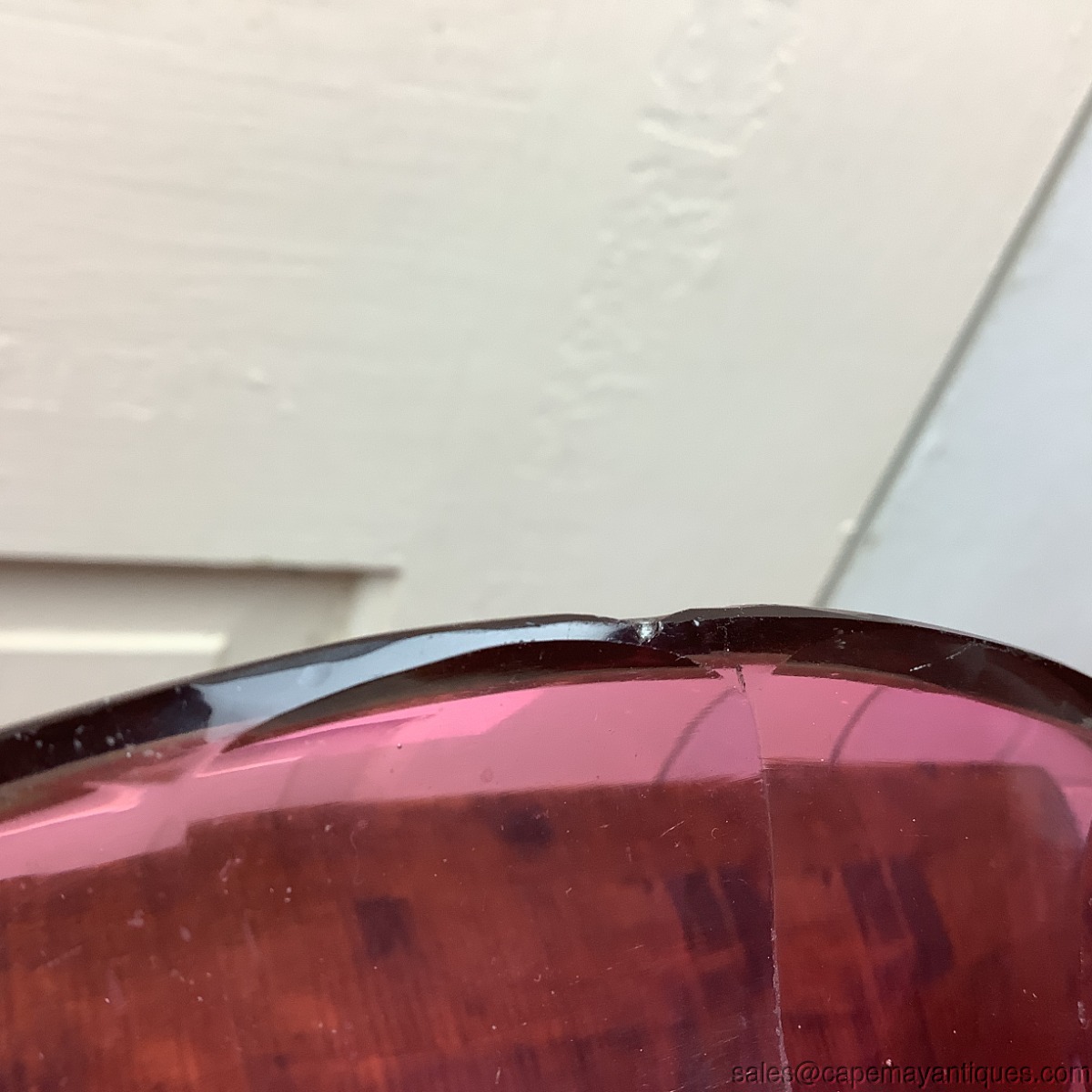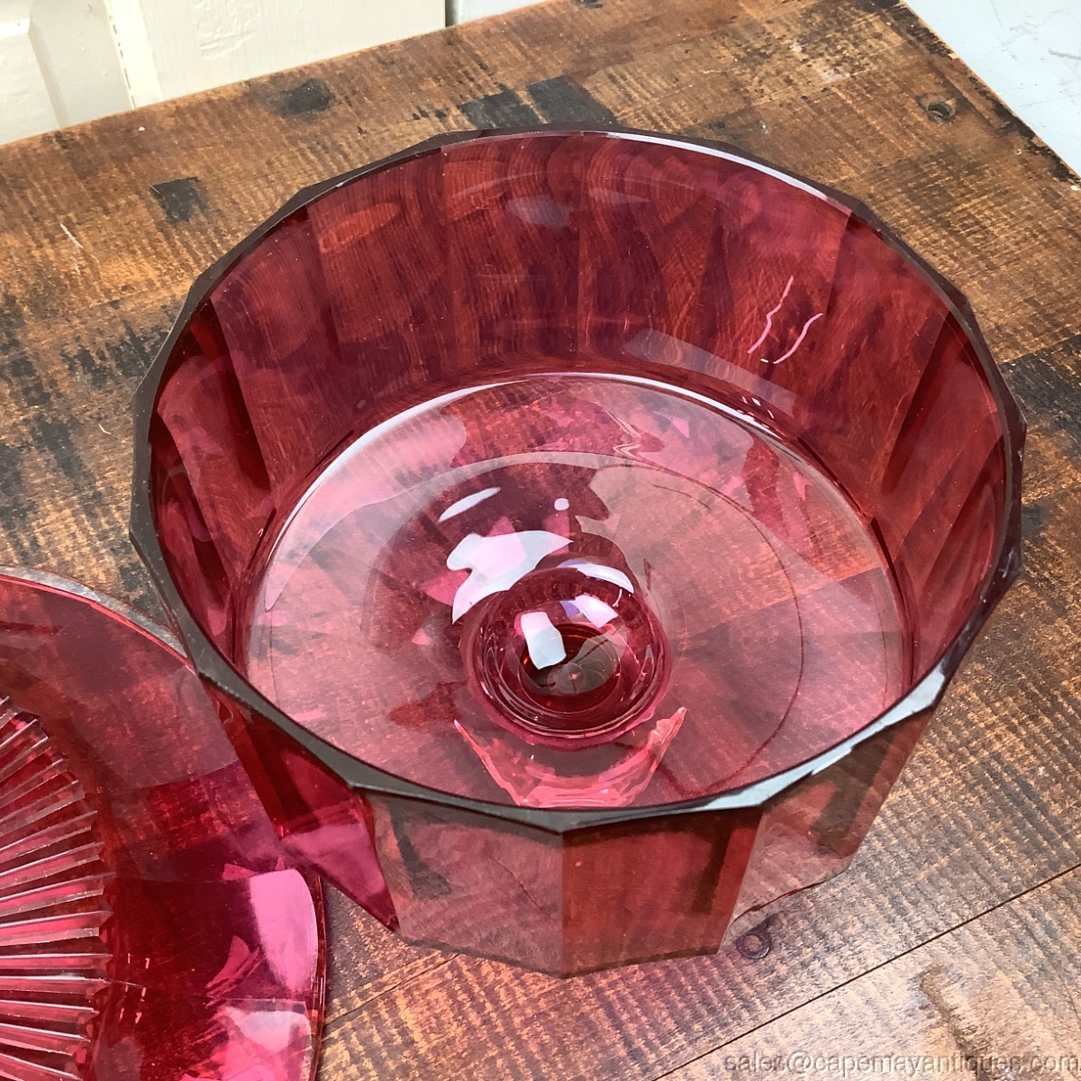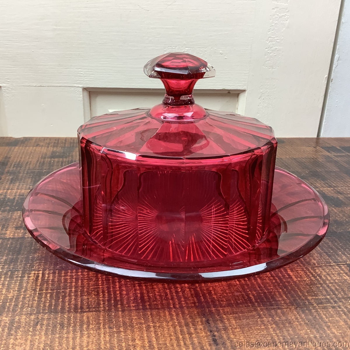 Cranberry Glass Covered Cheese Butter Dish Round Under Plate Faceted Pink Glass