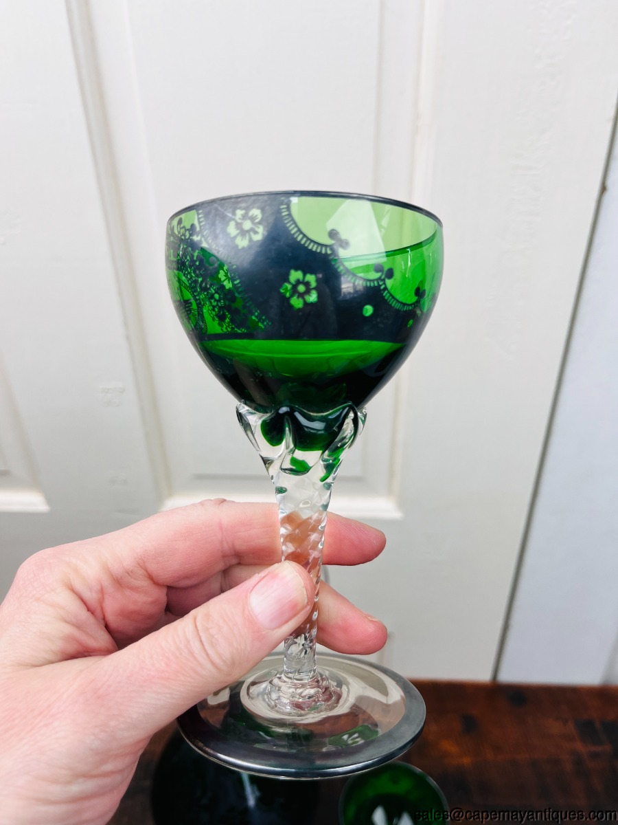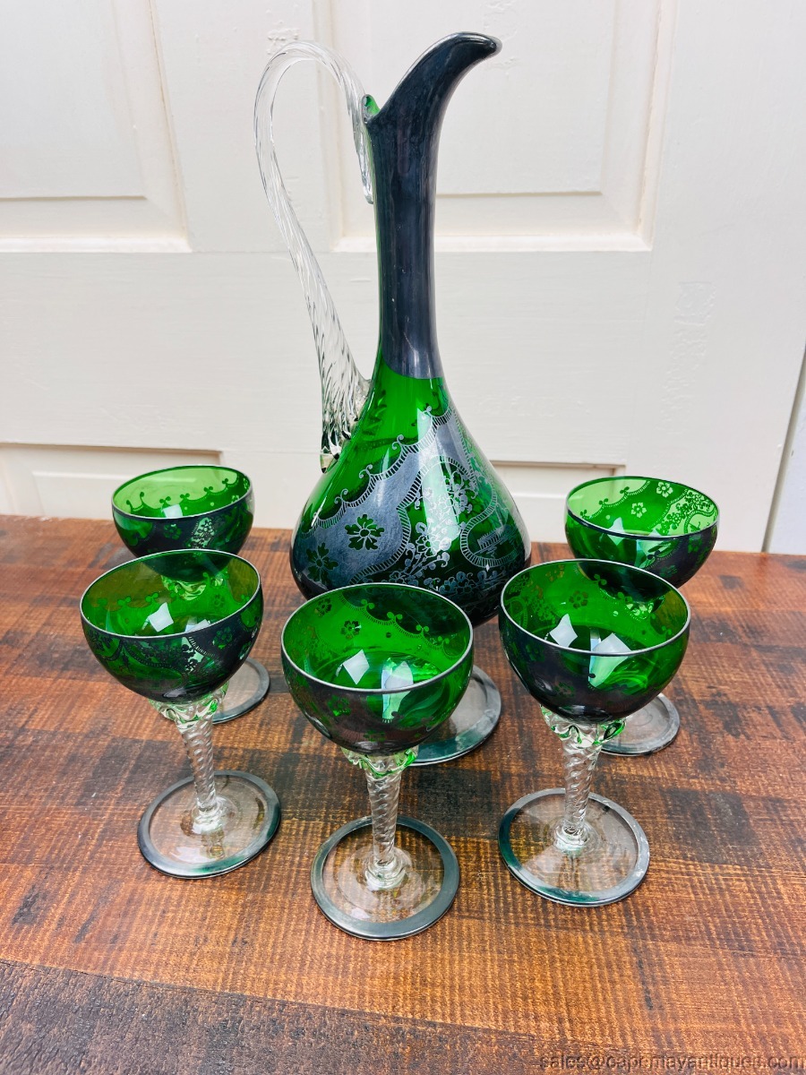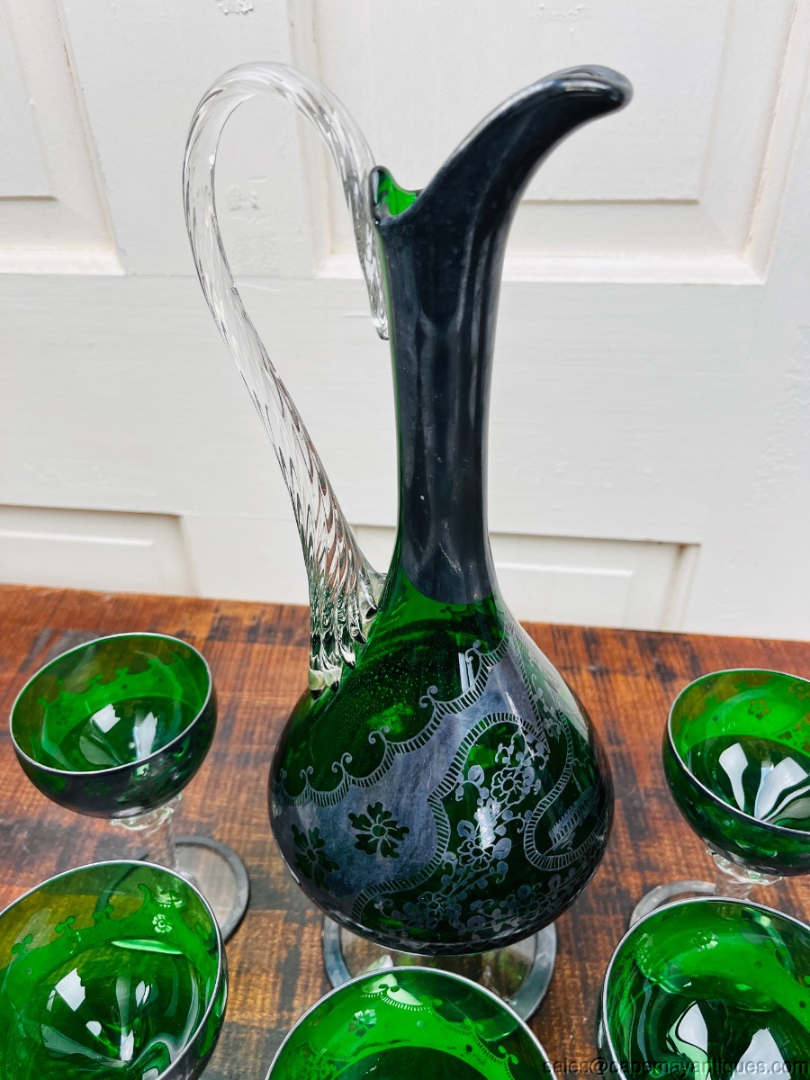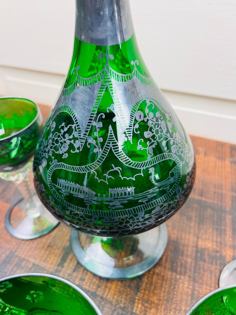 Empoli Italy Green Glass Decanter 5 Glass Silver Overlay Design Twisted Stems