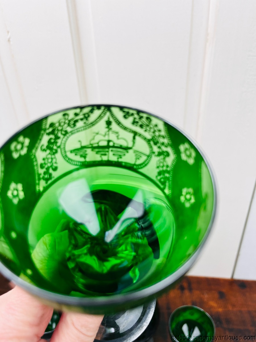 Lovely 6 piece set of Empoli Italy original vintage decanter and 5 glasses. The scene on the decanter features a Venetian water scene with boats and structures in the background. Pretty filigree floral pattern around the scene. The decanter is 13.5" tall, the glasses are 5.5" tall with 3" wide rim. No chips or cracks. No markings regarding silver overlay or deposit, ie. probably not sterling. No chis or cracks.