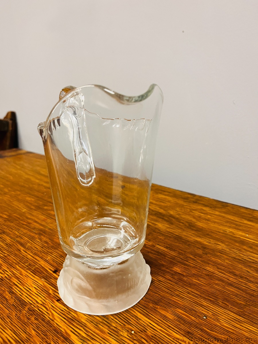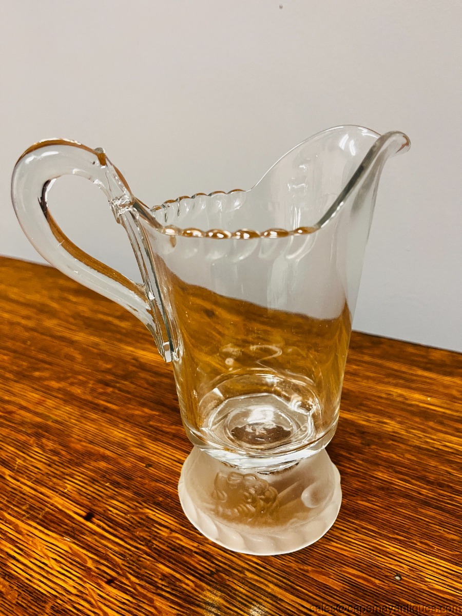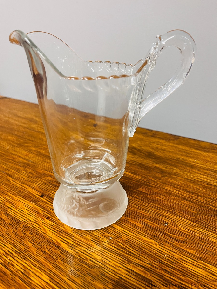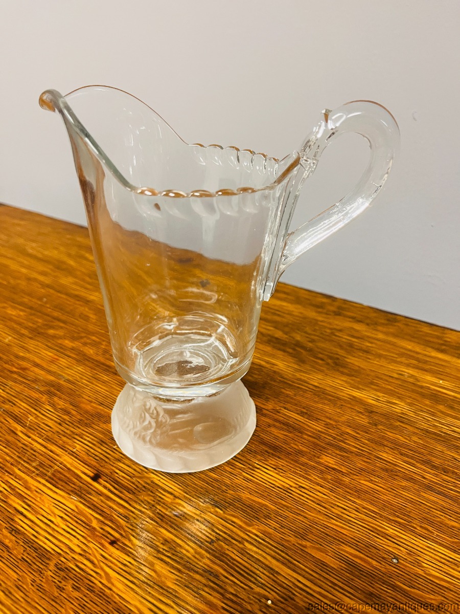 Lovely antique footed pitcher or creamer standing 6.75" tall with 3.5" wide rim. Base features Frosted Lion pattern. This was bought with a lot of other Gillinder & Sons glassware from a Philadelphia auction company. Good clean condition with a smaller sliver chip on the scalloped rim on one side at the very closest scallop to the handle. Very hard to notice, smooth and clean. Great collectible, spooner or display piece as well as very functional.