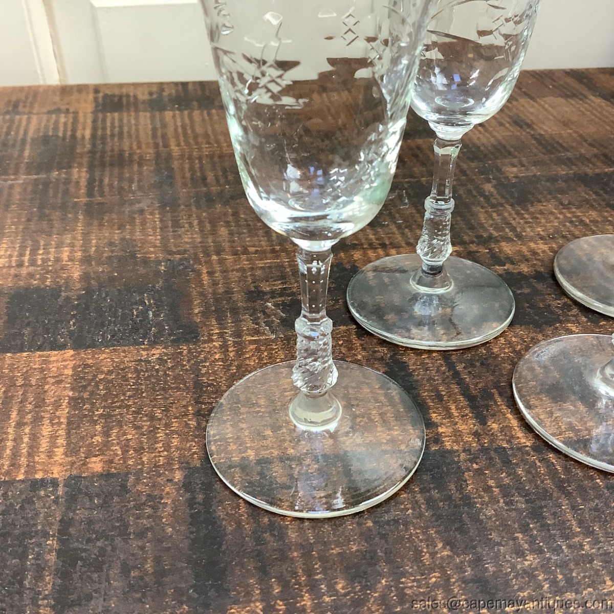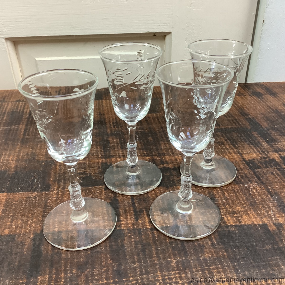 Set of 4 brandy or cordial glasses standing 4 3/8" tall with 1 5/8" wide rim. This could be Dixie pattern but it is not exact. Good clean condition with no damage. So pretty and elegant, vintage glasses.