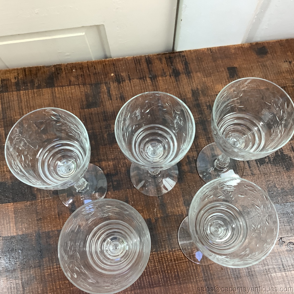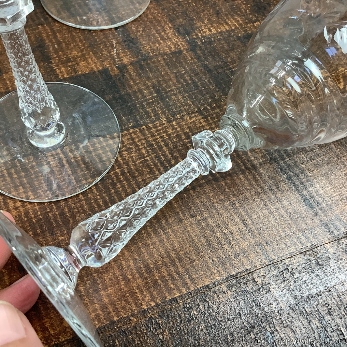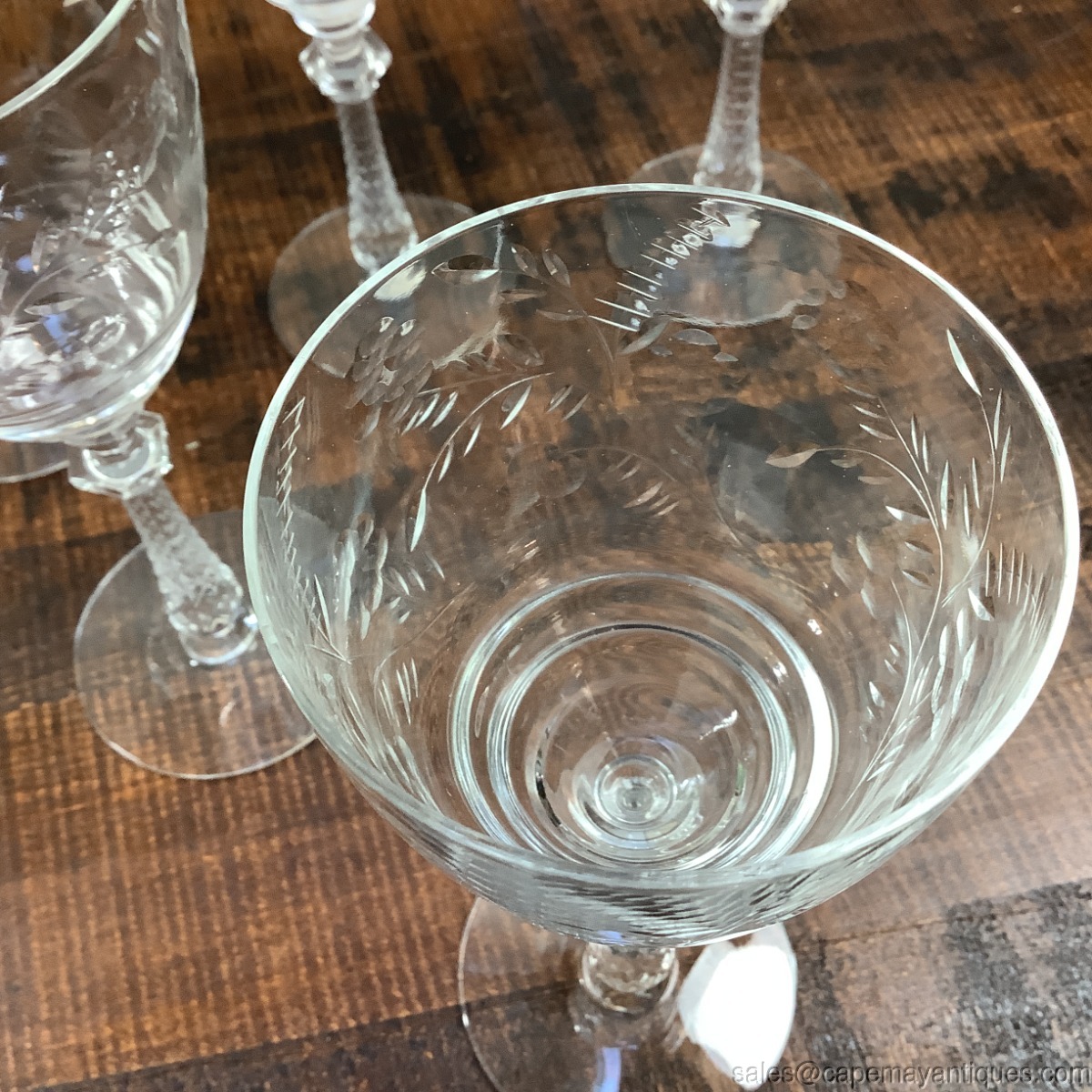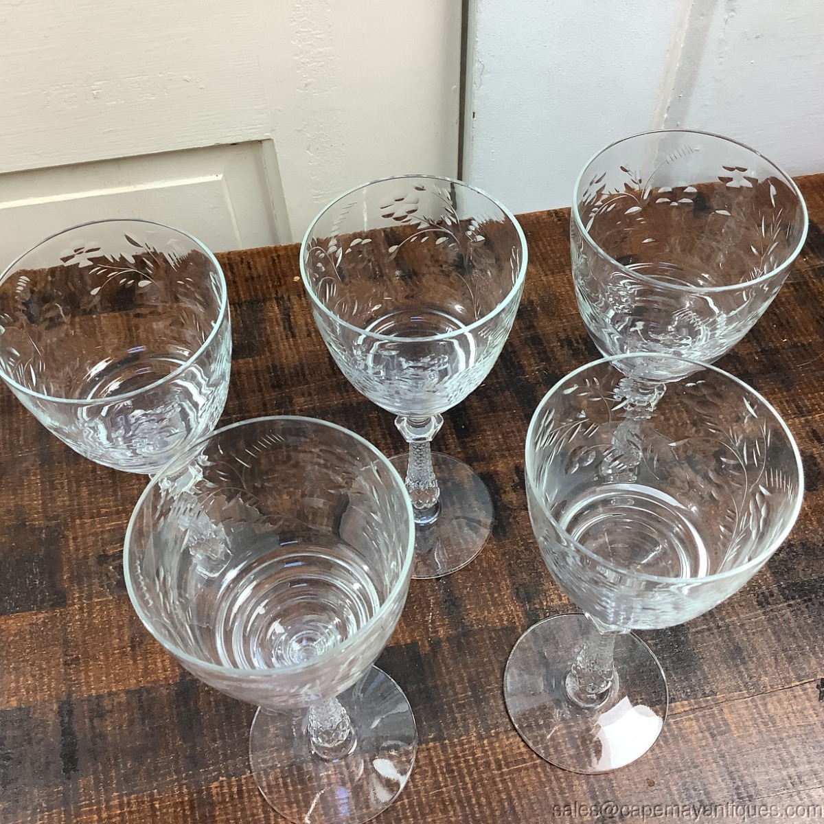 Really had a hard time finding the exact pattern but it is very close to Dixie but not exactly! Yikes! There are 5 footed water or wine glasses standing 7 7/8" tall with 3 1/8" wide rim. Pretty flowering fern, single flower with leaves etched pattern. Stems are gorgeous, faceted at the top and bottom bowl of glass is tiered. Good clean condition. One has the tiniest mfg rough spots on inner rim in one small section. Too hard to photograph.