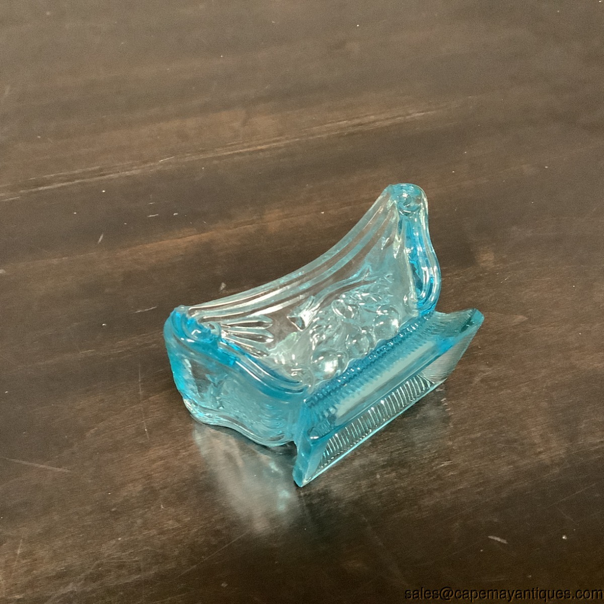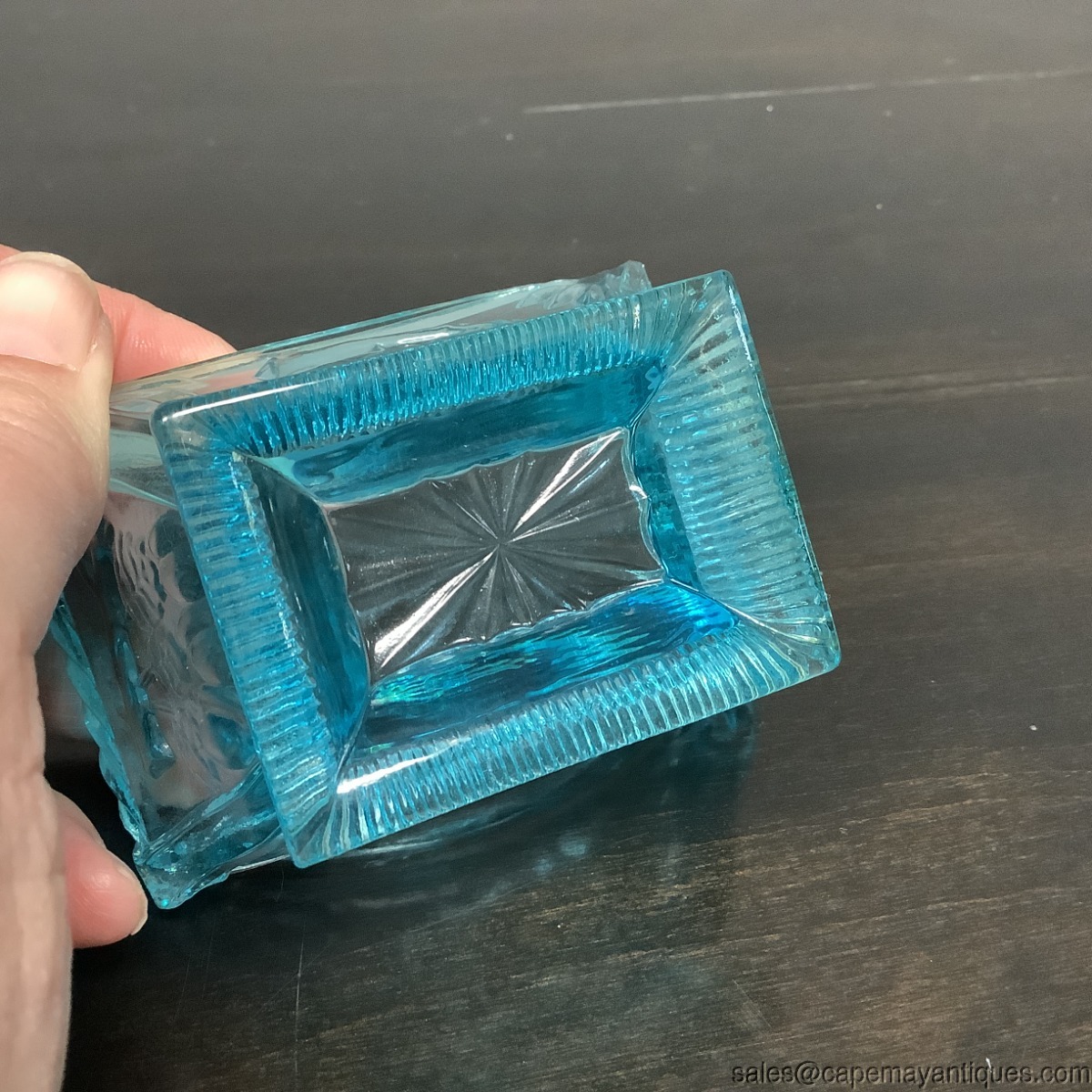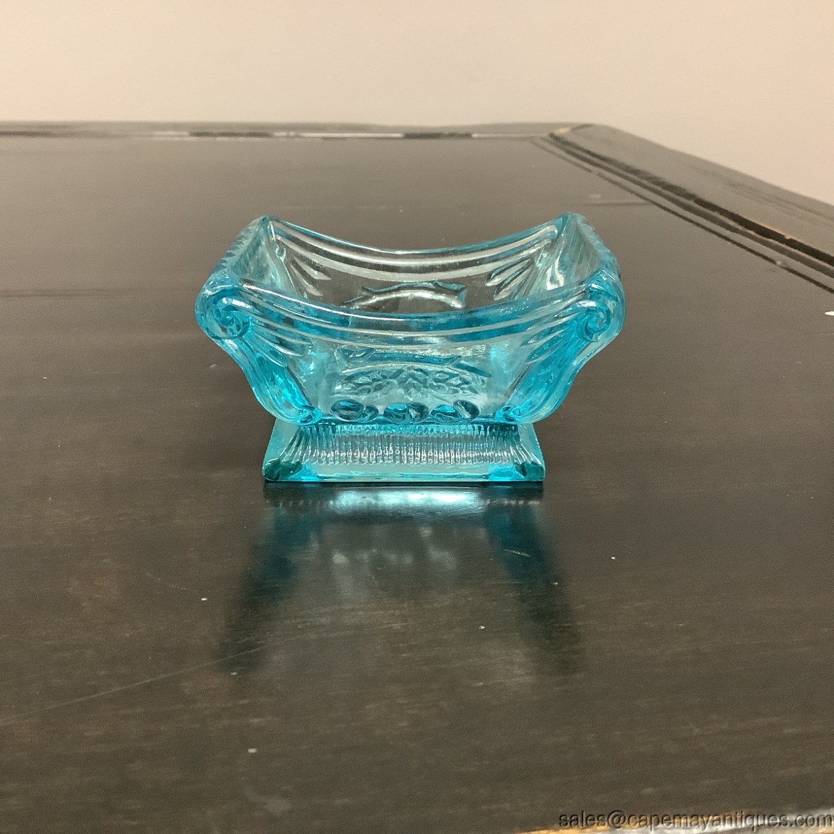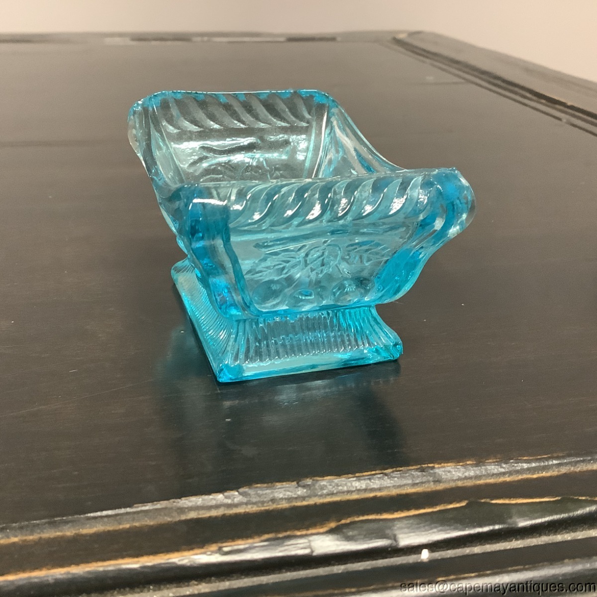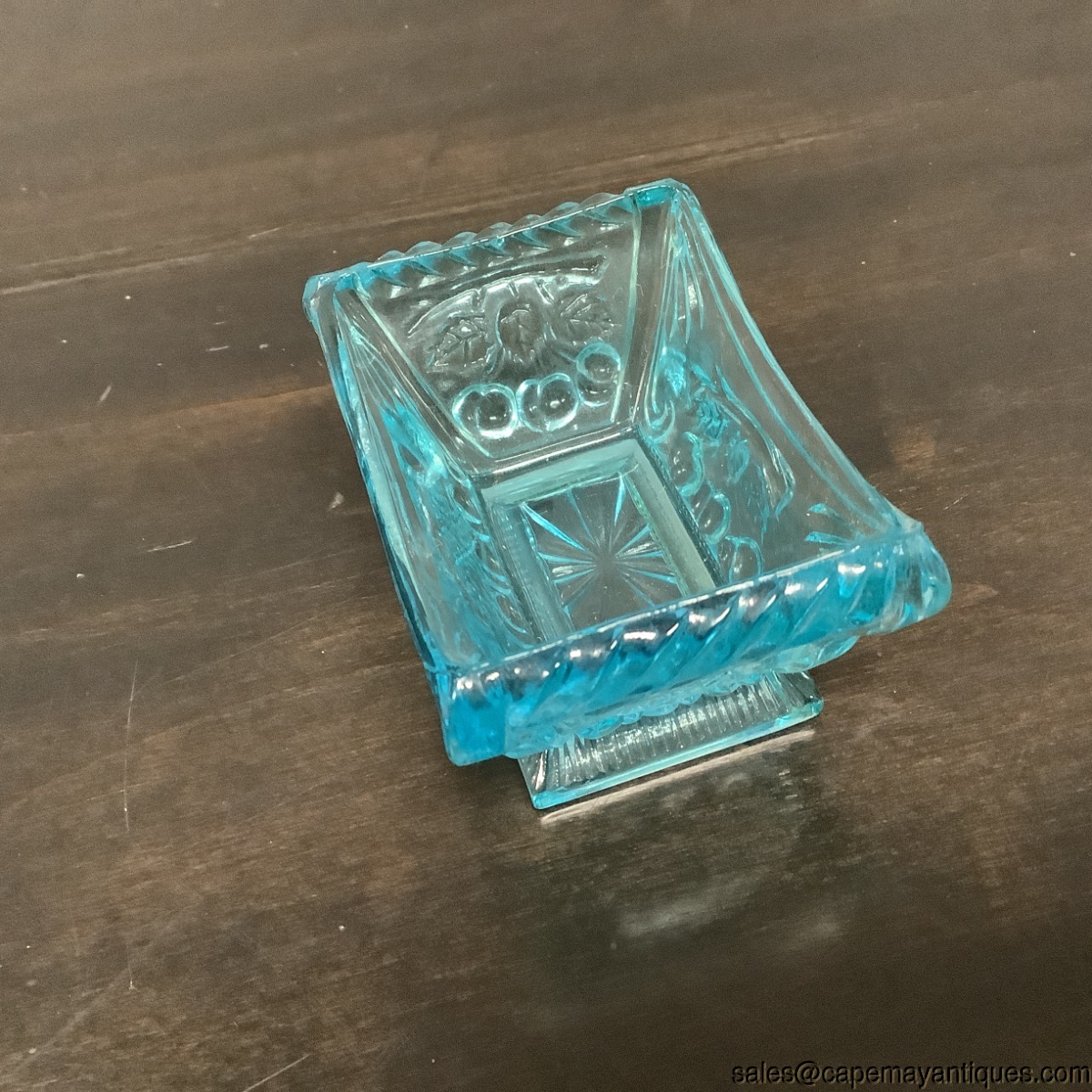 Lovely true blue glass, EAPG era by Wilkinson in the Blue Cherry pattern. 3" length by 2" wide and 2" tall. Vey good clean condition with no damage.