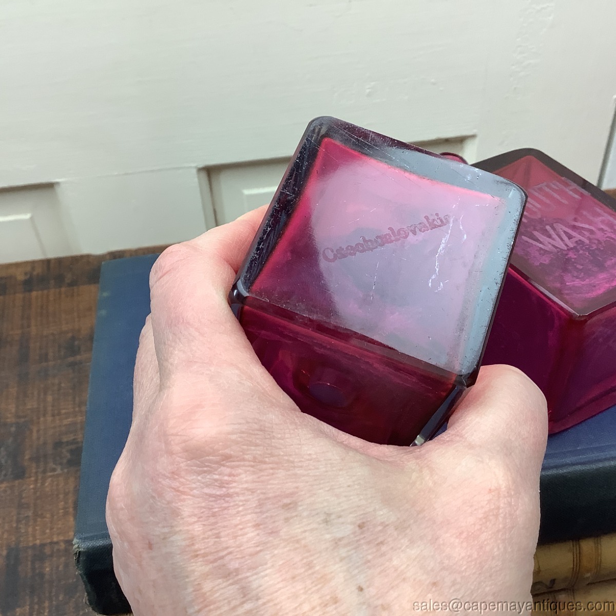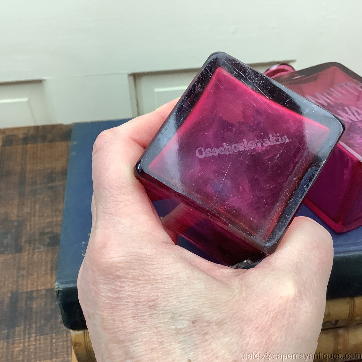 Lovely art deco era, pink cranberry glass decanter bottles signed Czech. One is Hand Lotion and the other Mouthwash. These are 4.75" tall and 2.5" square at base and shoulders. The Hand Lotion bottle has a small nick on the per rim, side area. There are no stoppers included. No major damage. Some left over white residue in each. Lovely collectible cranberry glass decanters.