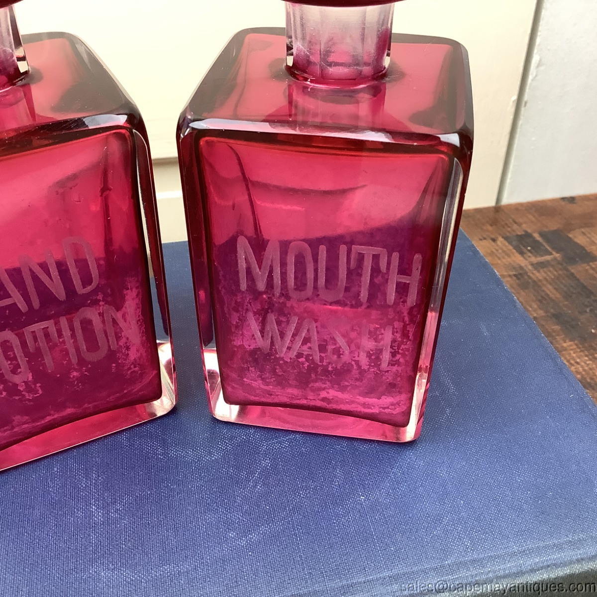 Pair Art Deco Cranberry Pink Vanity Decanters Bottle Czech Hand Lotion Mouthwash