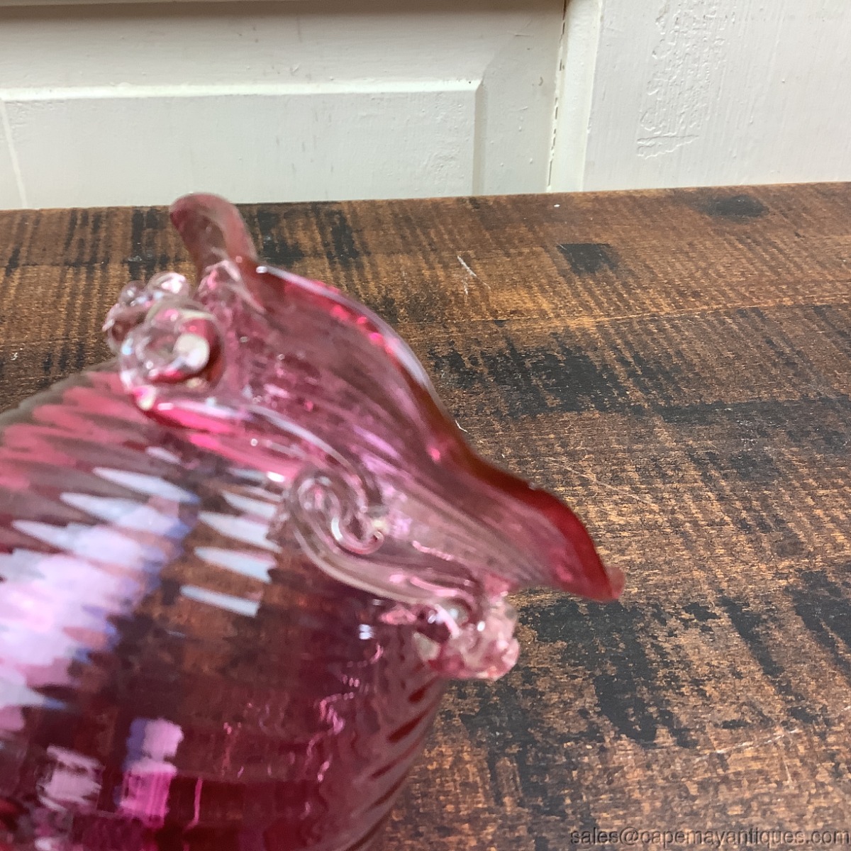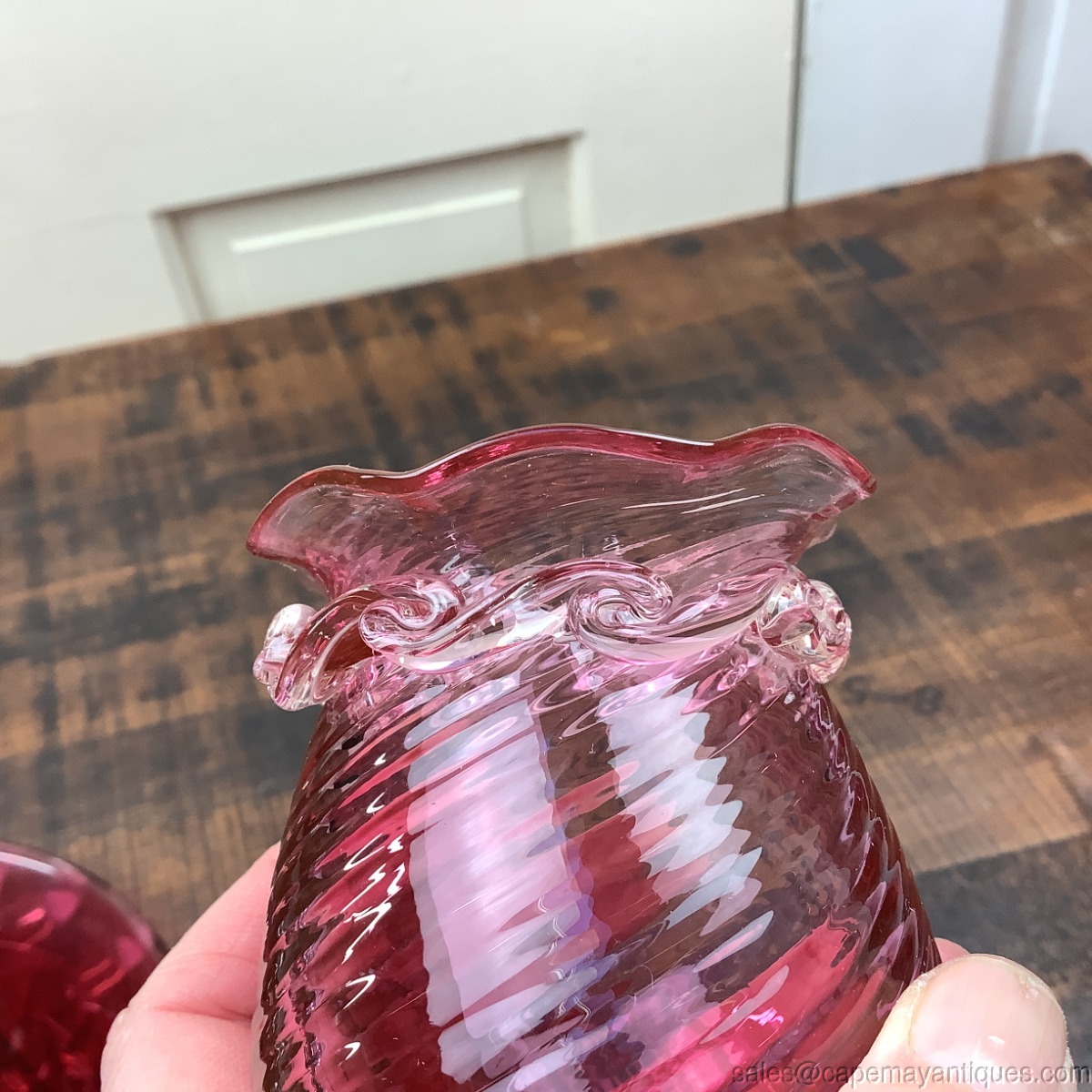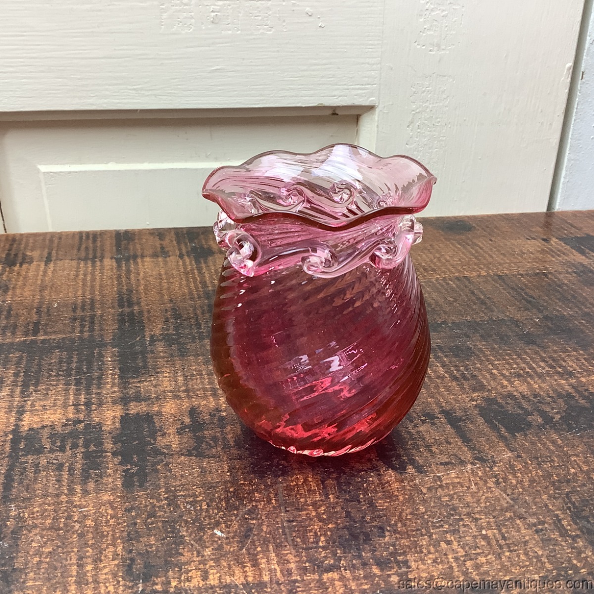 Pilgrim Glass Cranberry Short Vase Ruffle Rim Swirl Pattern Clear Pulled Waves