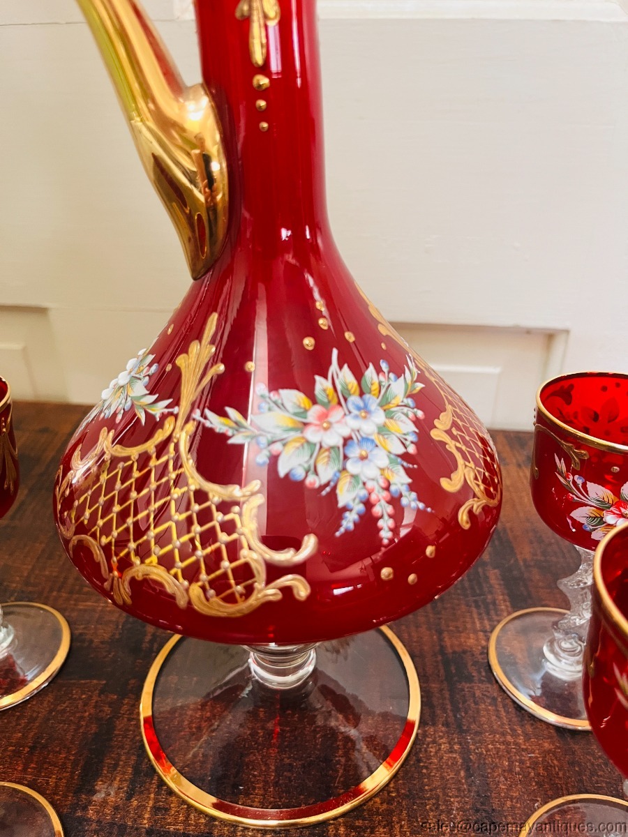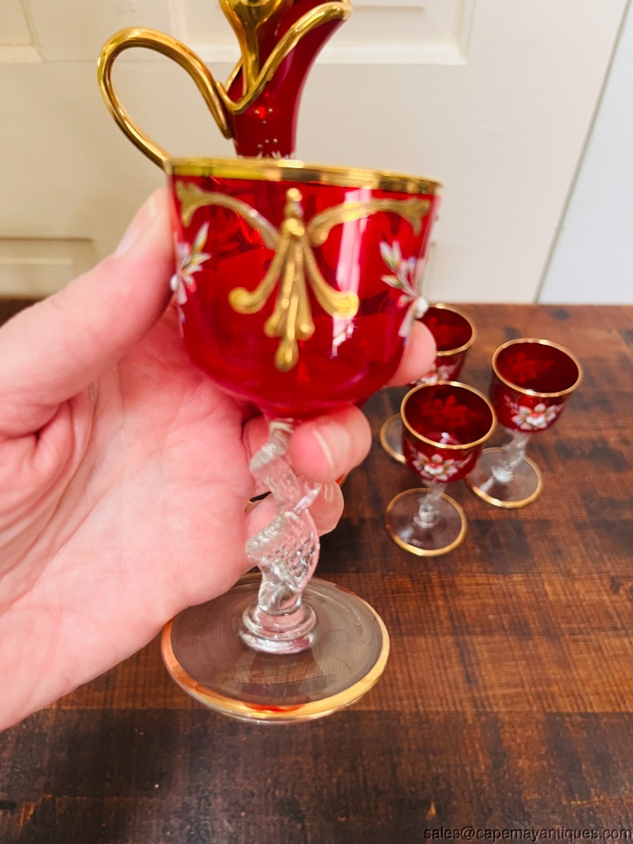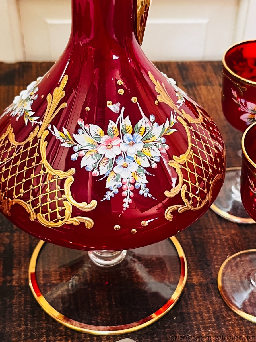 Gorgeous true red glass (not flashed) Italian or Czech Bohemian decanter set including tall pitcher with gold stopper and 6 matching glasses. No paper label or markings. Red with gold accents and hand raised enameled floral pattern. Decanter is 15" tall to top of stopper. The glasses are 4.5" tall with 2.25"wide rim. Good condition with no chips or cracks, no gold coloring loss either.