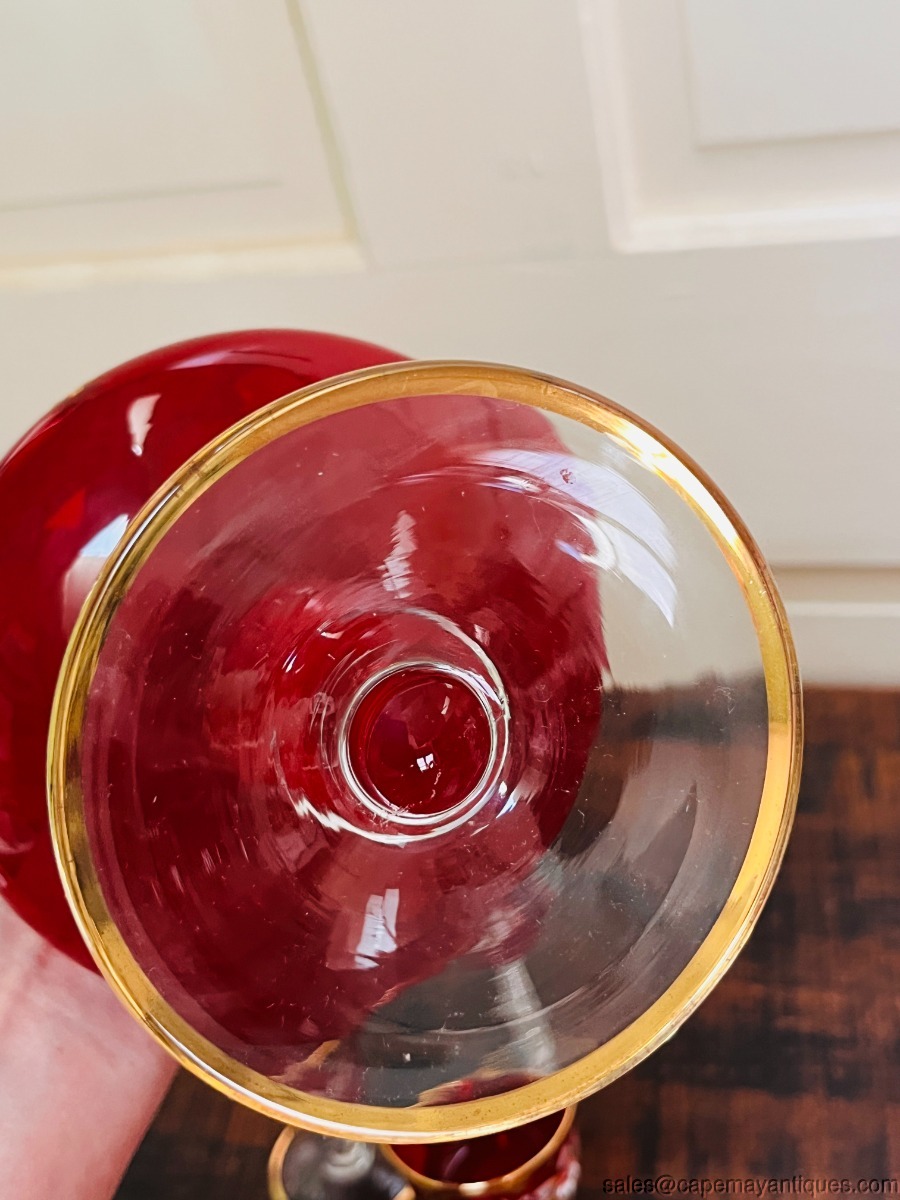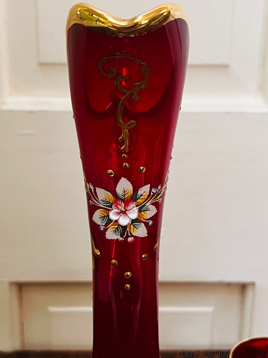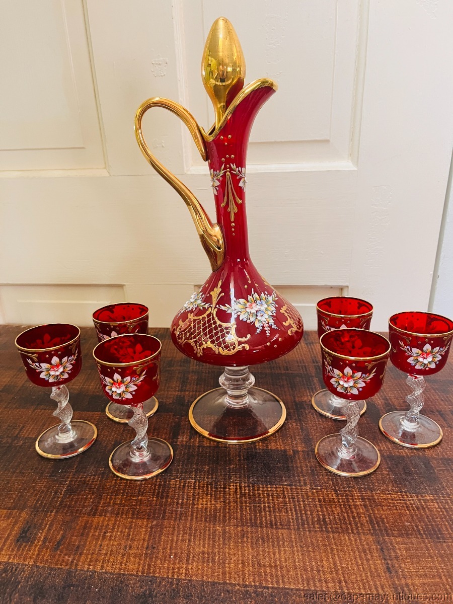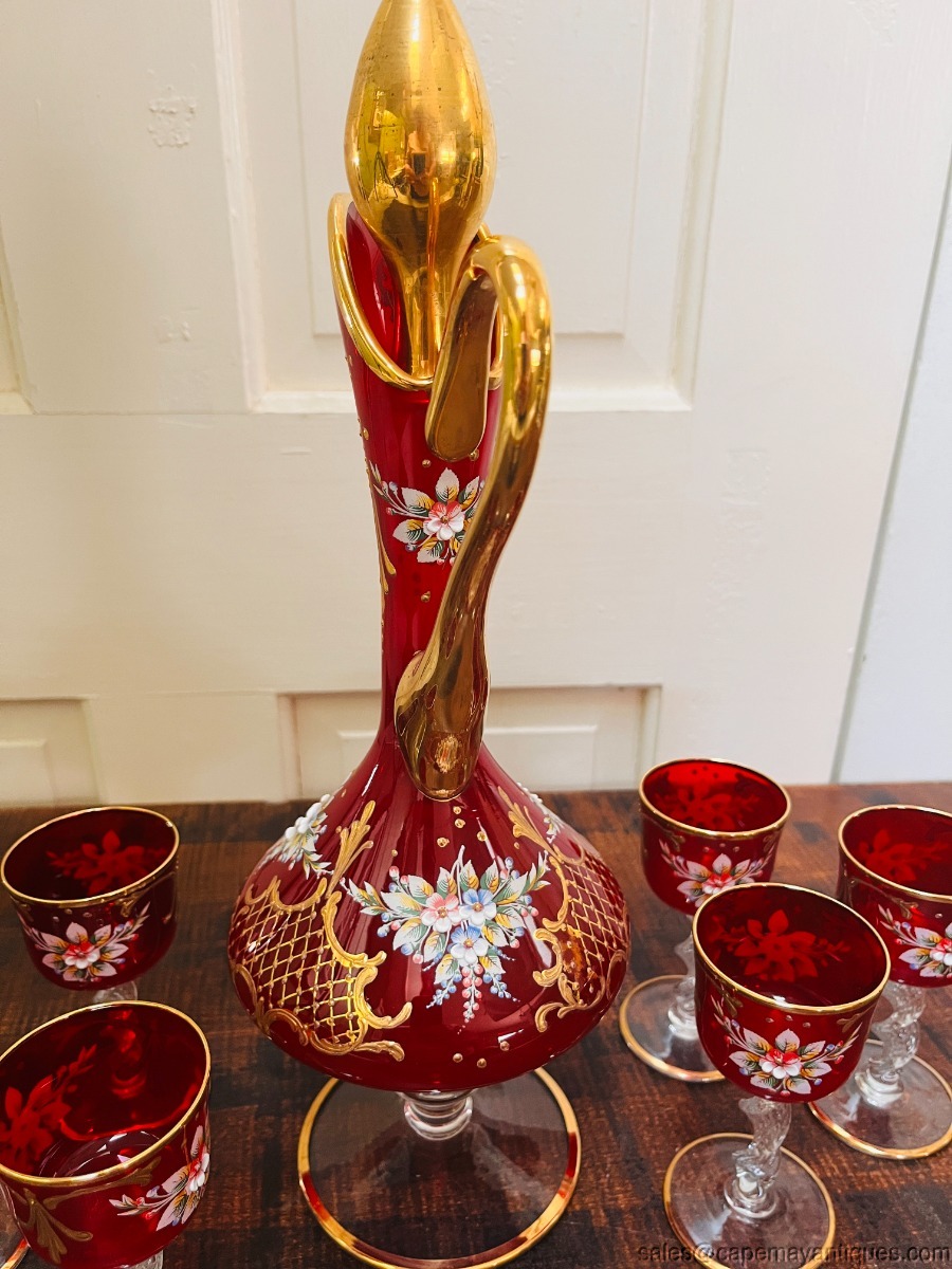 Gorgeous true red glass (not flashed) Italian or Czech Bohemian decanter set including tall pitcher with gold stopper and 6 matching glasses. No paper label or markings. Red with gold accents and hand raised enameled floral pattern. Decanter is 15" tall to top of stopper. The glasses are 4.5" tall with 2.25"wide rim. Good condition with no chips or cracks, no gold coloring loss either.