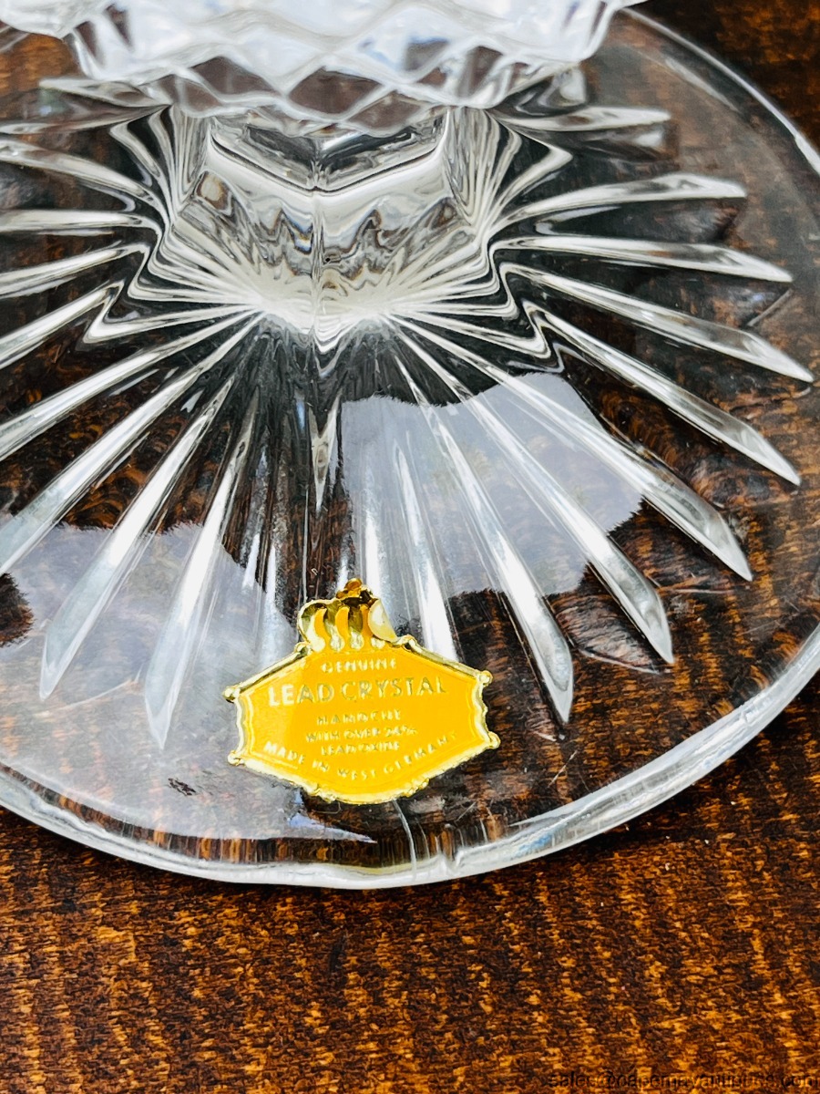 Gorgeous vintage German made lead glass pitcher jug standing 12.5" tall with 5" wide rim. Partial paper label in tact at bottom foot. Reads Genuine Lead Crystal Hand Cut with over 24% lead crystal. Made in West Germany. Good clean condition with no damage. So pretty, great for a vase too!