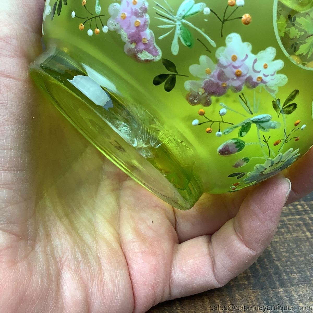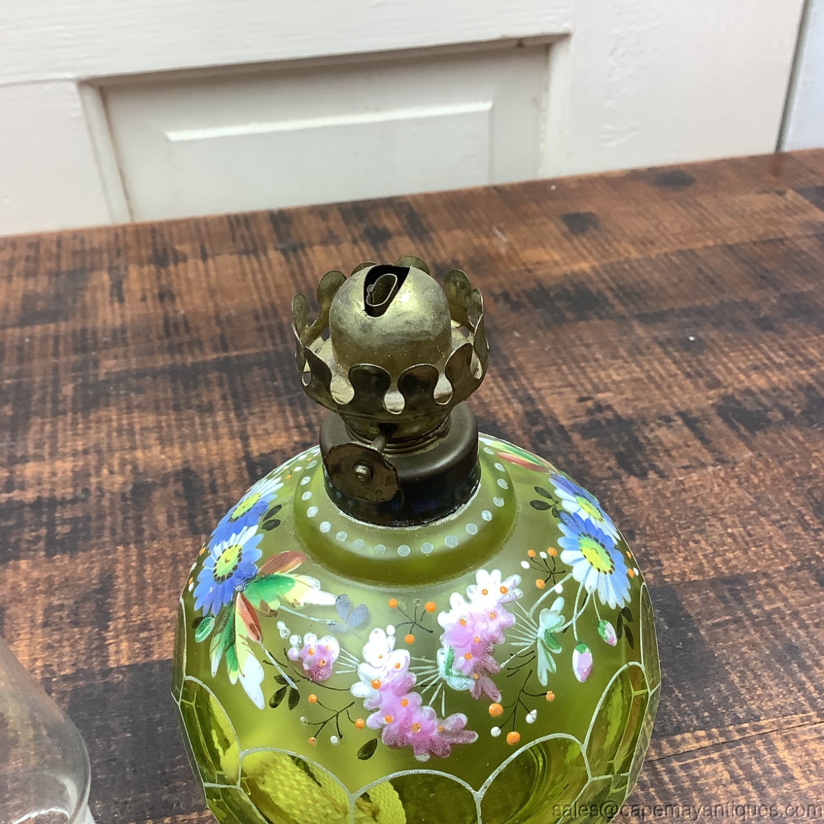 Lovely antique miniature glass oil lamp featuring a lime green glass base with an impressed honeycomb pattern or diamond quilt lattice running around the entire center of the glass base. There are hand painted flowers above and below the bulbous center in blue, pink colors and beaded raised enamel trim. There is a large chip on the base. See photos. Otherwise, good clean condition. Does not glow under black light.