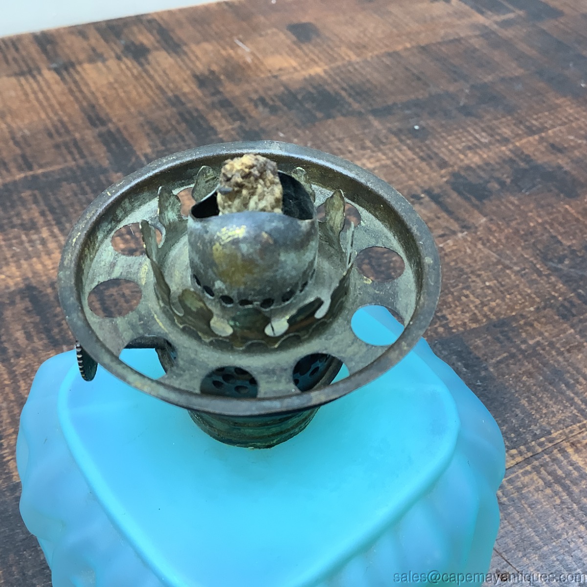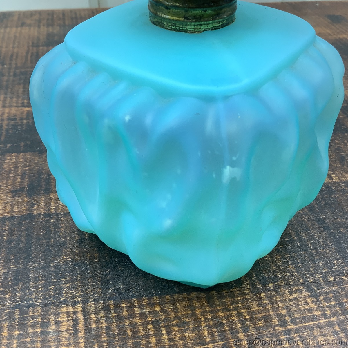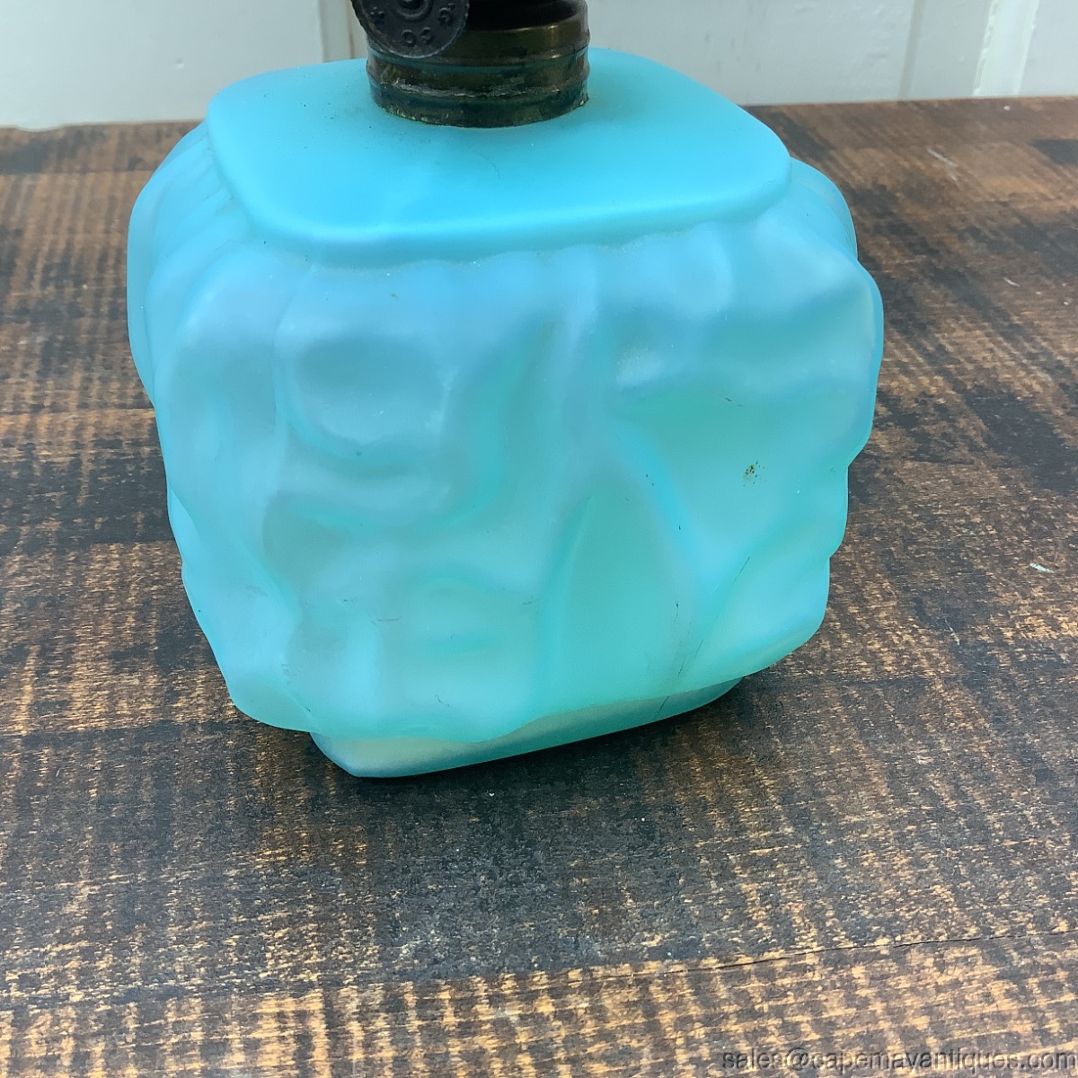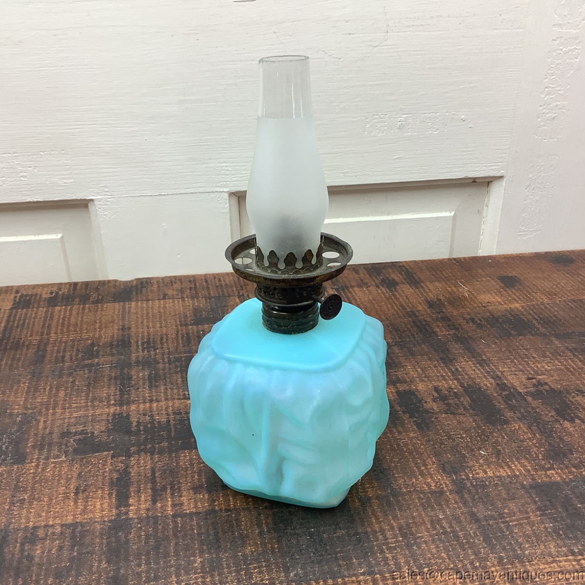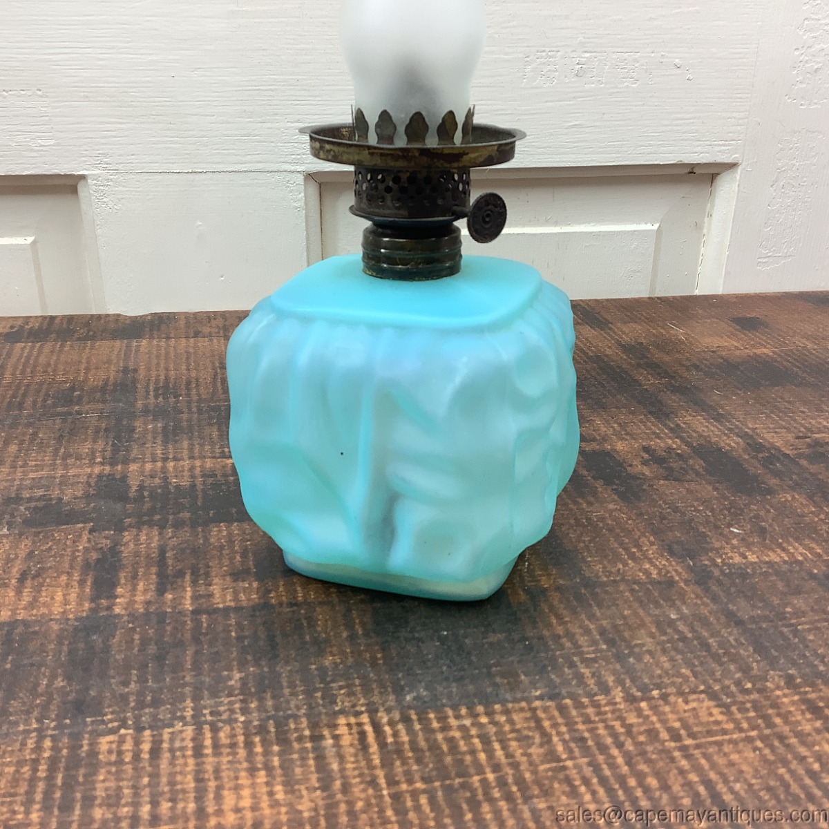Lovely powder blue Satin glass miniature oil lamp with chimney. There is no matching top or globe. The pattern is drape or petal. Base is square shaped with rounded corners. I believe it is Pittsburgh Lamp Co. The base is 8" tall to top of chimney by 3.5" wide. No chips or cracks. Shows some white material from the inside. Probably needs good cleaning. Neat old vintage or antique oil lamp.