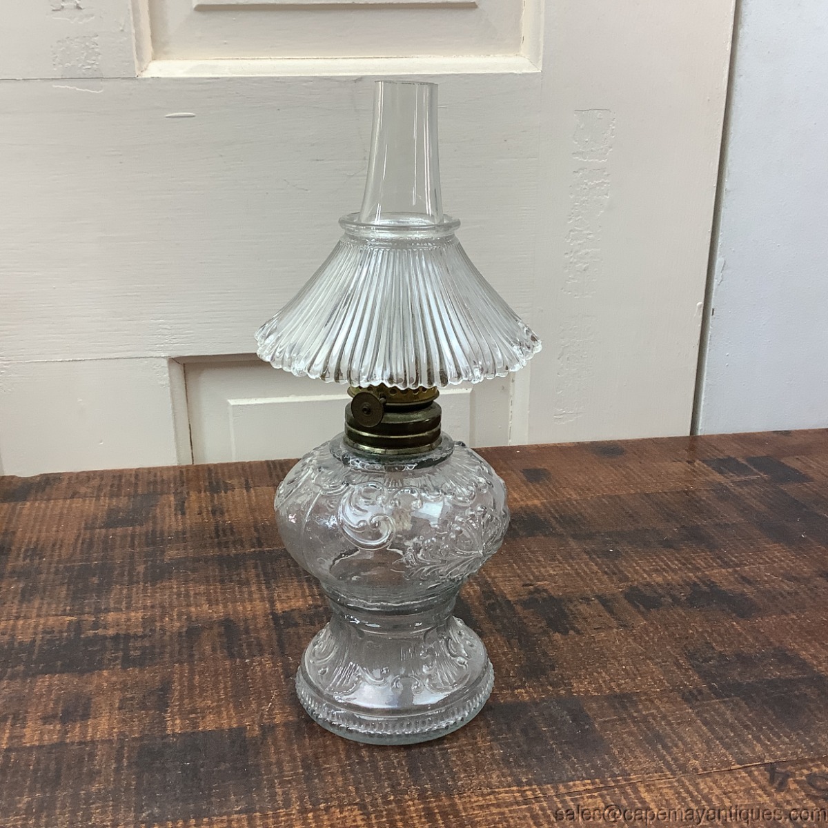 Pretty clear glass Princess Feather pattern small oil lamp or miniature oil lamp. Stands 9" tall to top of chimney and base is 3.5" wide in the mid section. I do not believe the glass shade is original. Good condition with no chips or cracks.