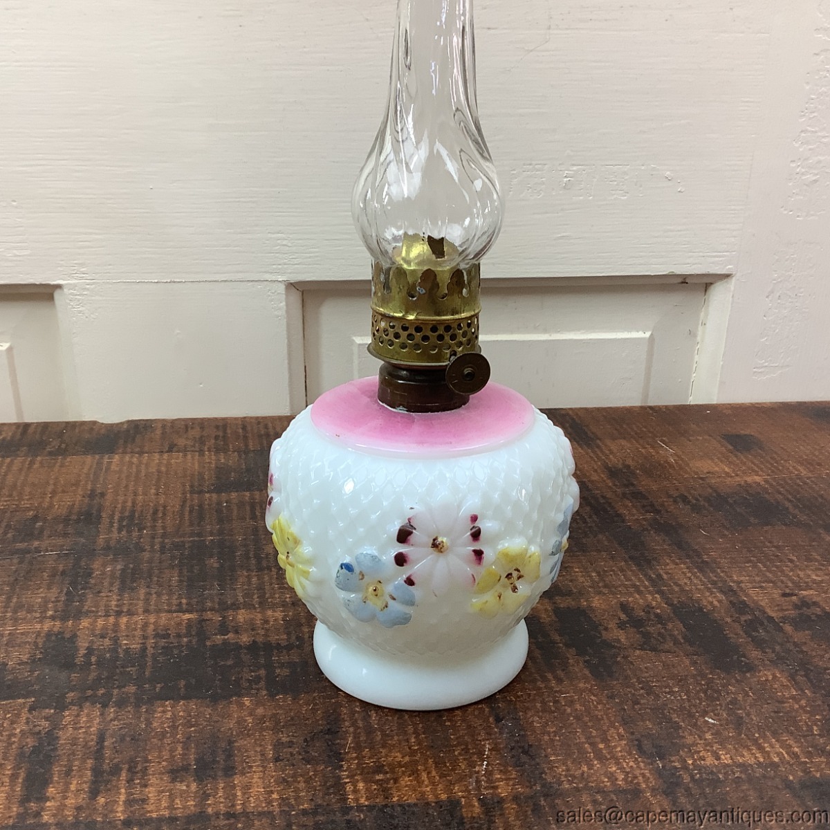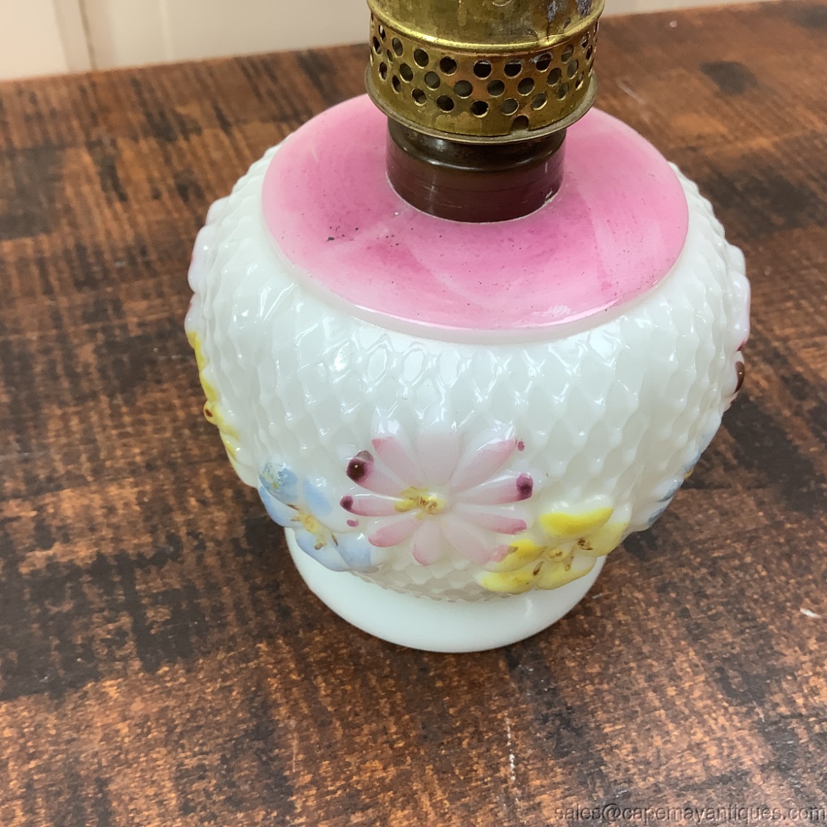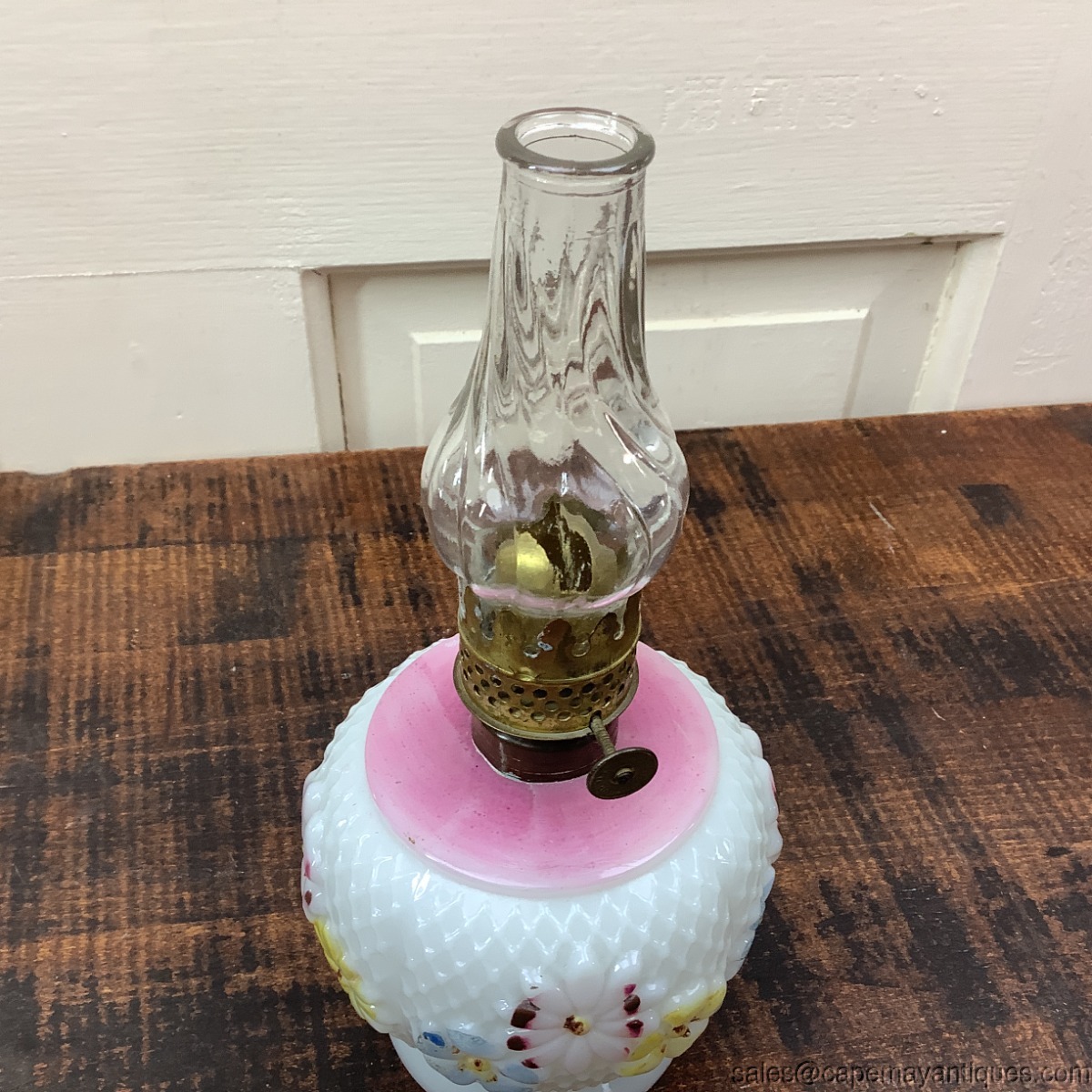 Miniature Oil Lamp White Milk Glass Painted Florals Lattice Pattern Pink Trim