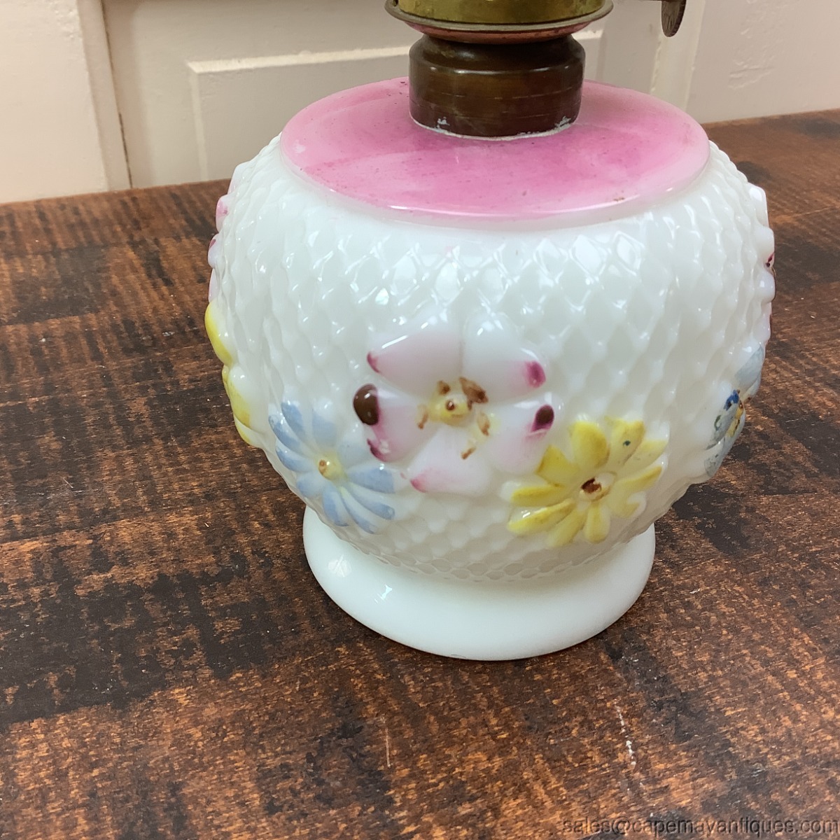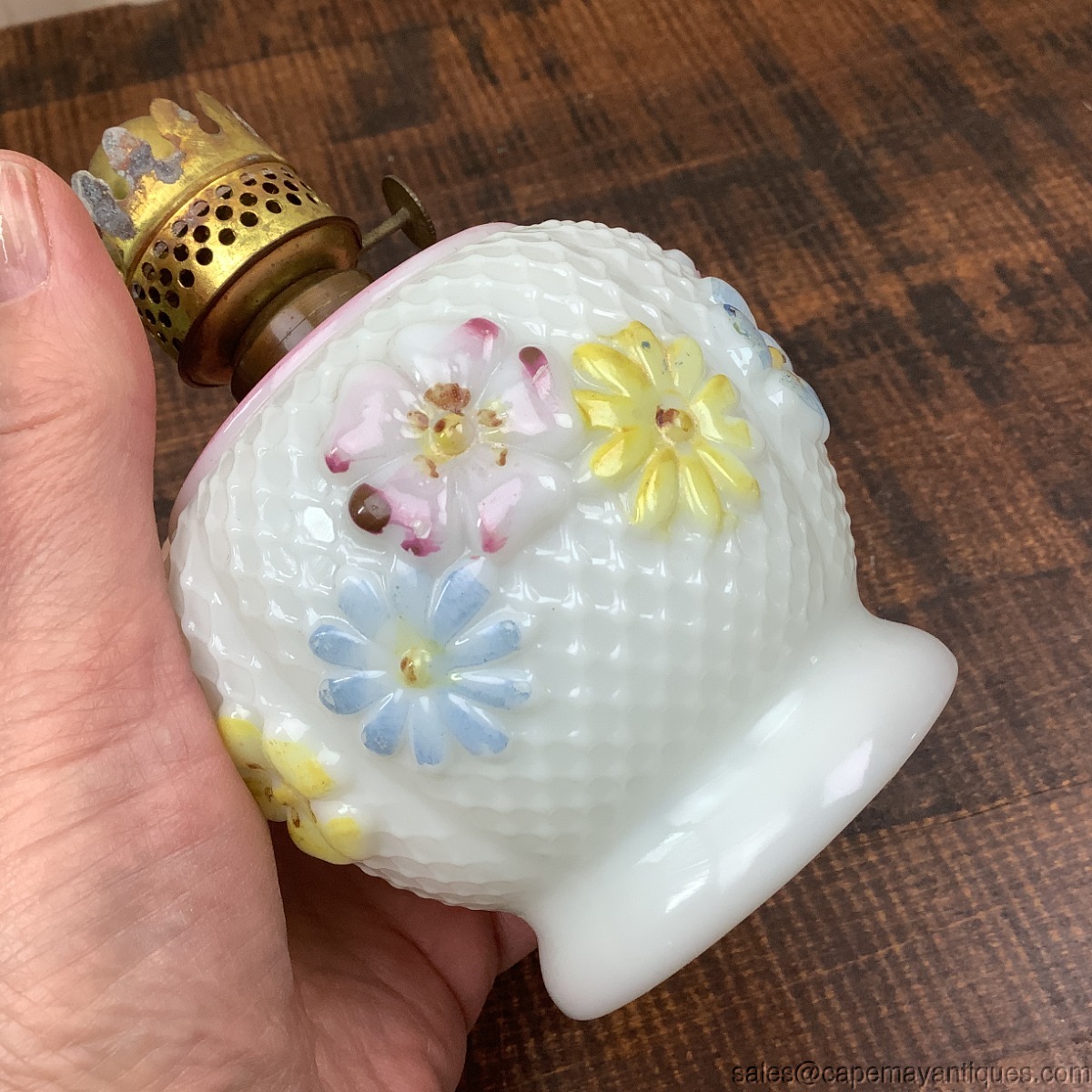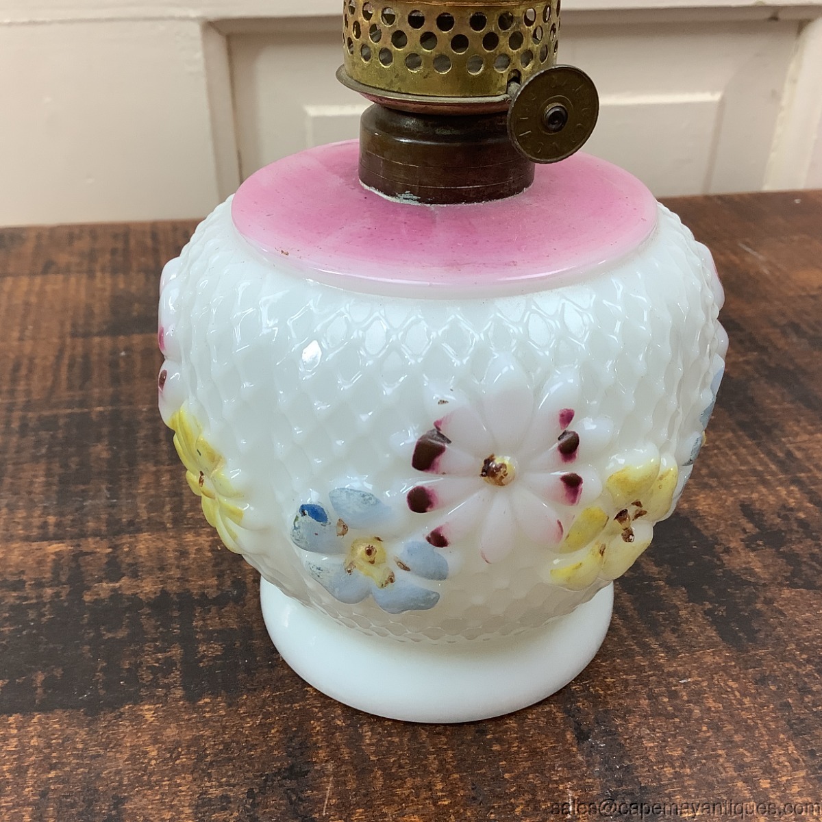 Miniature Oil Lamp White Milk Glass Painted Florals Lattice Pattern Pink Trim