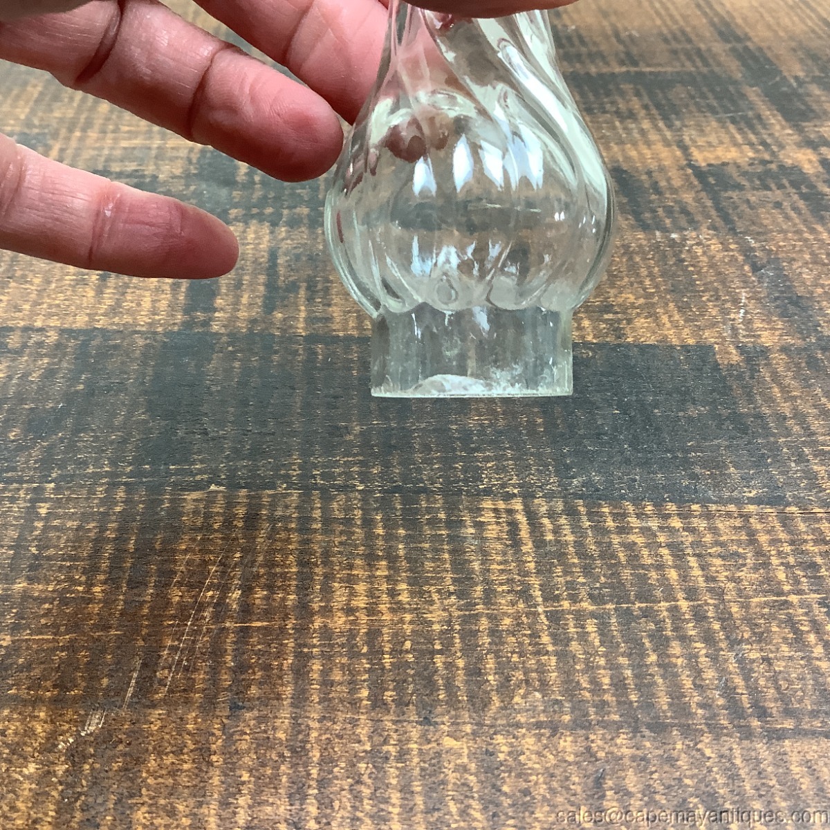 Lovely little petite oil lamp, miniature oil lamp, made of white milk glass and highly decorated with pink flash trim at the top, painted flowers, (not sure if hand painted or flashed) all set on a lattice relief pattern. The chimney is clear fluted glass. The lamp is 8" tall to top of chimney. The base is 4" wide. Good condition with no damage to the milk glass. Chimney is good too with tiniest fleck chips on the base from mfg.