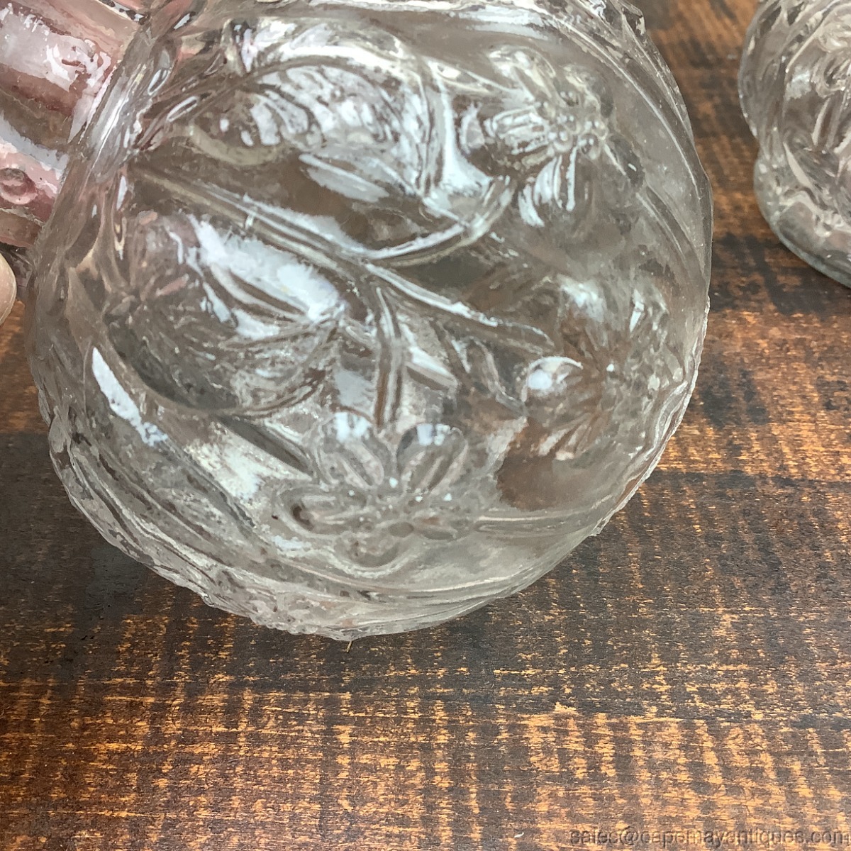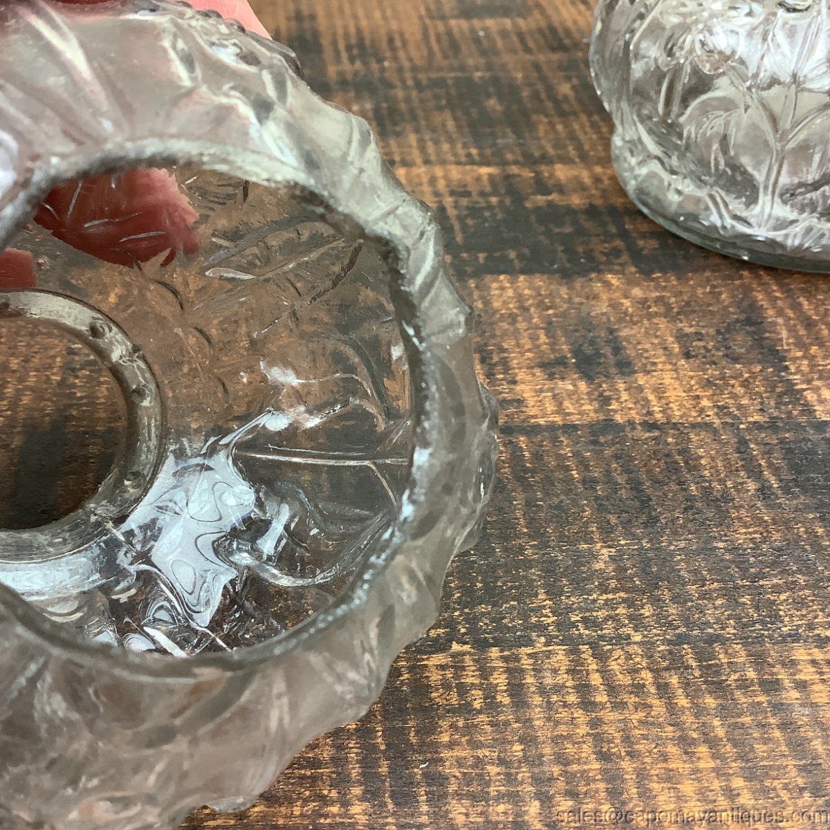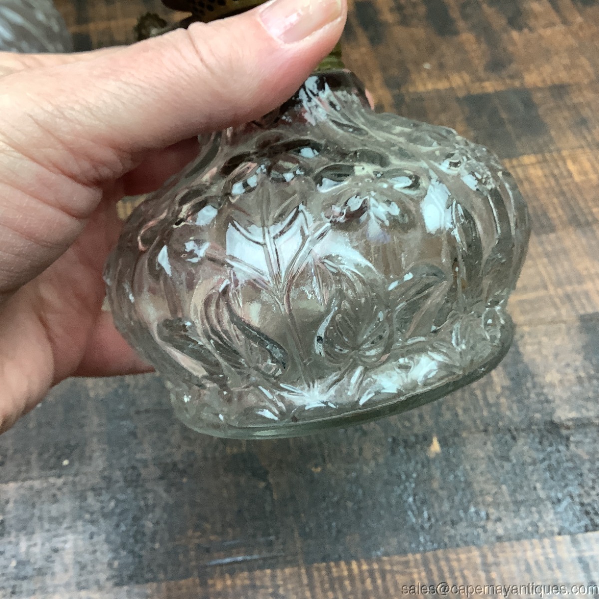 Gorgeous Plume & Atwood clear glass miniature oil lamp with shade, no chimney. The oil lamp stands 8" tall to top of glass shade and is about 4" wide. Pretty ornate EAPG pattern featuring raised single flowers with fluted design. The top globe/shade has some damage with small chips where it sits in the base of the lamp and the top rim of the globe has some uneven, flea bite and larger imperfections. They are not chips and most likely from mold. ie. uneven edges etc. Gorgeous antique oil lamp!