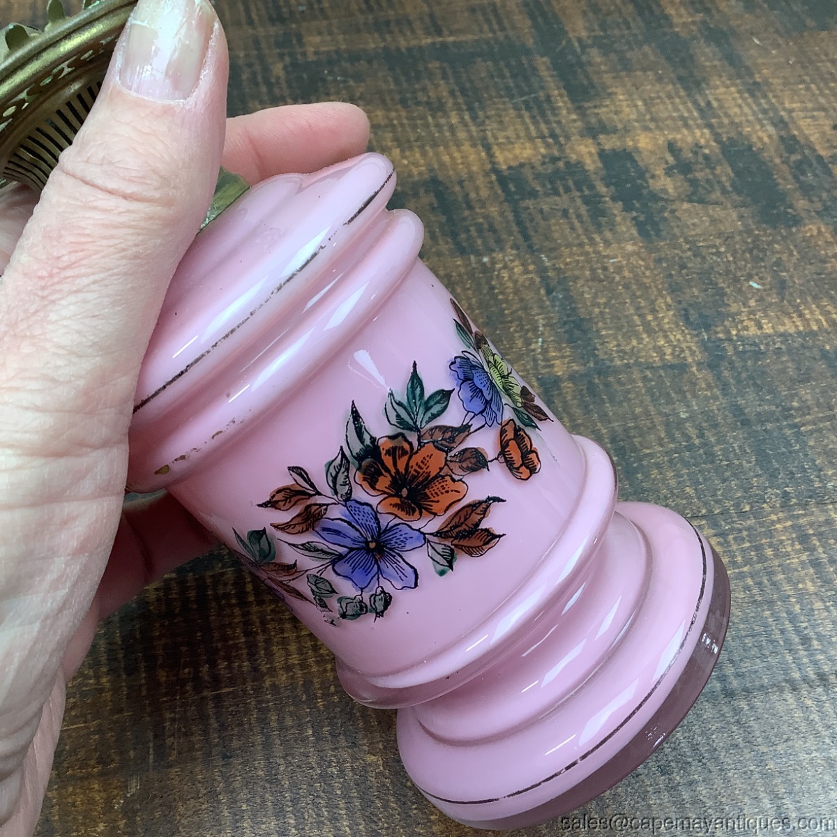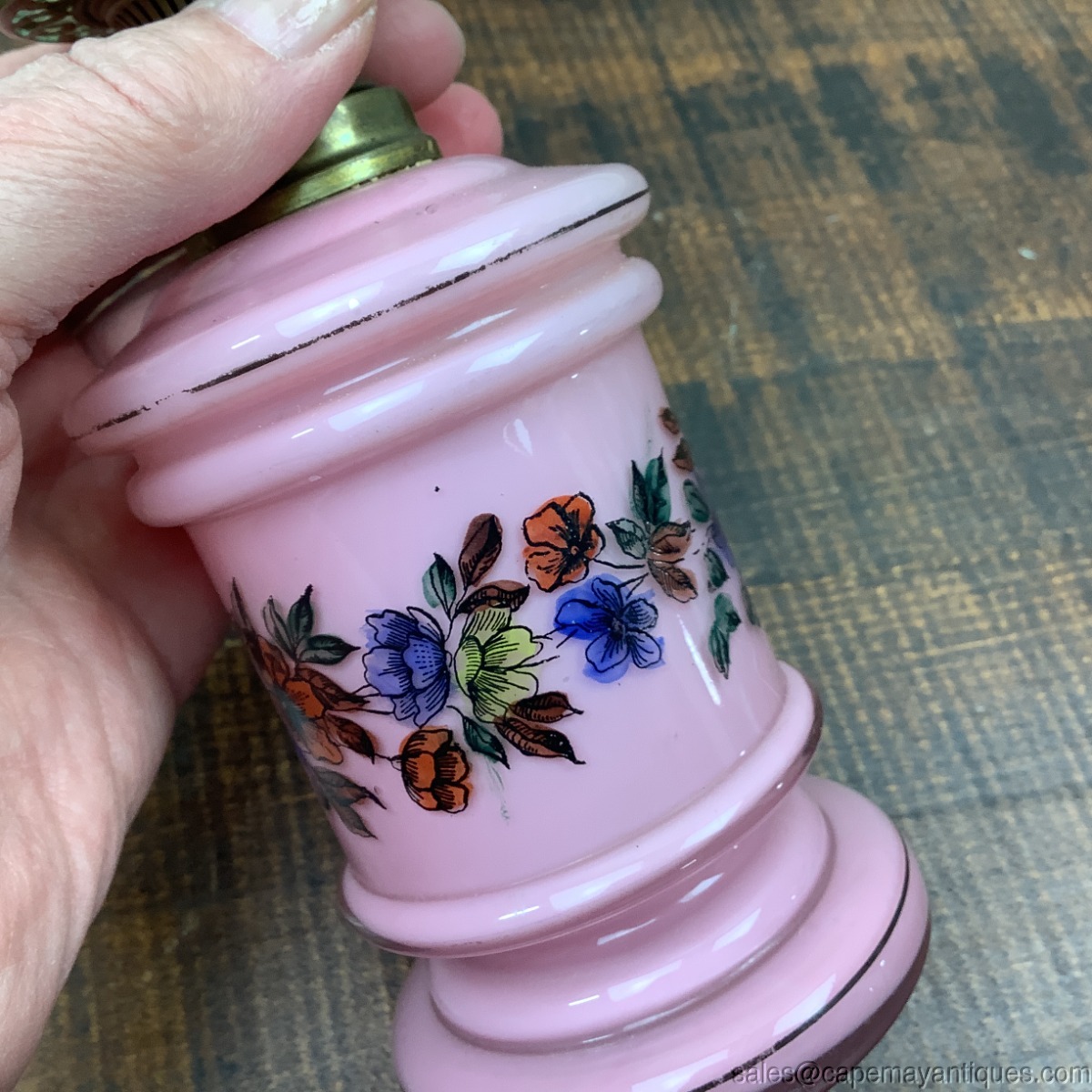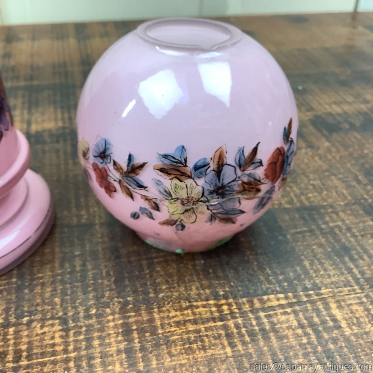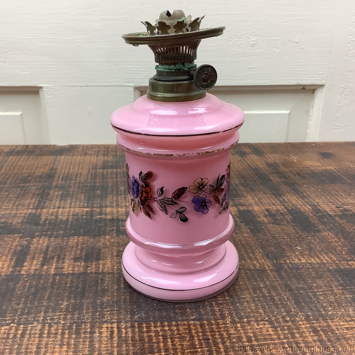 Globe has significant damage which is why I don't show lamp as complete. This is a pink cased glass antique Victorian era miniature oil lamp, gone with the wind style when globe is in place. The Case glass shows clear over lay. There are pretty vivid orange to blue colored flowers transfer on globe and base. The lamp base is 6" tall and with globe is 9.25' tall. The widest section is 3.5" wide. The glass base has no damage. The hardware has lots of green patina in place and it appears there is glue residue surrounding the lower ring of the hardware mechanism. The globe has a large repair, a round side section cracked and is repaired on all 3 sides as it leads to the bottom of the globe. See images.