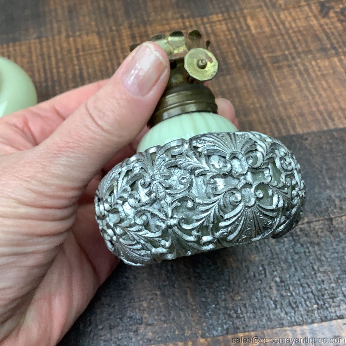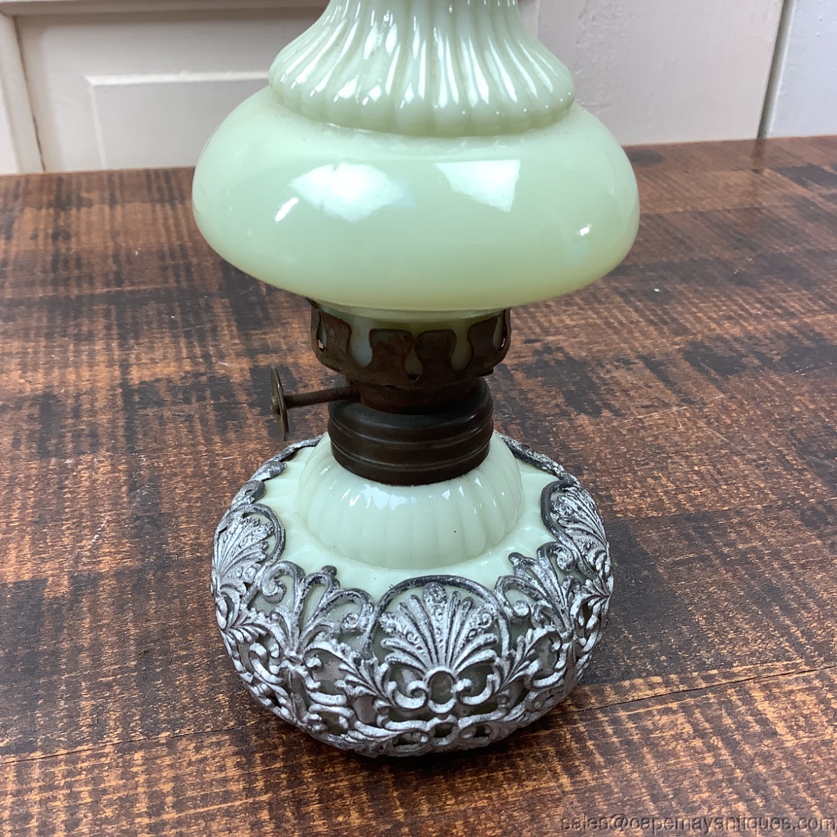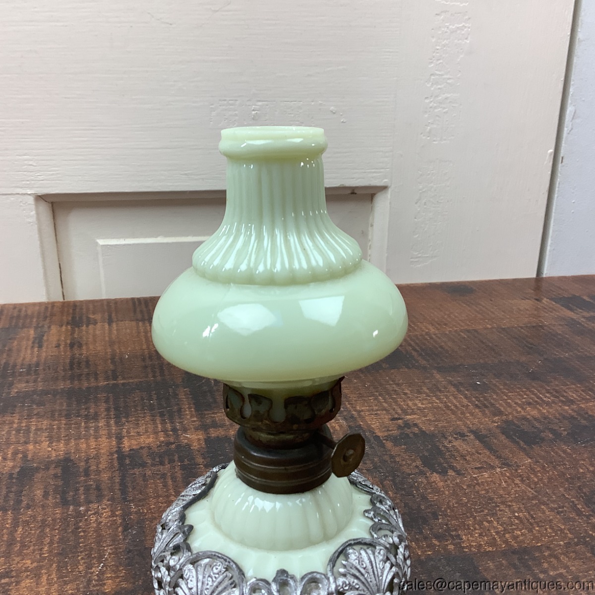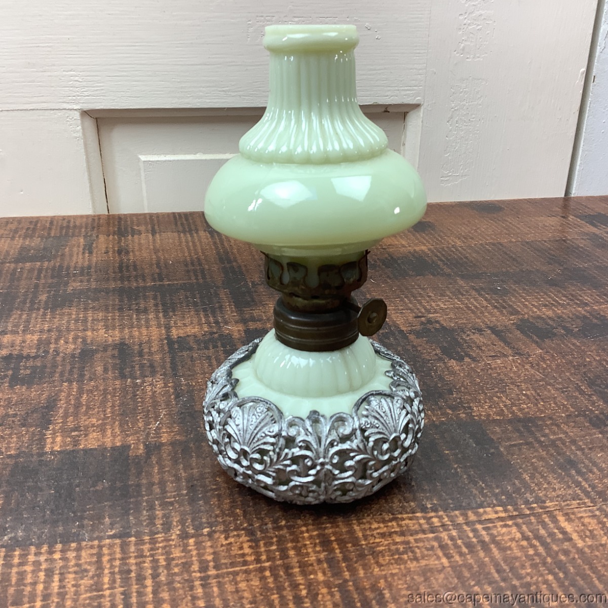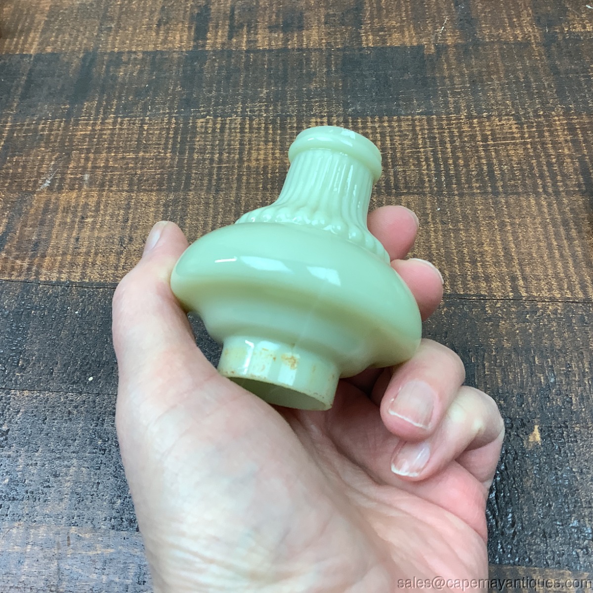 Such a pretty and unique vintage oil lamp made of yellow milk glass or custard glass. Light yellow with fluted top shade and bottom base. Custard glass, I believe. The base is encased with a silver metal material that has piercings or filigree pattern featuring fans, shell and scrollwork. Lamp is 5.5" tall and 3" wide at base. There is a small chip on the top exterior rim of shade. See images. Looks to be a small chip with extended hairline crack 1.25" length. Mostly visible at top rim area. Does not glow under black light.