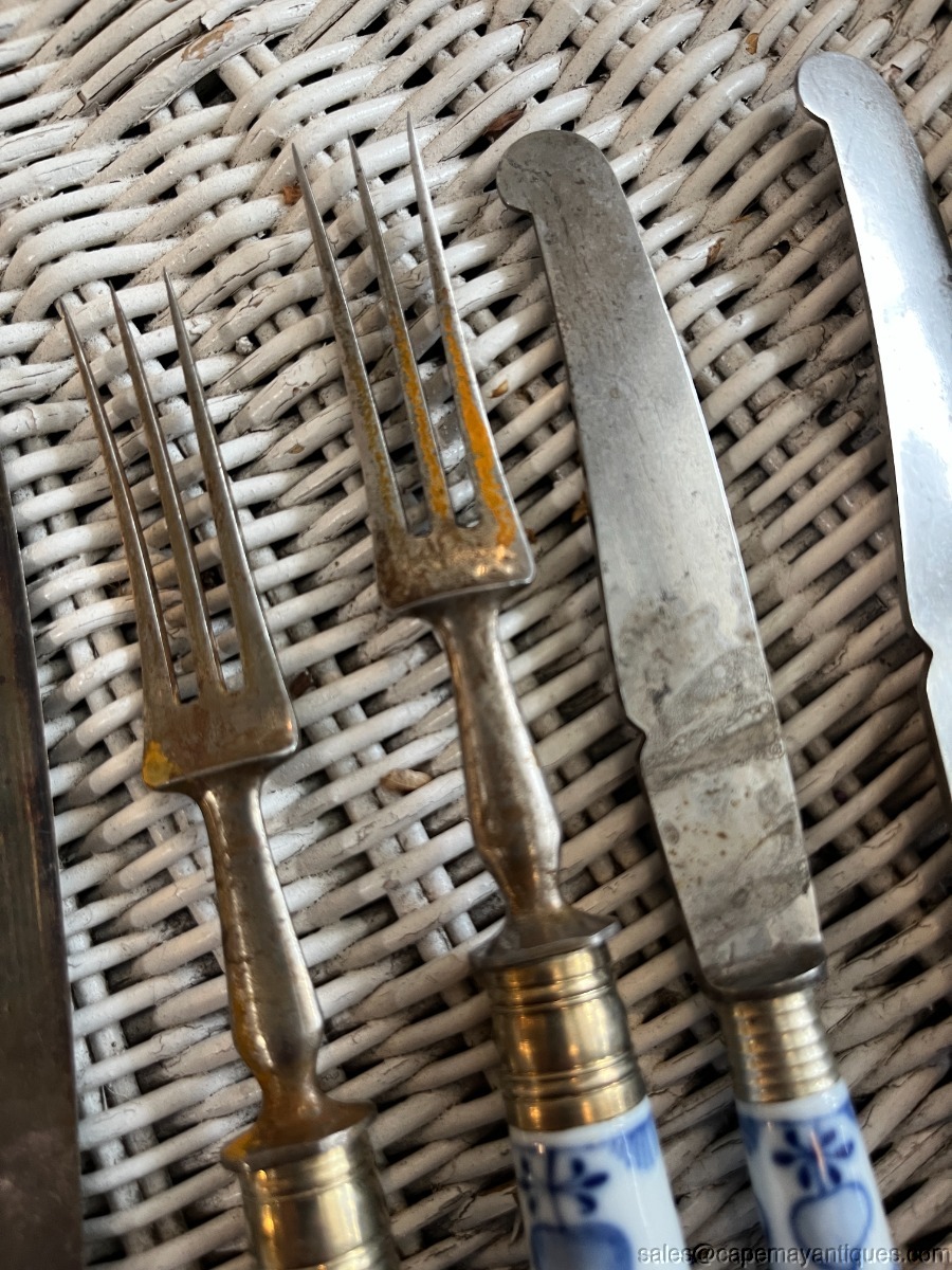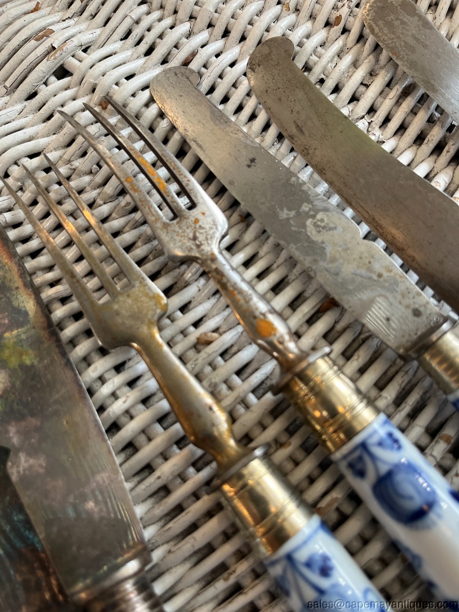 Lot of fruit knives, forks and one flat butter knife with no notch on tip. I believe the blades are steel but they are not marked. The lot includes 3 long fruit knives at 9.5" length, 2 shorter fruit knives at 7.75" length, 1 flat butter knife at 8" and 2 forks with 3 prongs 8.25" length. Porcelain handles are in good clean condition with no chips or cracks. The forks show some rust on front and backs. All pieces as shown. Gorgeous set for display or serving.