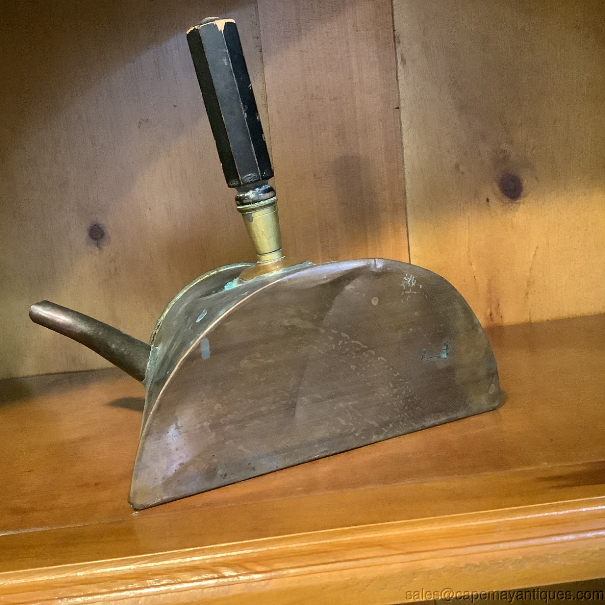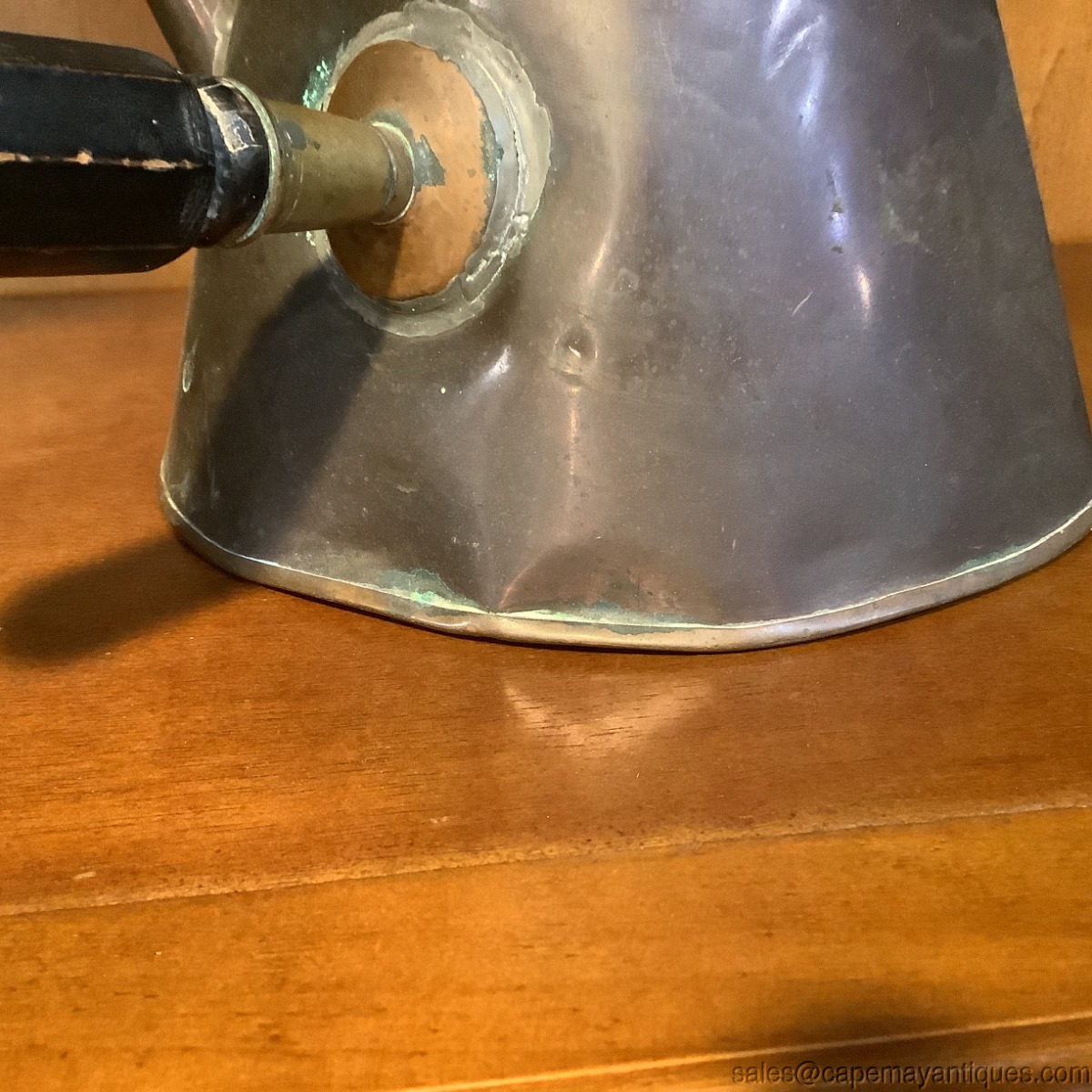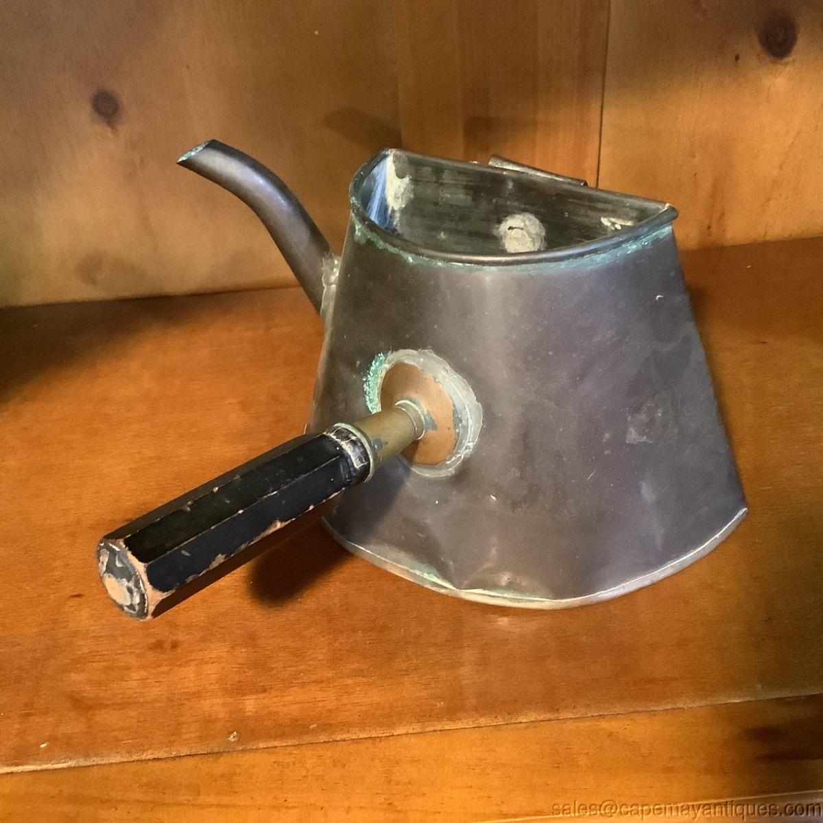 Not exactly sure if this is a wall mounted kettle or some sort or watering pot. There is a front wood handle and side spout and the back is flat with a lip for hanging on the wall. The vessel is 5" tall by 8" wide and 8" deep including the handle itself by 7.5" wide. There are some dings and dents on the bottom and sides plus I see some soldering for the spout and possible the wood handle where the backing meets the pot. Definitely used and worn but pretty old.
