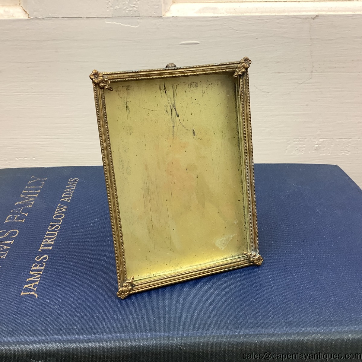 Lovely French petite standing picture or photo frame. She is just 3.5" tall by 2.75" wide overall dimensions and holds a 2.5"wide by 3.25" tall image. Lovely tiny beaded trim on the frame with all 4 corners adorned with a single flower. The image is loaded at the top of the frame that has a small knob and hinge to open and insert image from the top. There is glass present over the photo frame area as well. Good condition overall. Natural patina wear, few small marks on the very top of frame from age.
