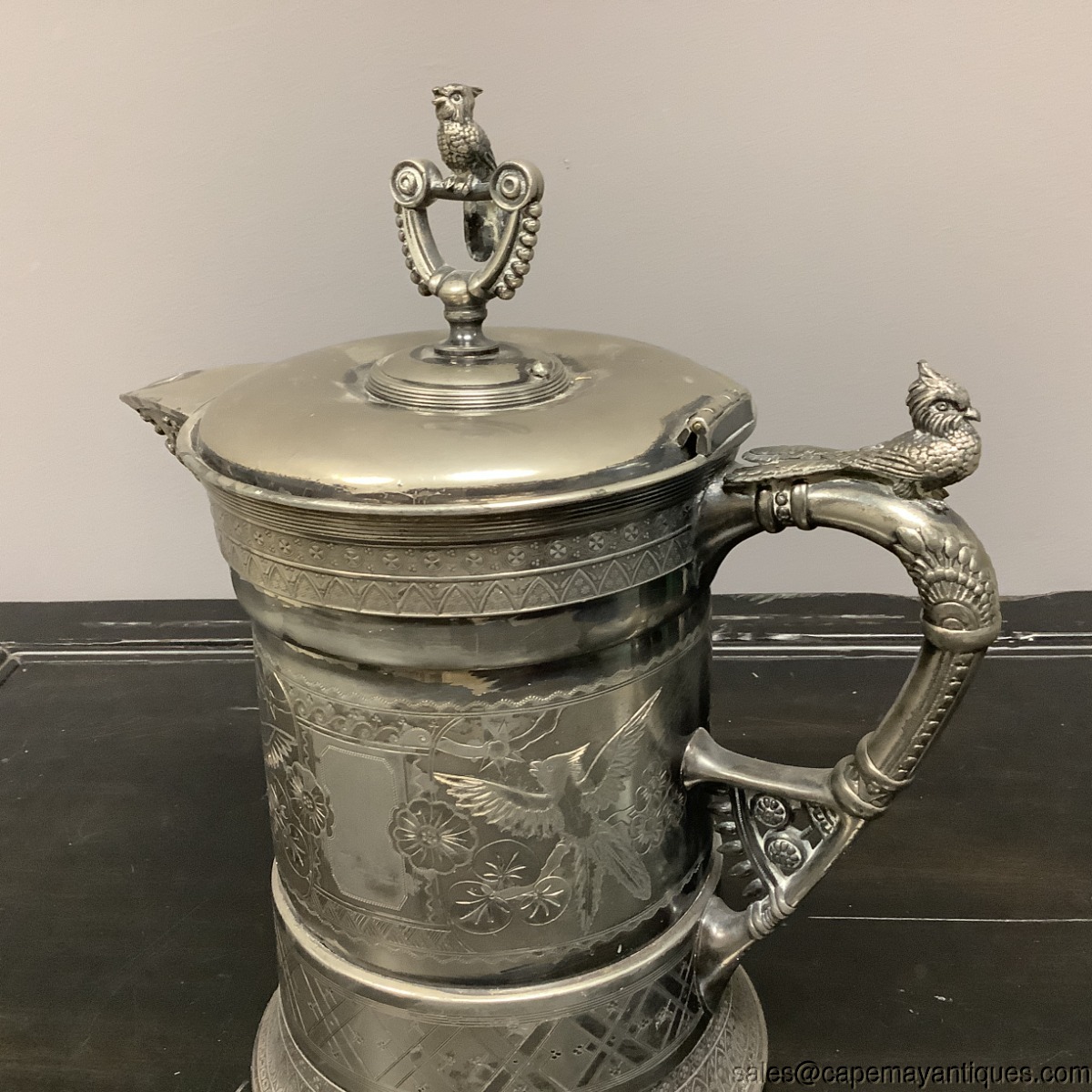 Stunning antique ceramic lined tankard, water pitcher. Victorian era, aesthetic in design featuring amazing pattern of birds and bird figures situated on finial lid, top of handle and relief design on either side of spout. White ceramic lining to keep water cool. Bottom signed Simpson Hall Miller. 14" tall by 12" wide with widest section of body without hand and spout is 7" wide. Every inch of this tankard is decorated with bird pattern or art nouveau pattern including fans, circles, flowers etc. There is a lot of peeled off silver plate, no dings or dents. See photos for missing silver plate finish. This is quadruple plate as well. Bird swinging on his perch on the finial lid. Stunning tankard, water or wine pitcher.