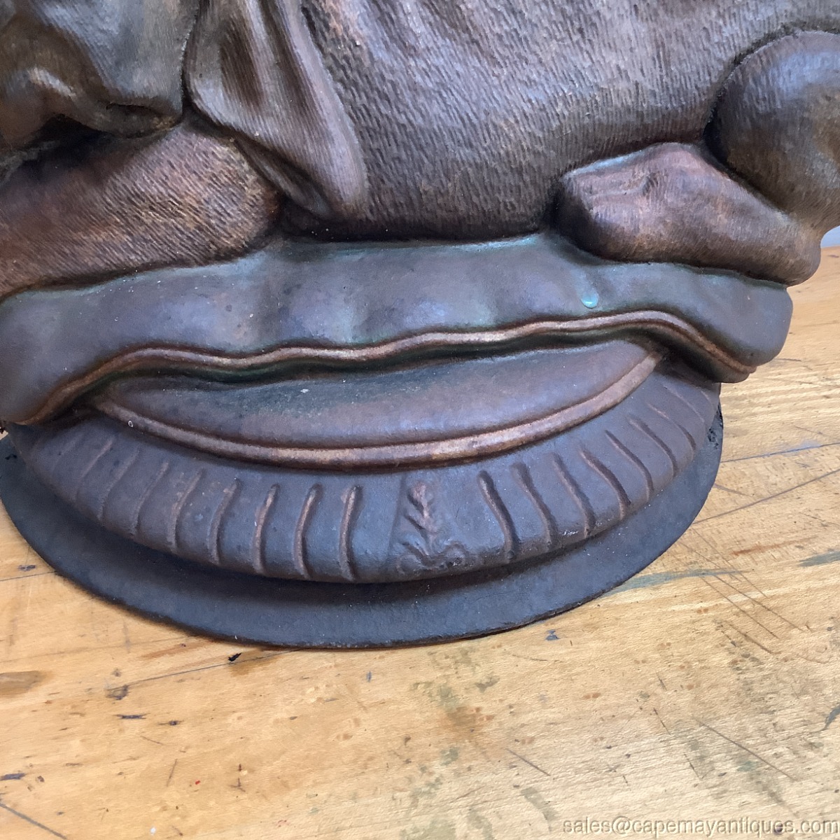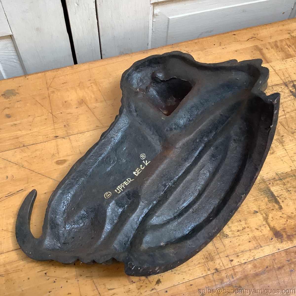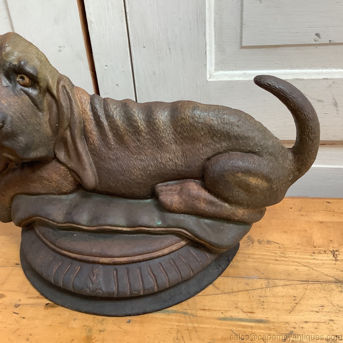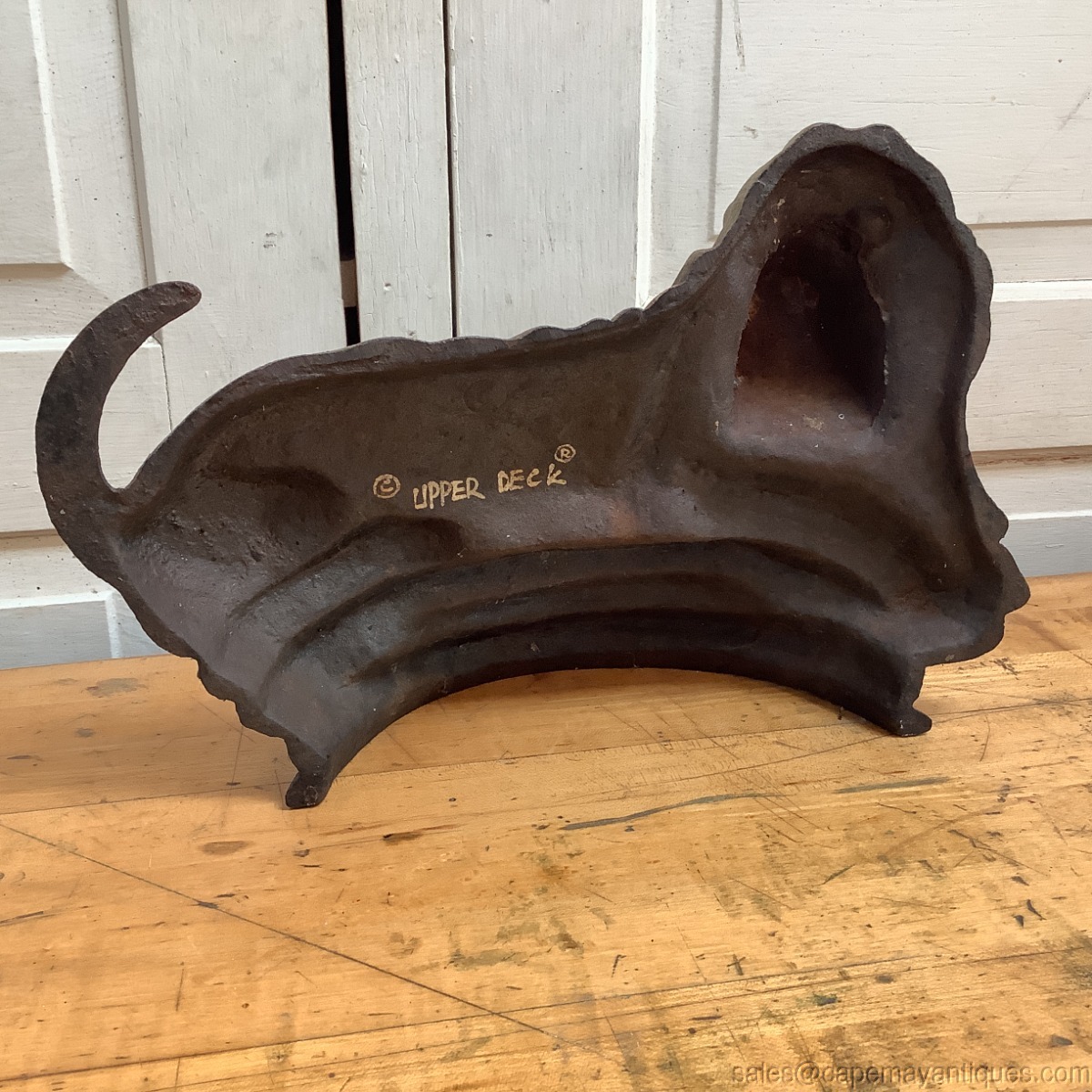 Who can resist this guy with those expressive brown eyes! Heavy cast iron doorstop weighing 7 pounds. 13" length by 9" tall. All original patina. I have seen others with brighter coloring but I love the natural aged patina of this one. Back is signed Upper Deck. Good condition with original patina.