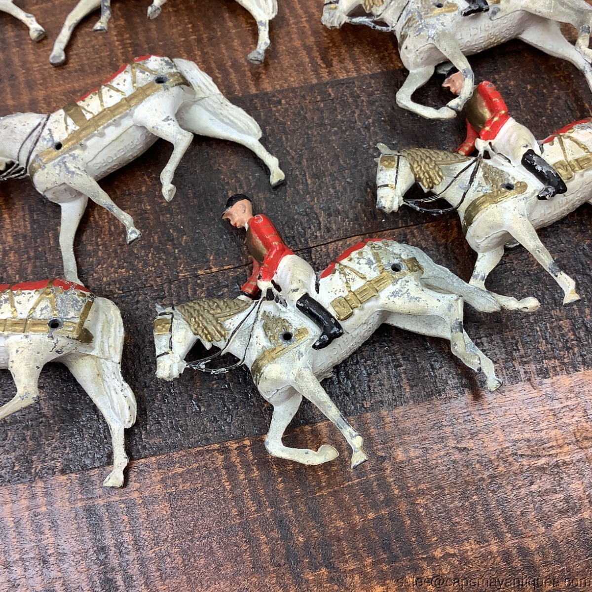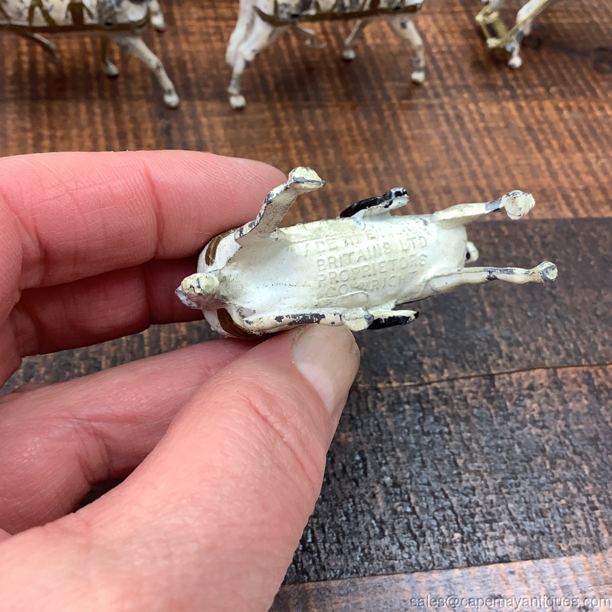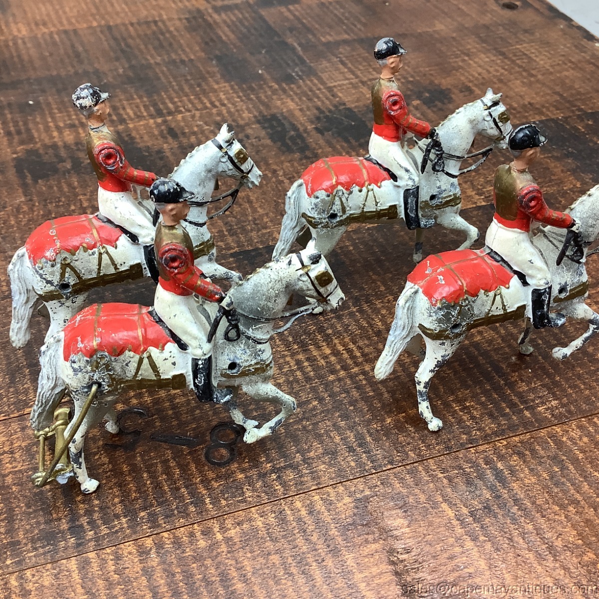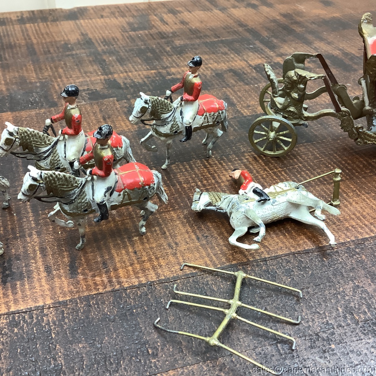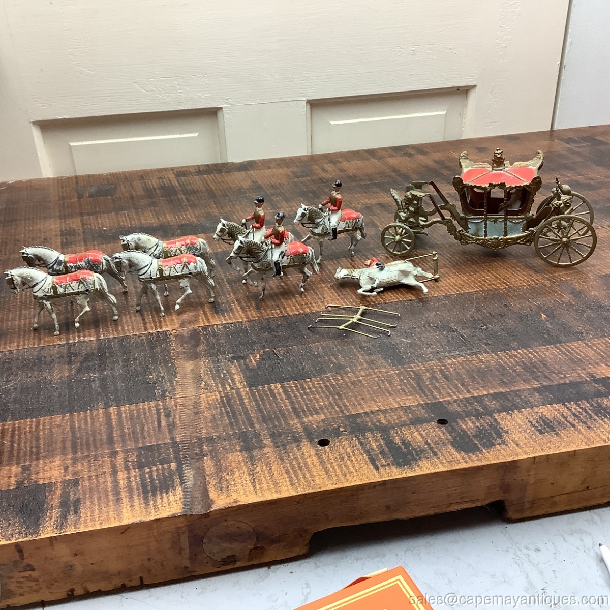 Wonderful signed Britain Ltd. vintage Elizabeth II Coronation Carriage with 8 horses of which 4 have red coat riders. The entire set is painted metal. Beautiful carriage with turquoise lower panels, red roof and gold elsewhere. The back wheels feature winged figures with torches. The front features the same winged animals with torches. Queen Elizabeth is inside with perhaps her Mother. 2 females. The carriage measures 7" length from front wheel to back wheel and is 3.5" tall to top of carriage center gold implement. Each horse is 3" tall by 3" length. All of the horses are detached and I there is missing metal sections to attach and line up in front of the carriage. Front tab of carriage may be broken off not allow full attachment. Chipped paint on all horses Each figure has holes in front and back to attach the metal horse harness of which we only have a few pieces. Great for parts or full repair.