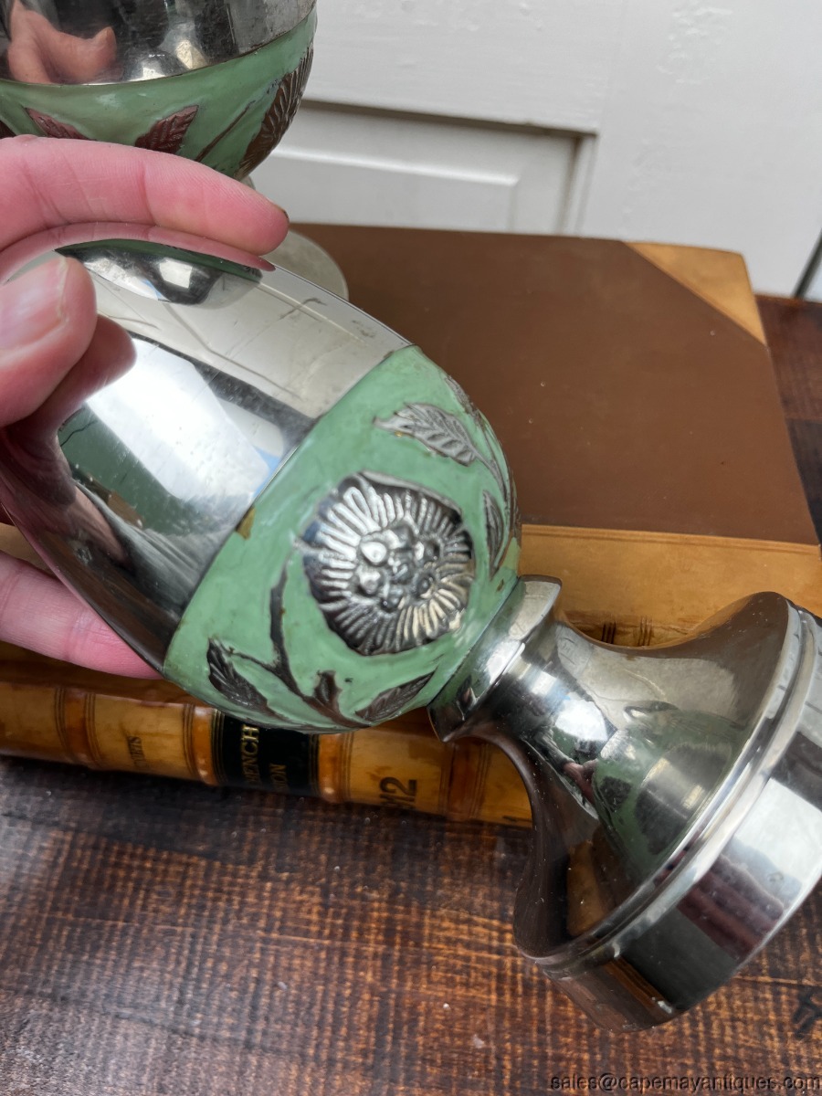 Lovely decorative egg shaped finials or table top decor, mounted egg design. The bottom of egg shapes have a wide green band of flowers and leaves. Minor chipping of the green color, see photos. Overall, set is in good condition with no dings or dents. Few minor marks or scratch lines on one side but so very hard to notice. These are 7.5" tall and their bases are 3.5" wide. One has felt cover and the other one is missing felt cover on base bottom.
